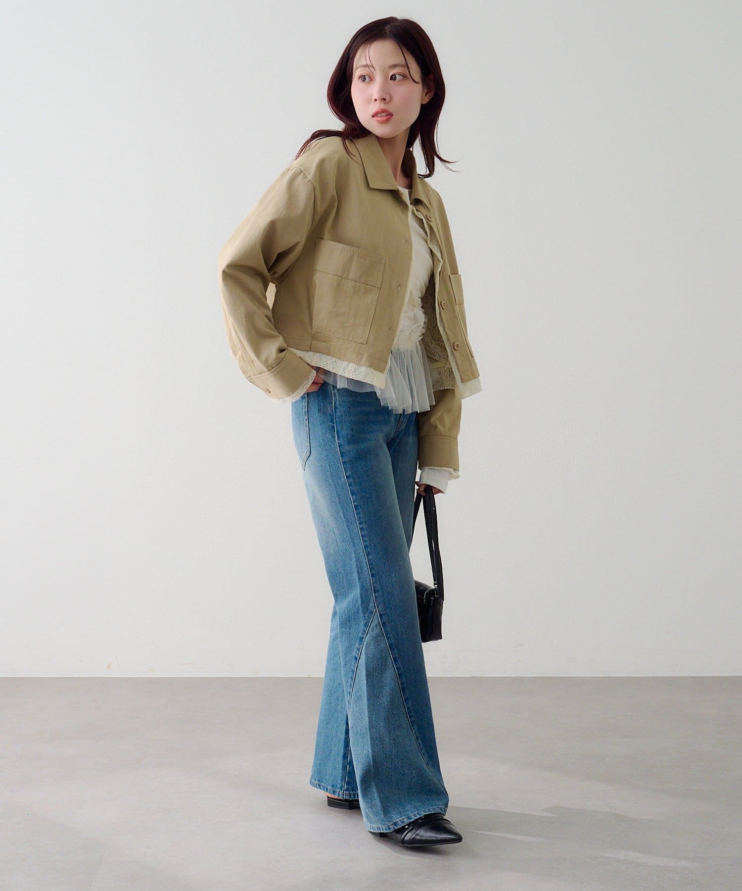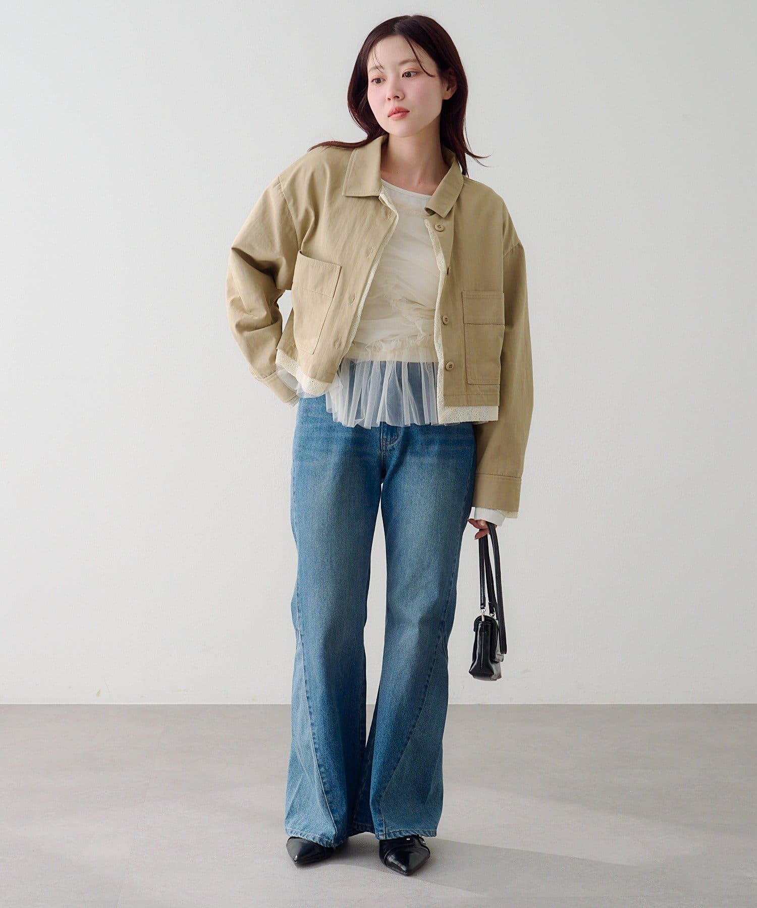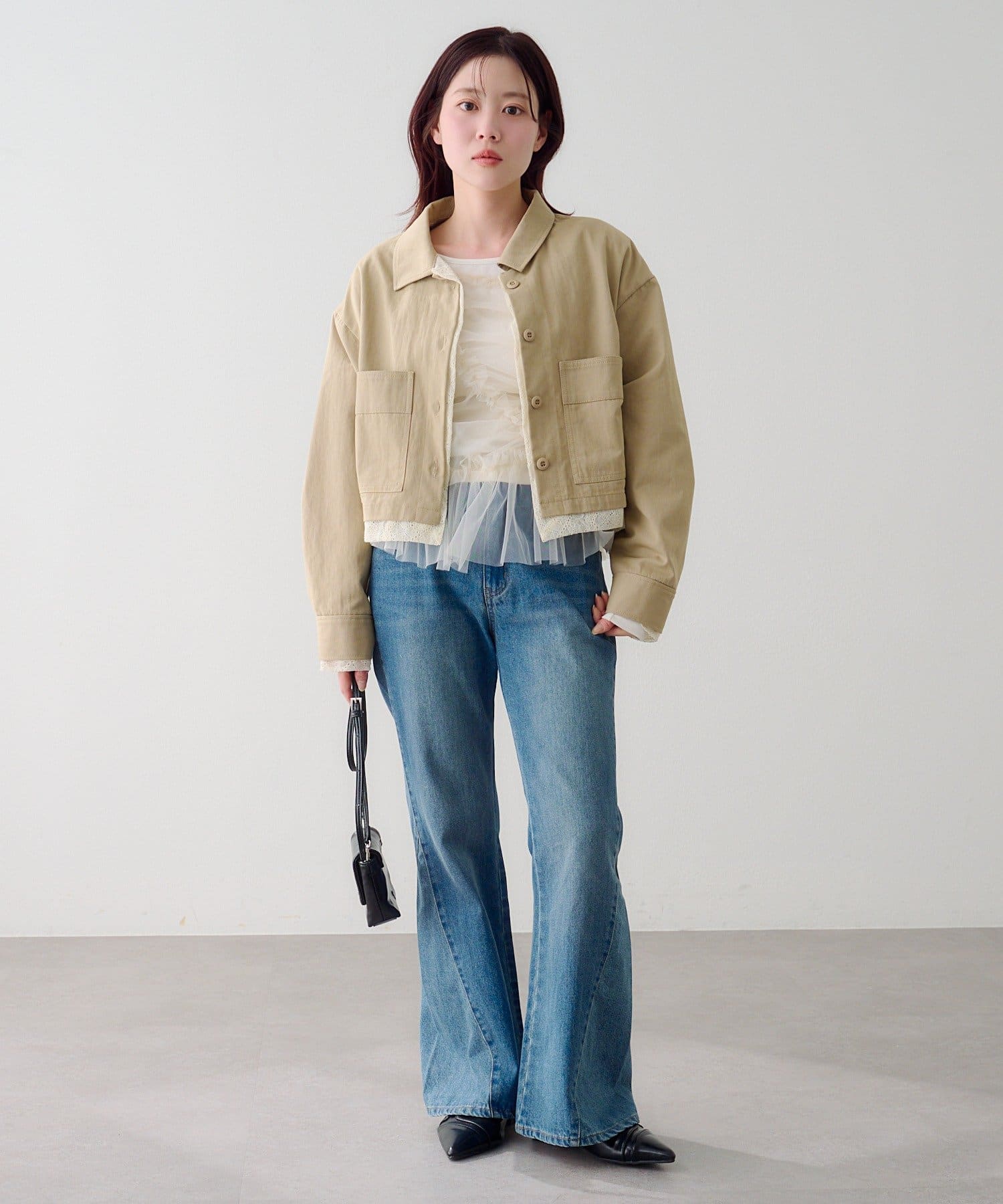 ショート丈はボリューム感のあるボトムともバランス良く着ていただけます。