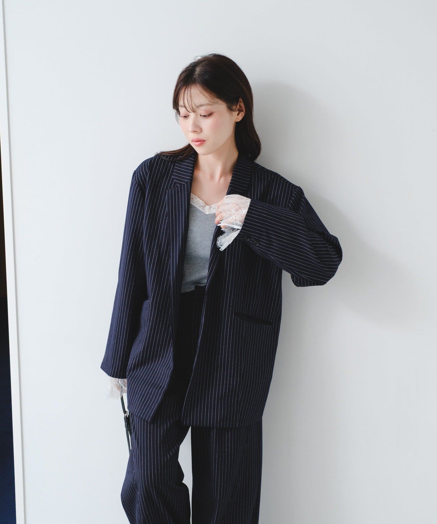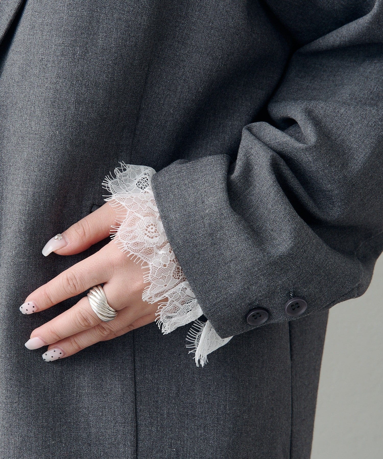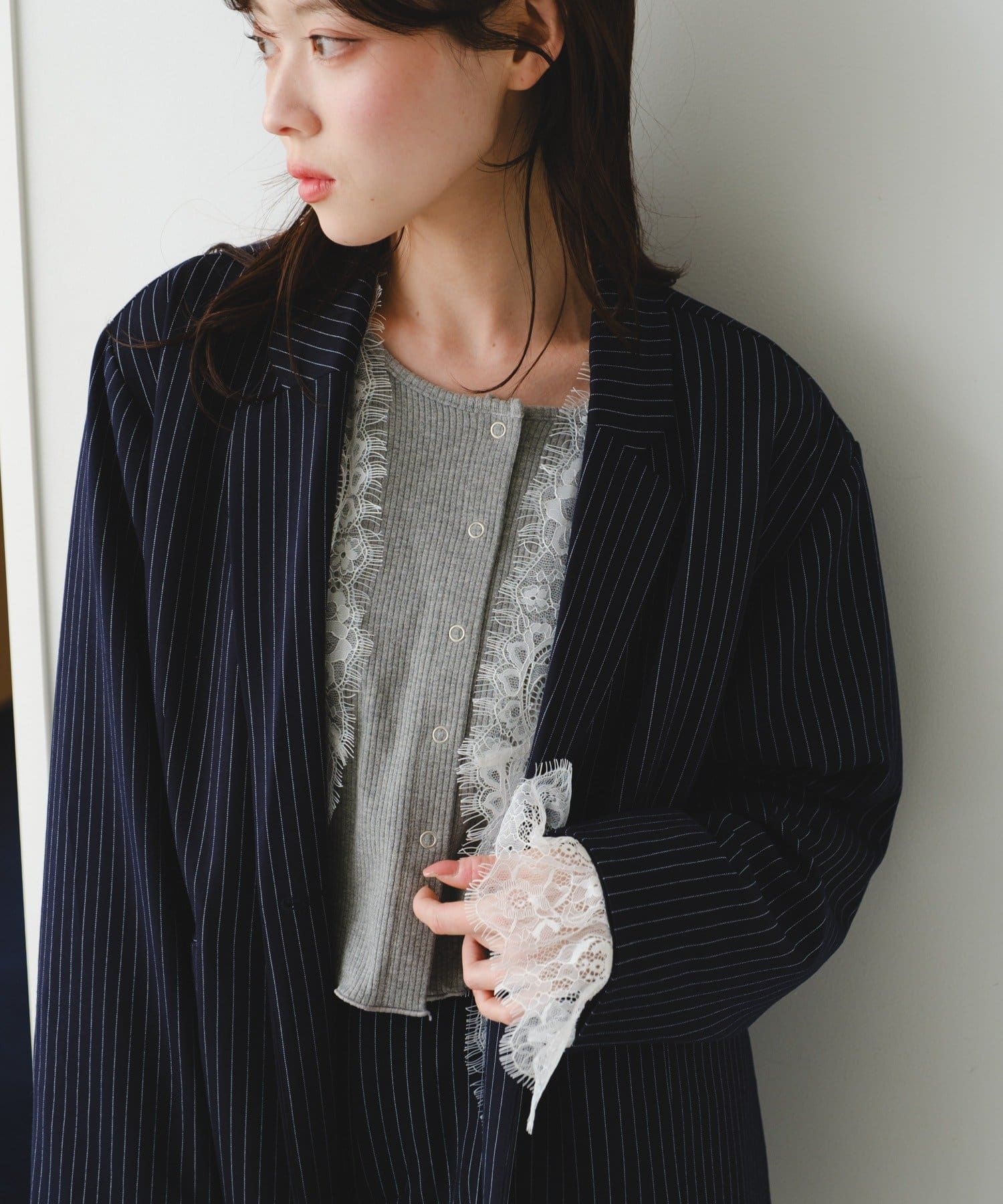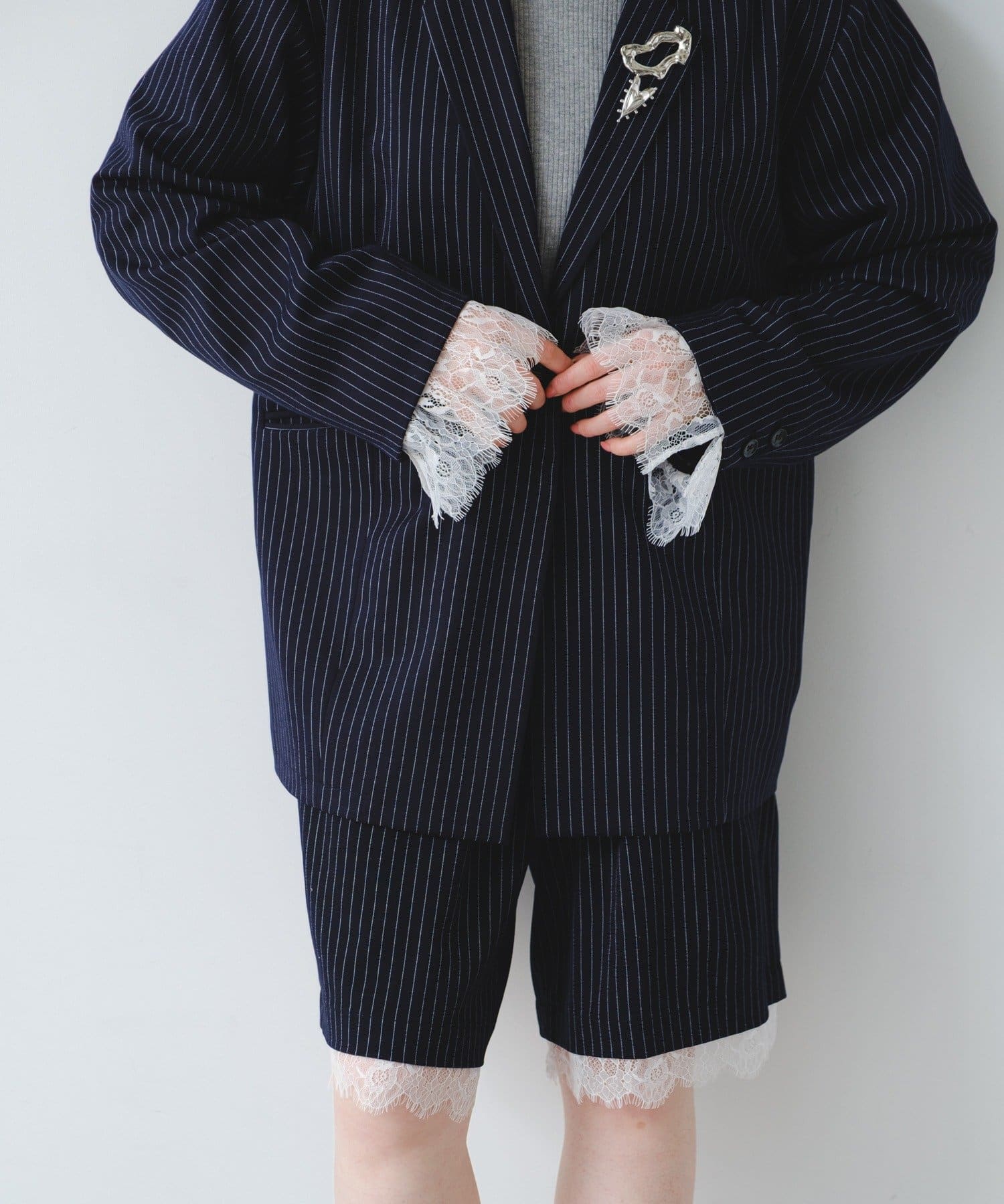 袖のレースは取り外し可能で、フェミニンにもマニッシュにも表情を変えられるデザインです。