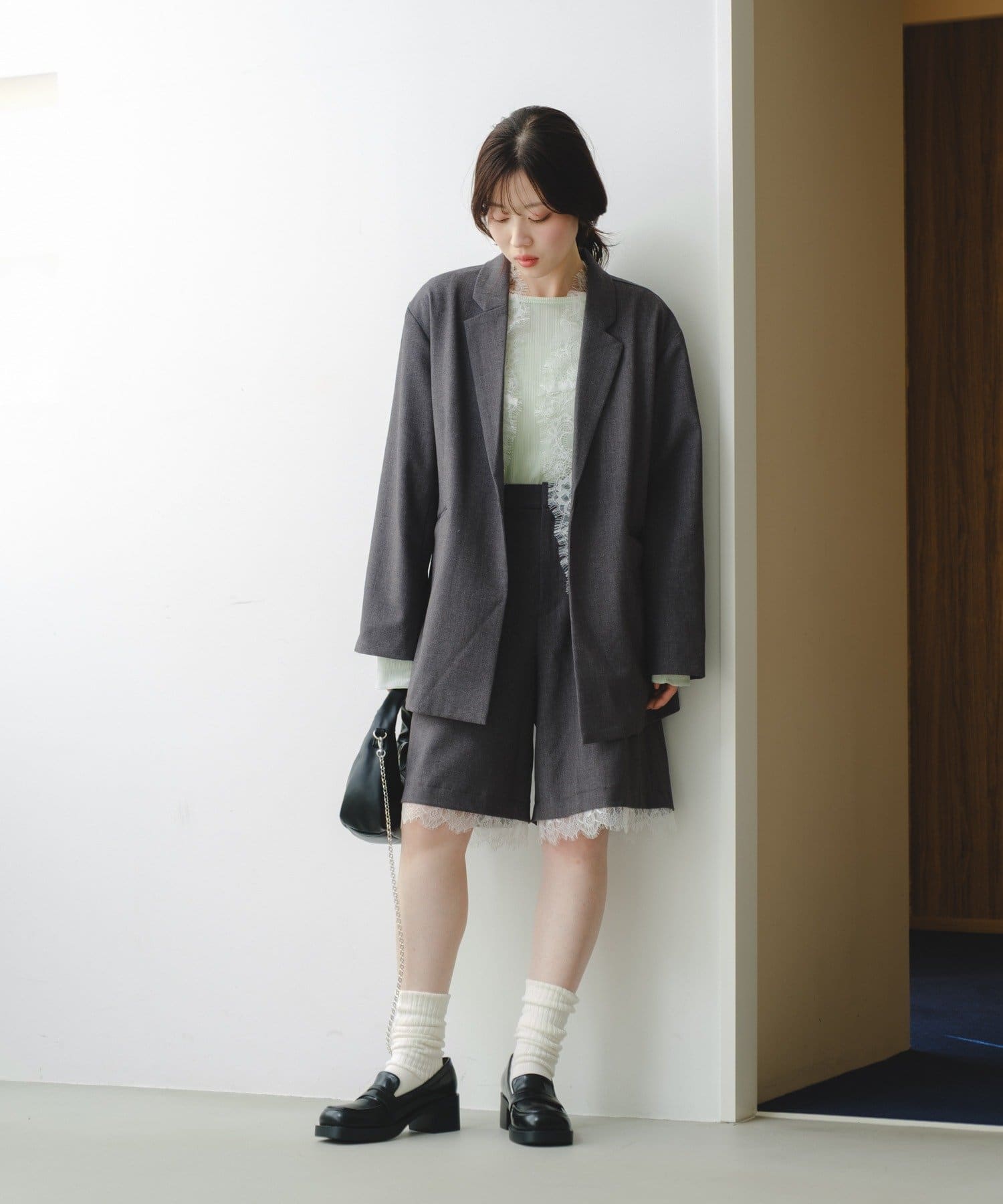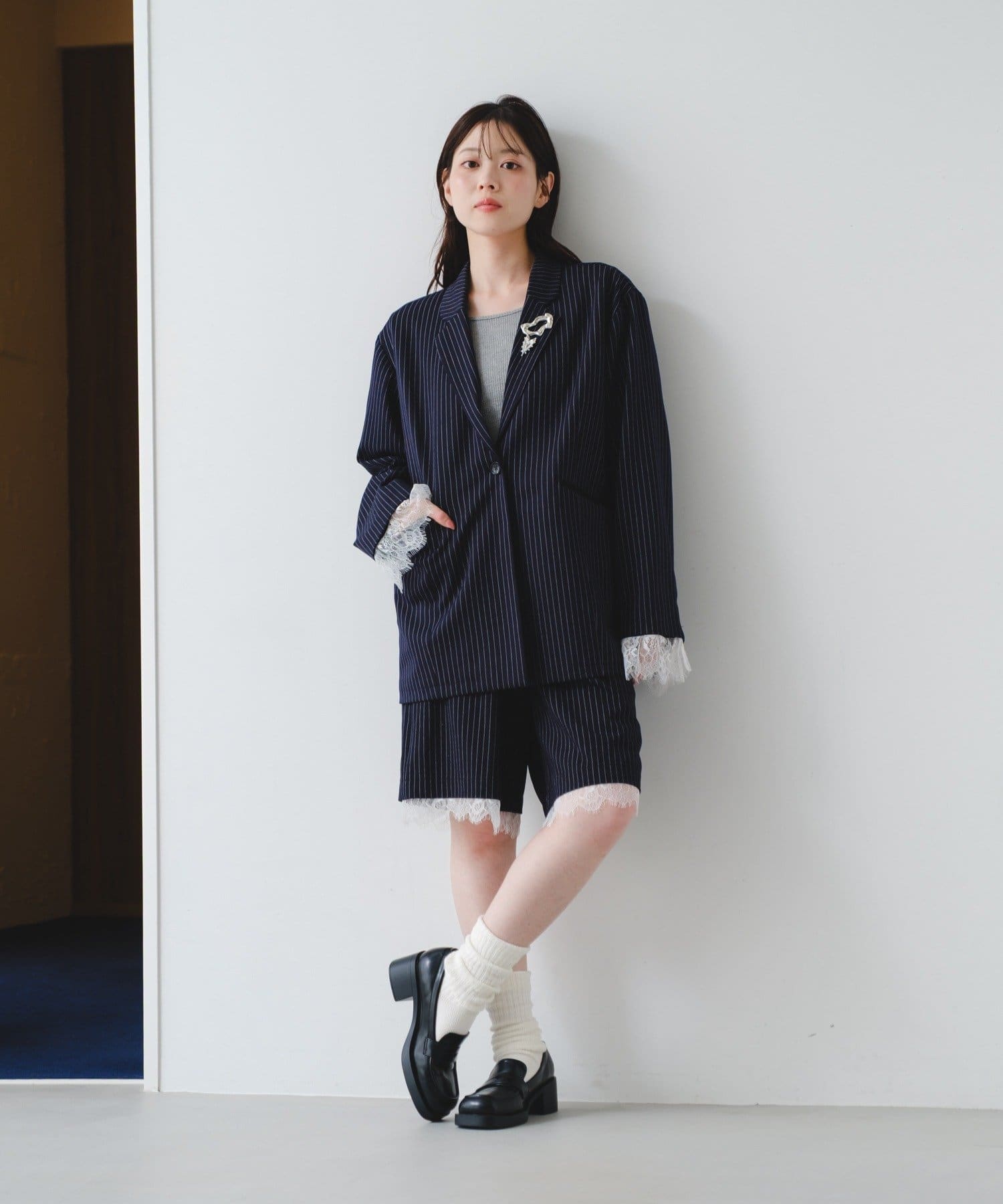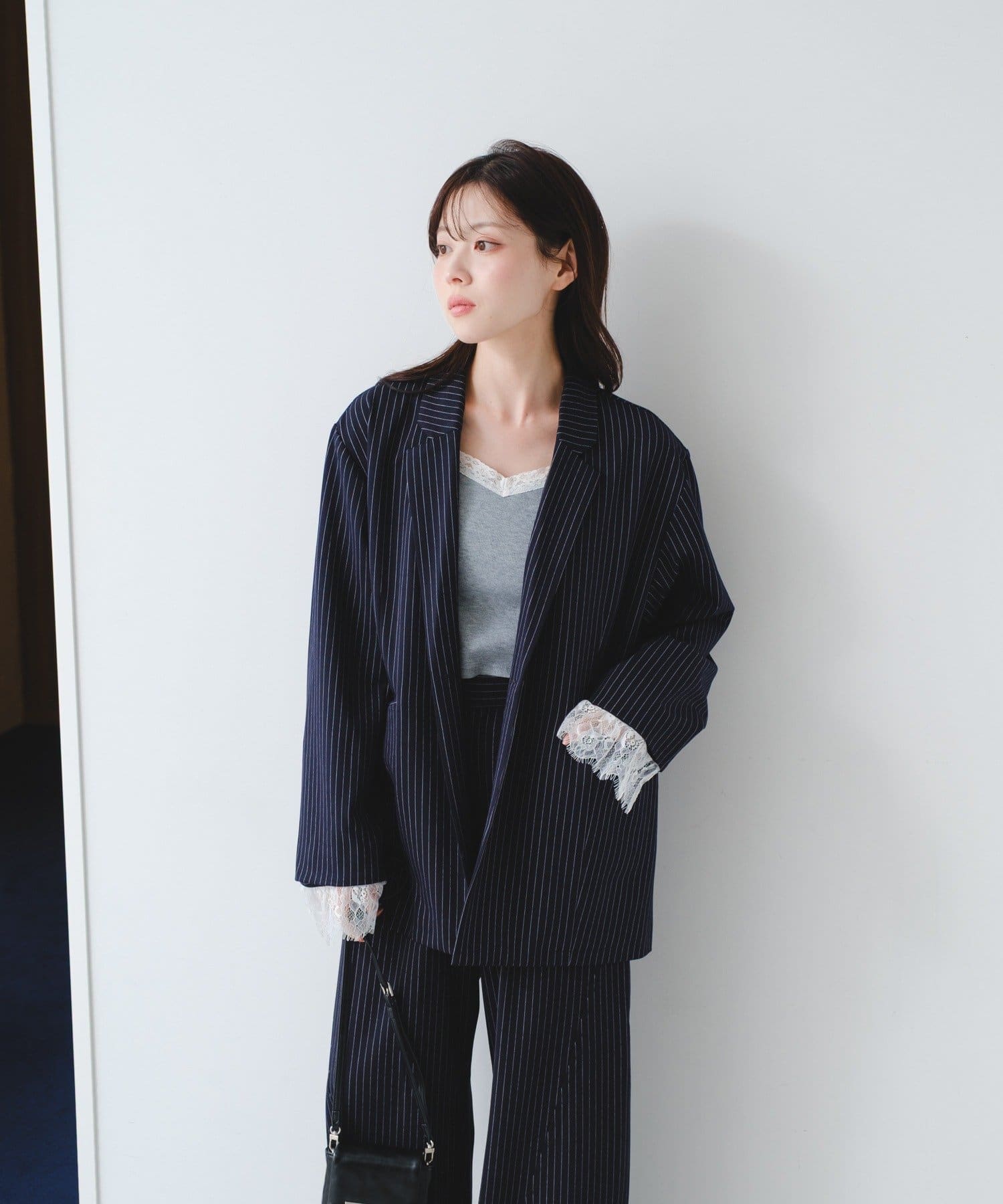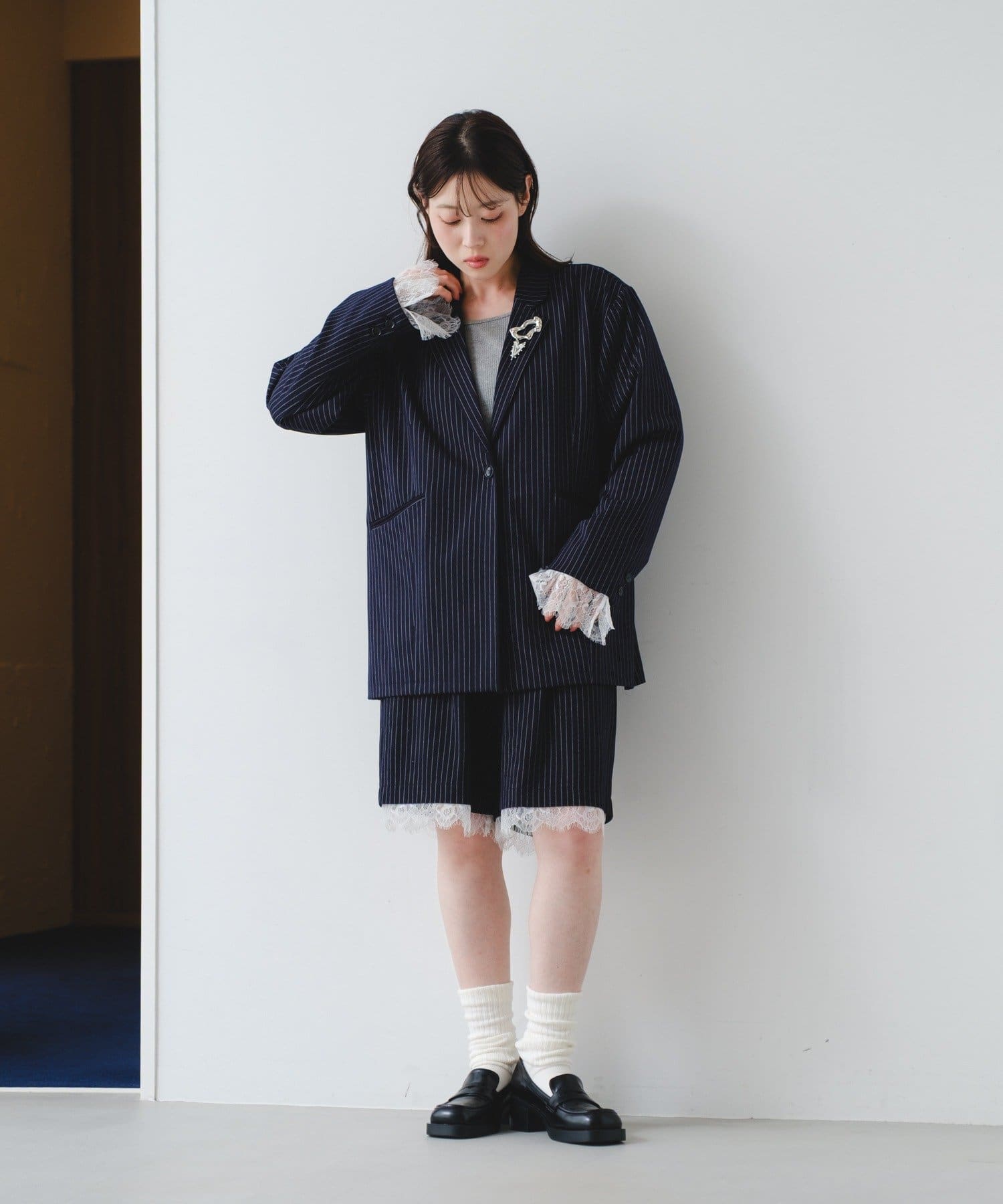 袖のレースは取り外し可能で、フェミニンにもマニッシュにも表情を変えられるデザインです。
