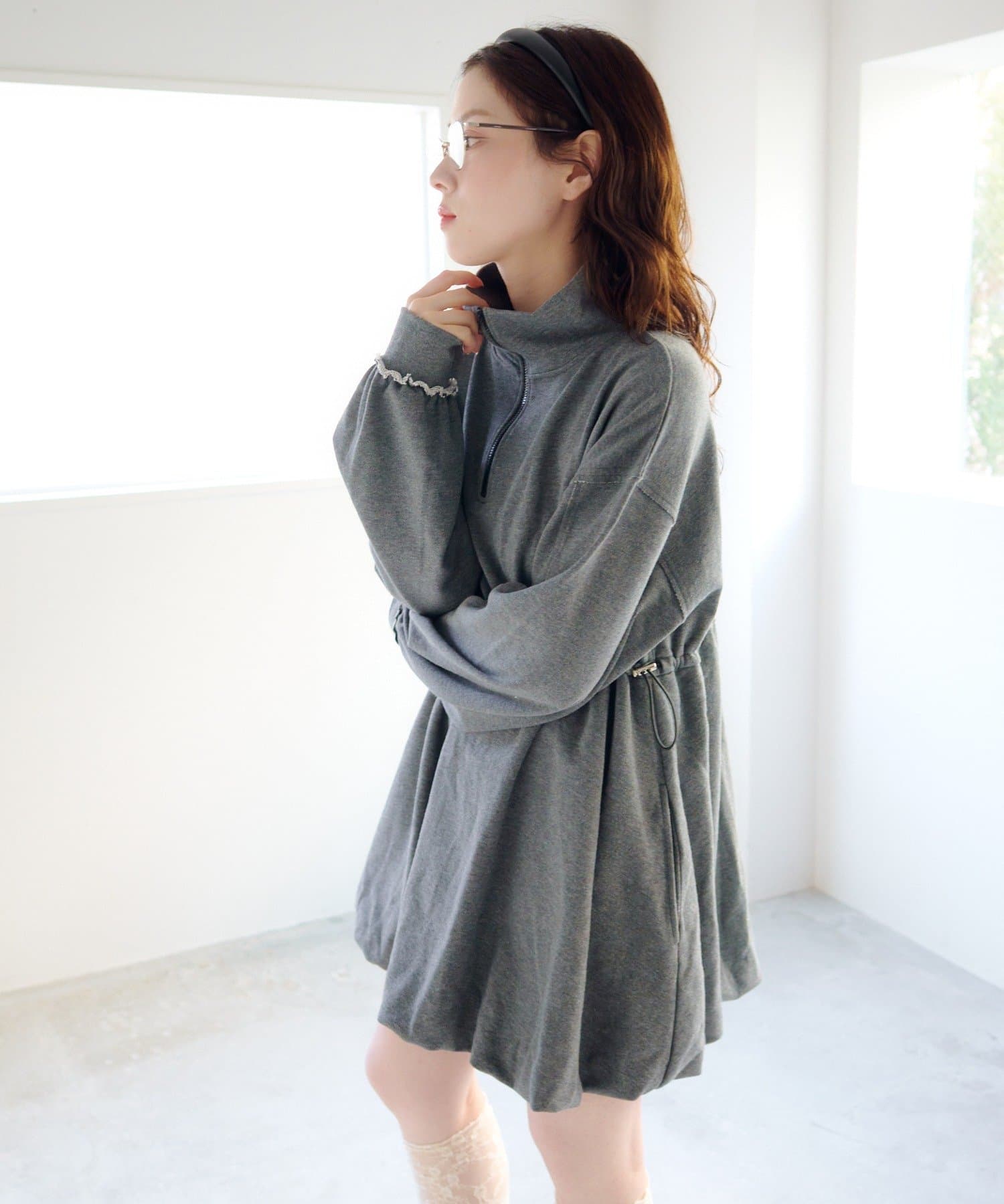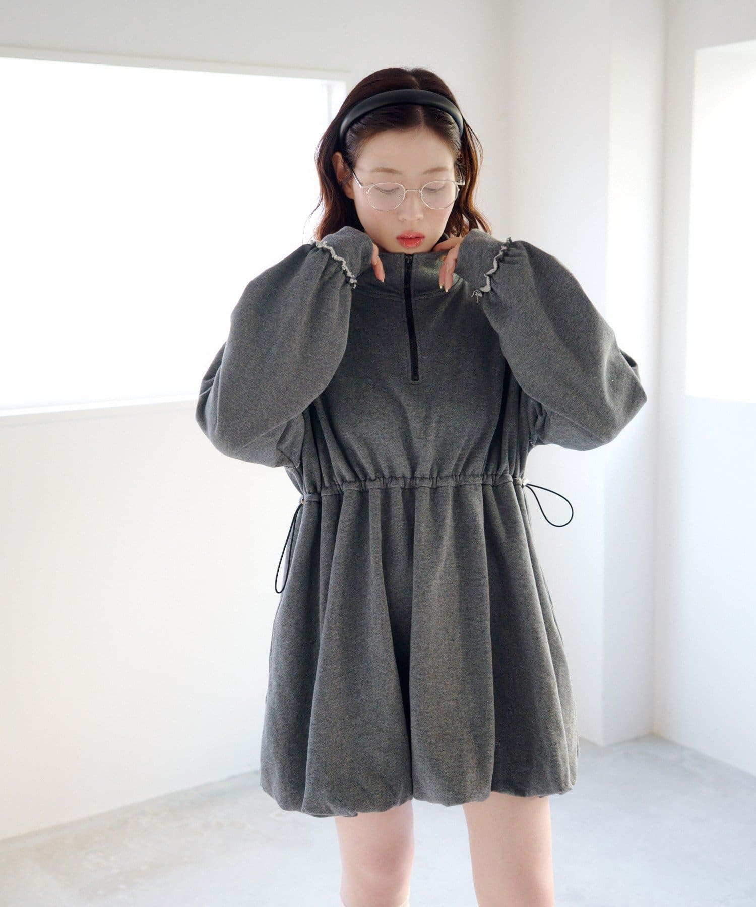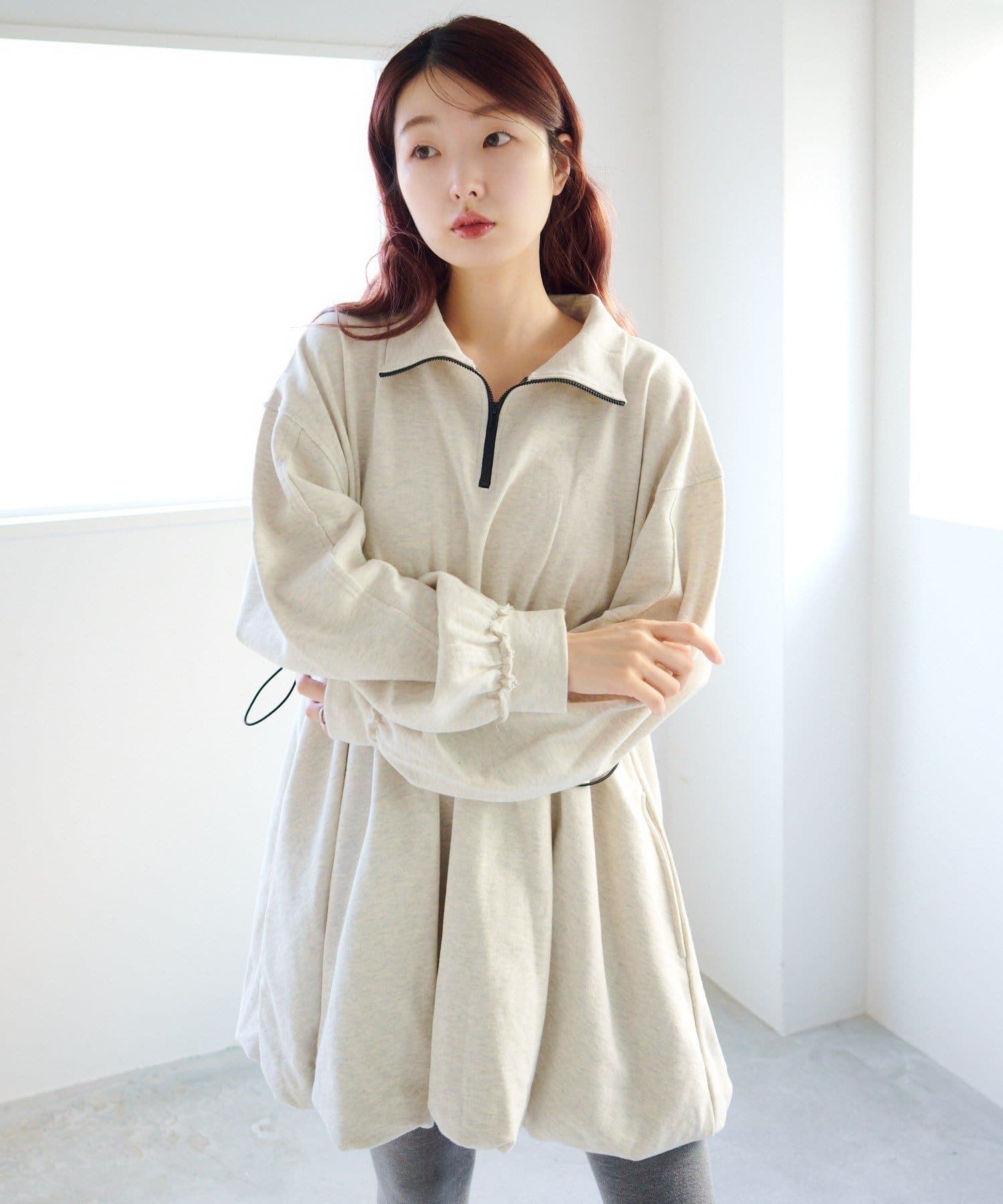 丸みのあるバルーンシルエットが印象的なスウェットミニワンピース。