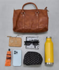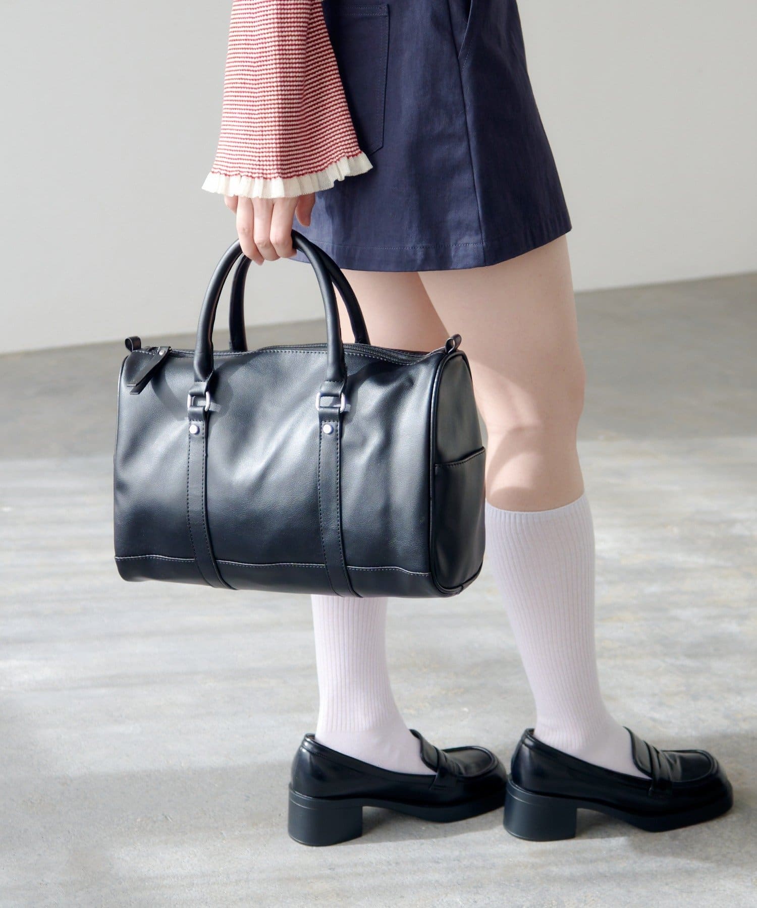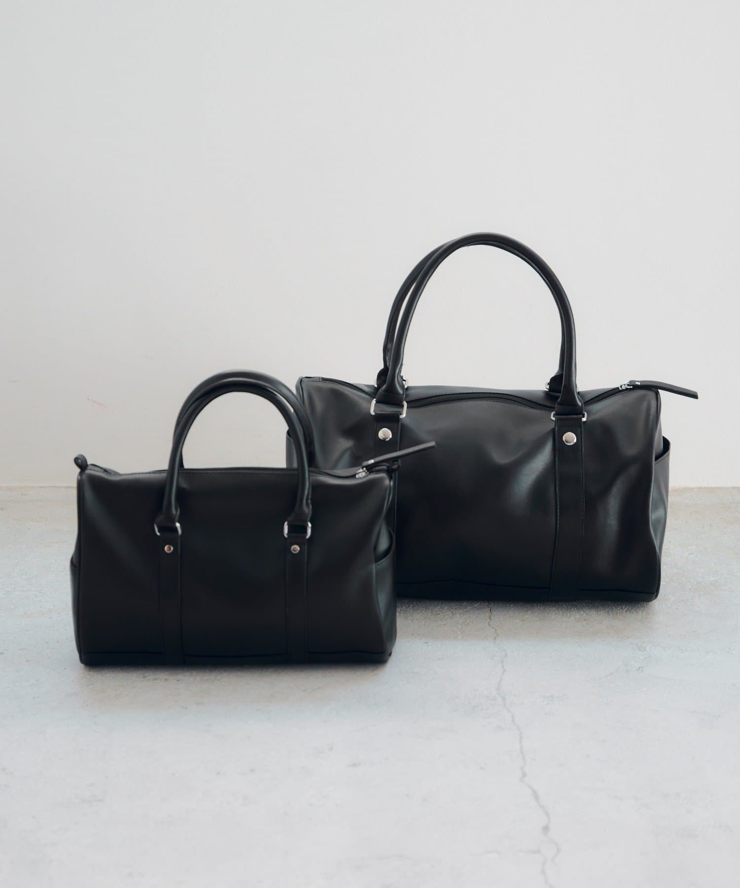 コーディネートに自然と馴染む、シンプルなボストンバッグ。