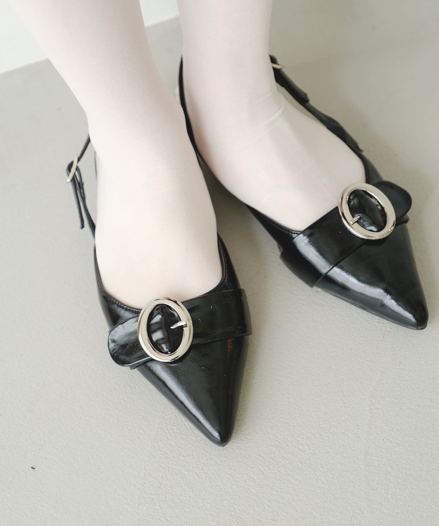 シャープなポインテッドトゥに、存在感のあるラインベルトをあしらったラインベルトパンプス。