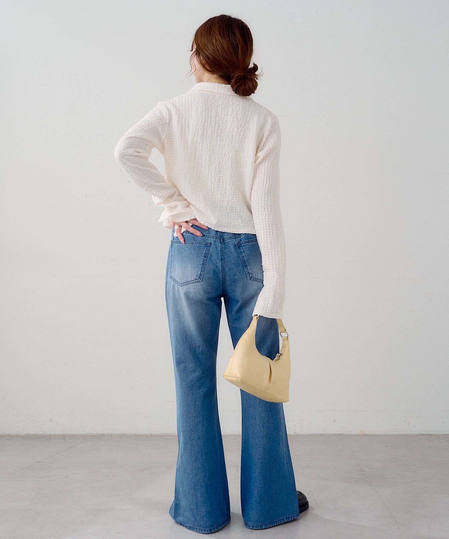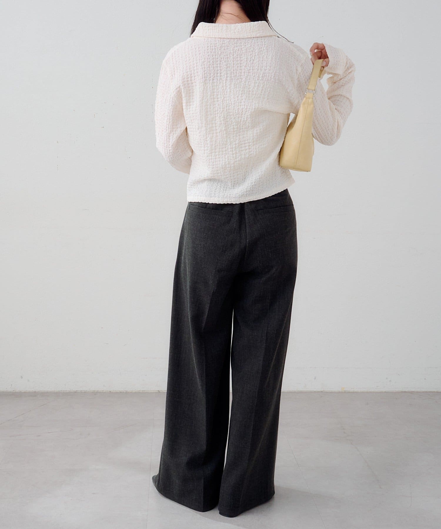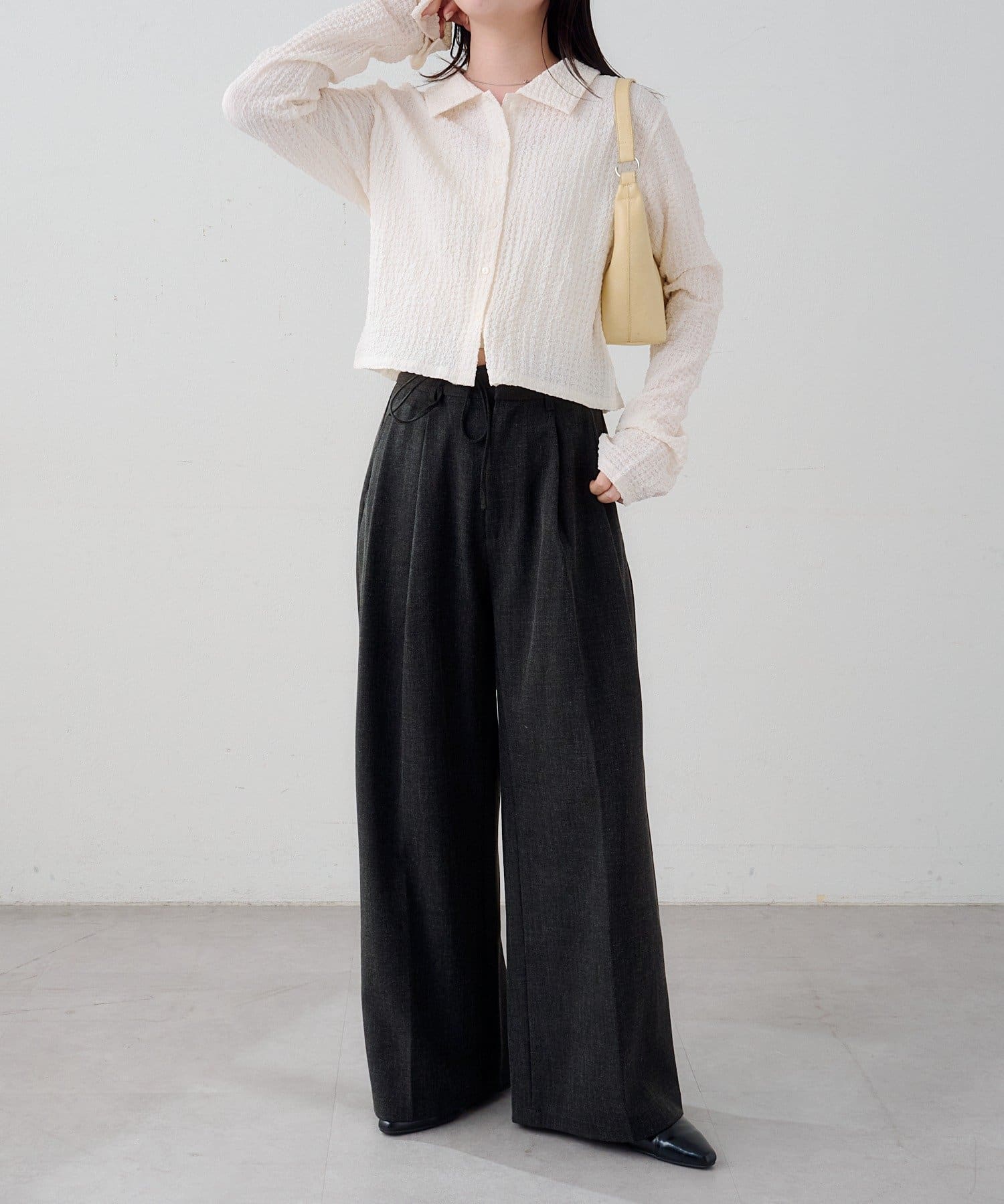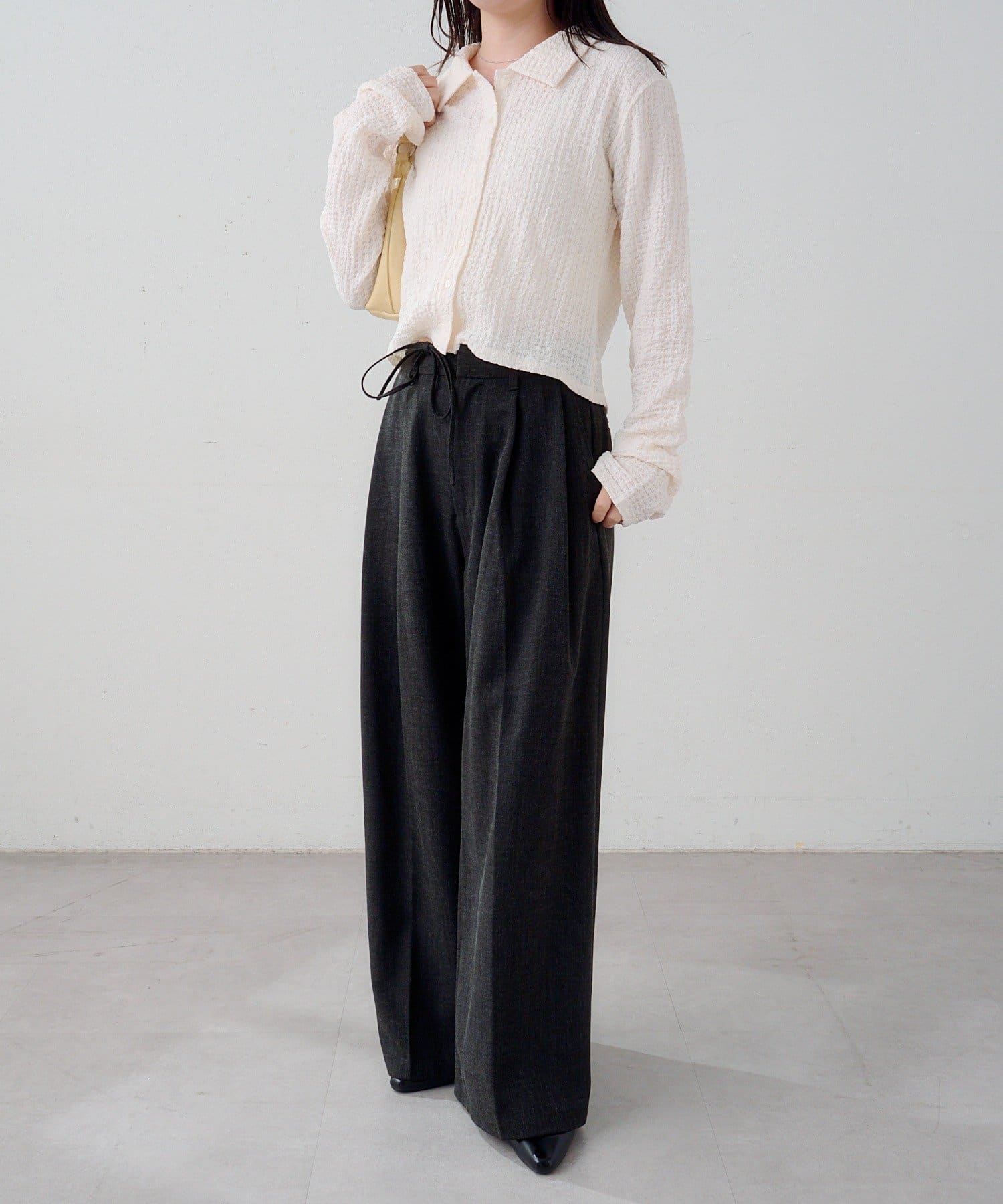 ハイウエストデニムやスラックスでバランス良く、ロングスカート合わせで女性らしい印象に。