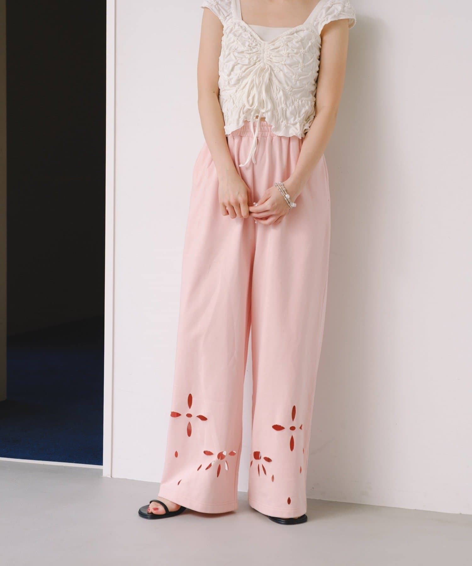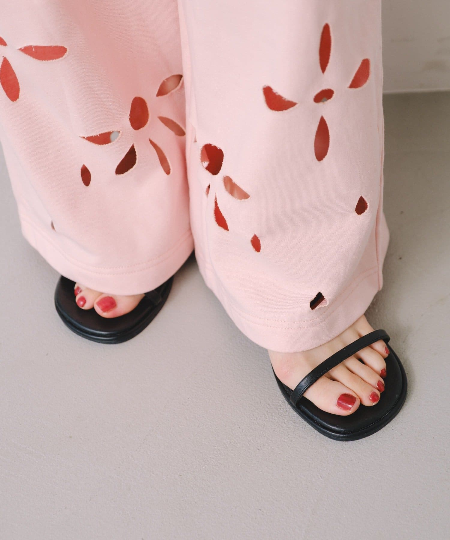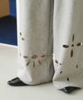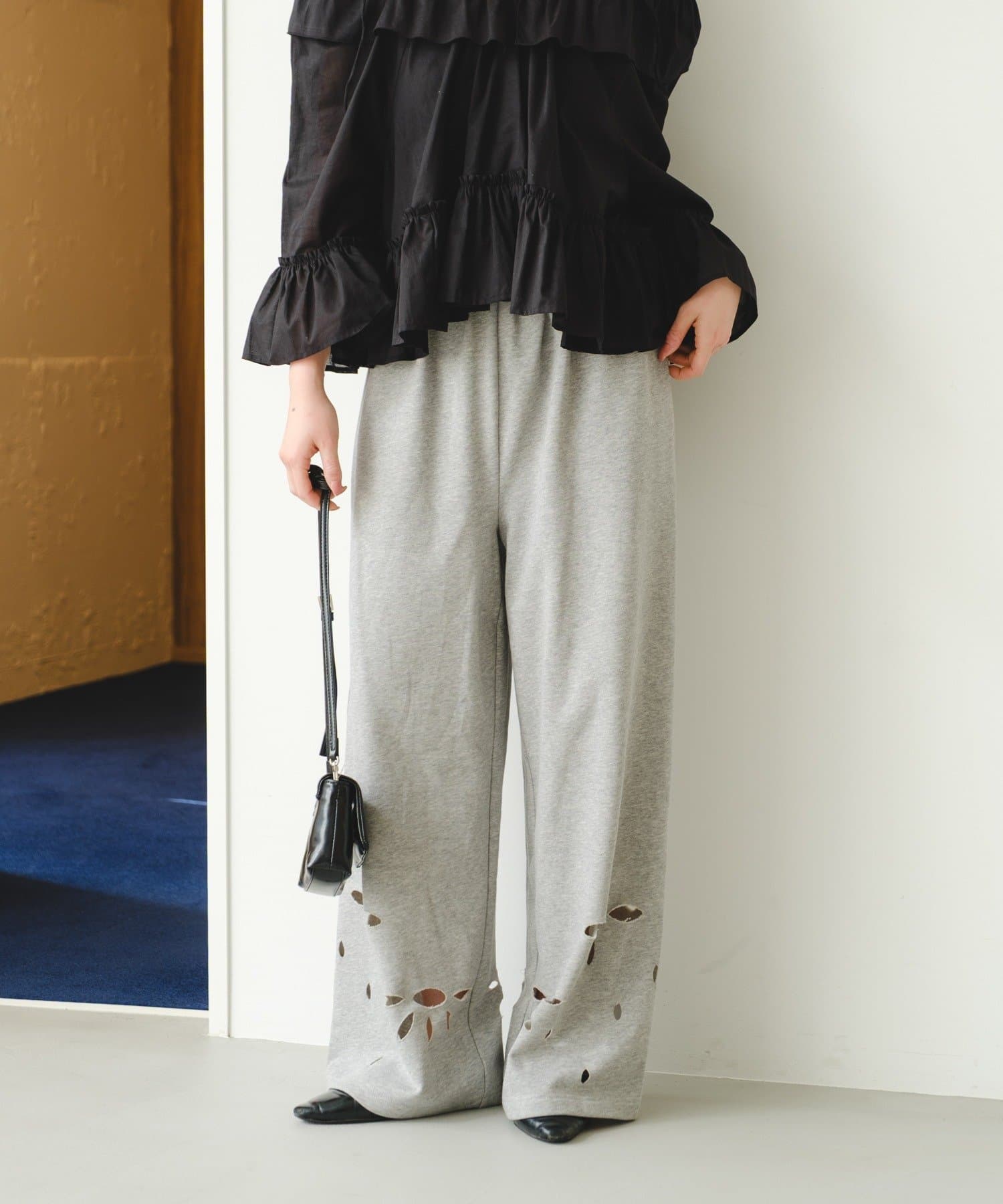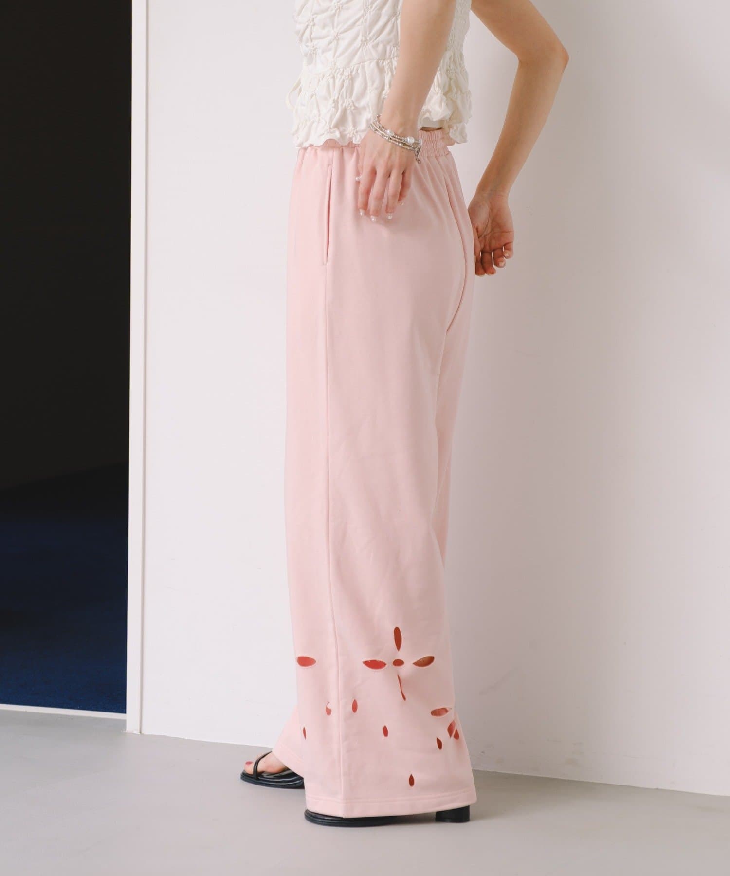 リラックス感のあるスウェットパンツに、裾のフラワーモチーフカットアウトでさりげない個性をプラス。