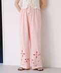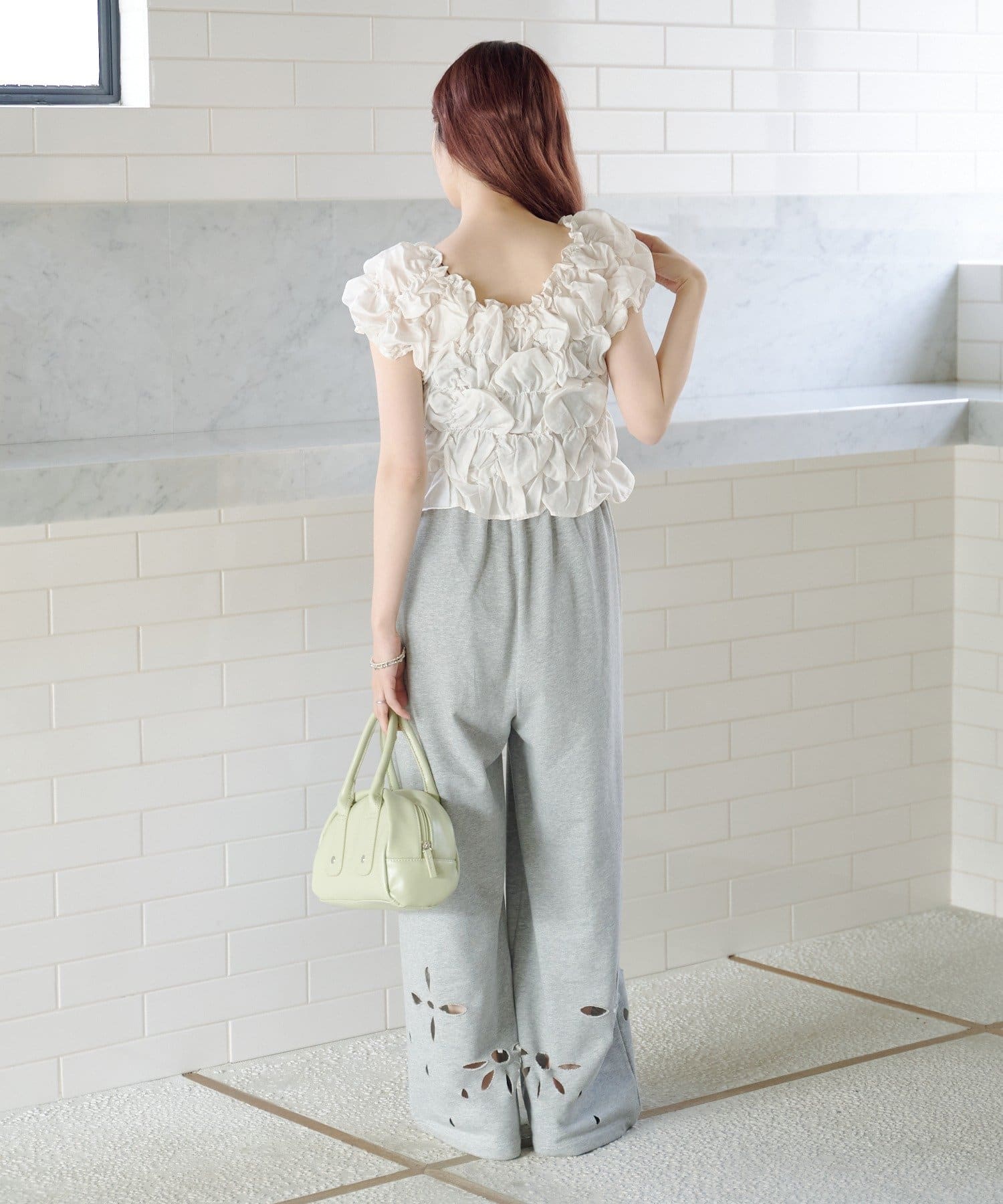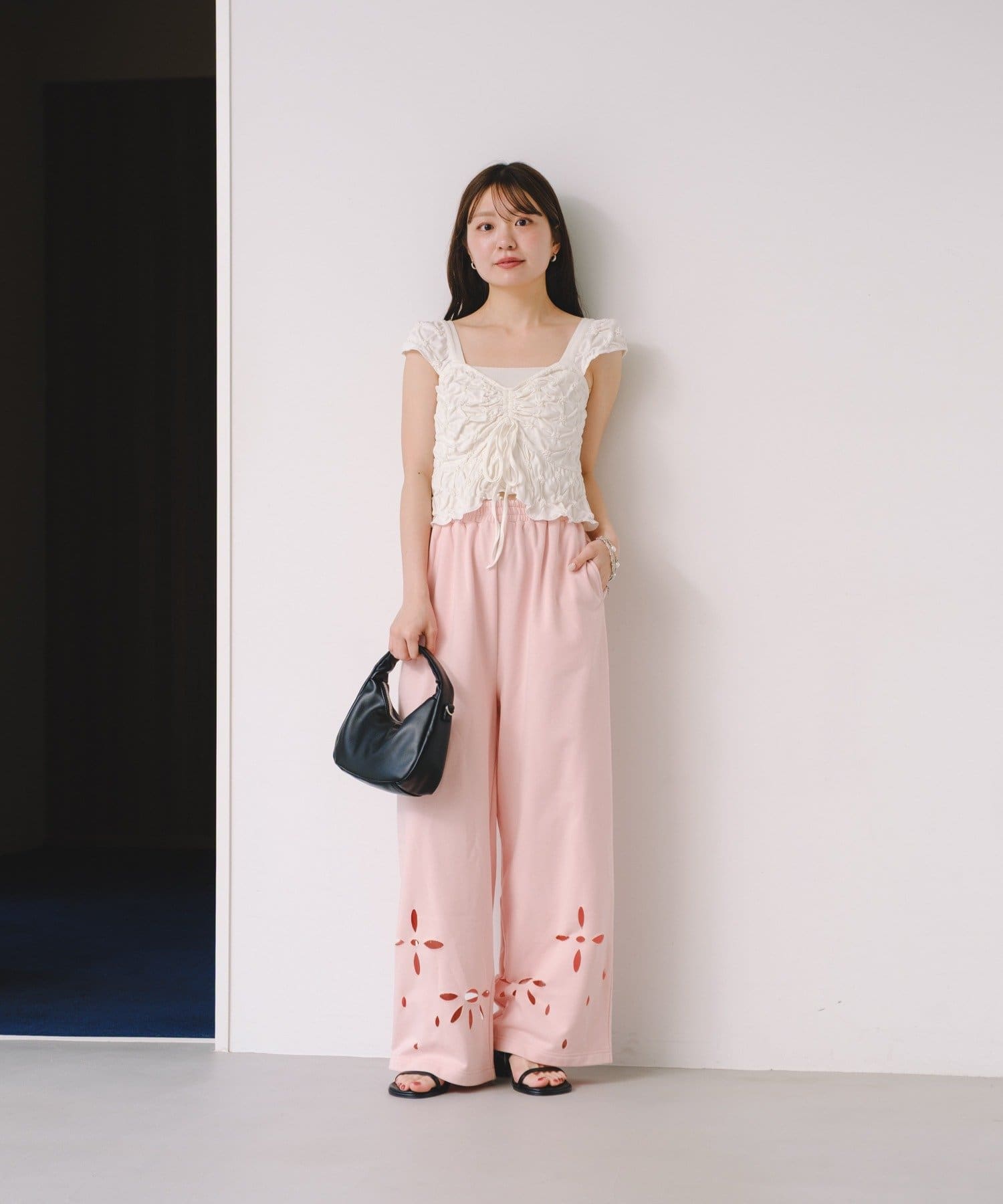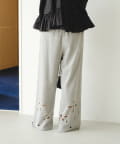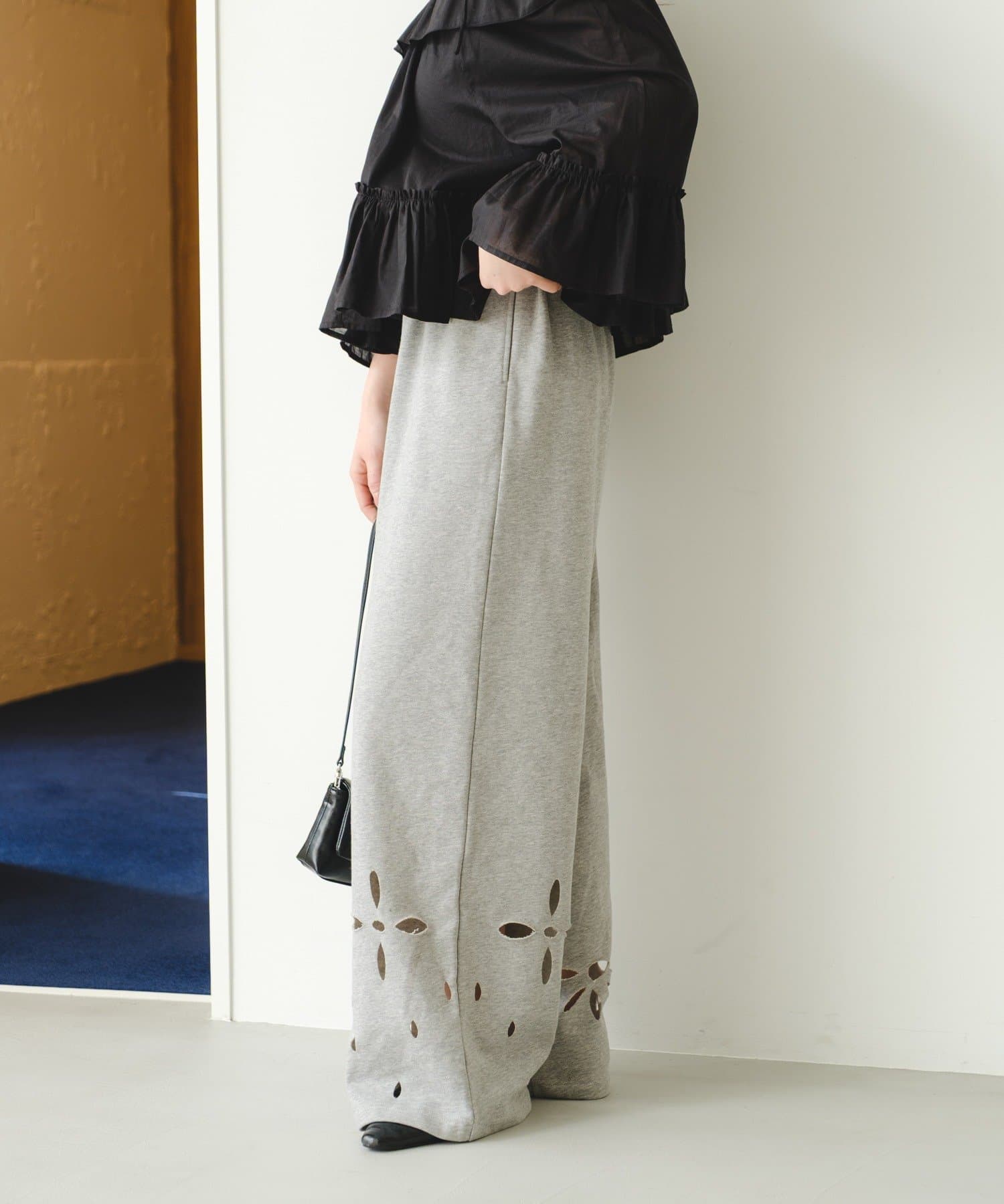 リラックス感のあるスウェットパンツに、裾のフラワーモチーフカットアウトでさりげない個性をプラス。