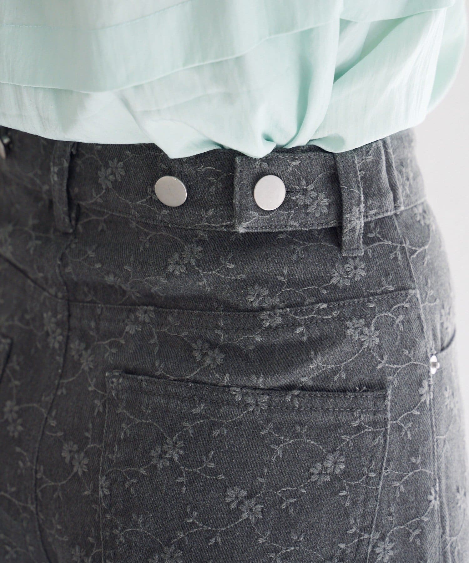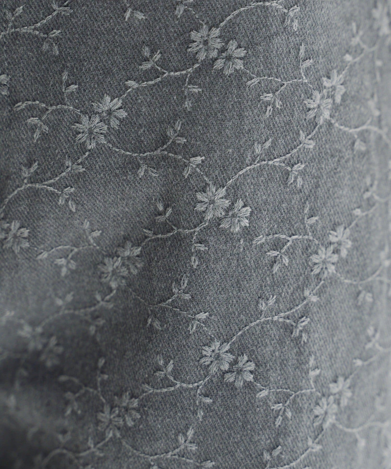 細やかなフラワーエンブロイダリーがさりげないアクセントになり、シンプルなトップスと合わせるだけでコーデが完成します。