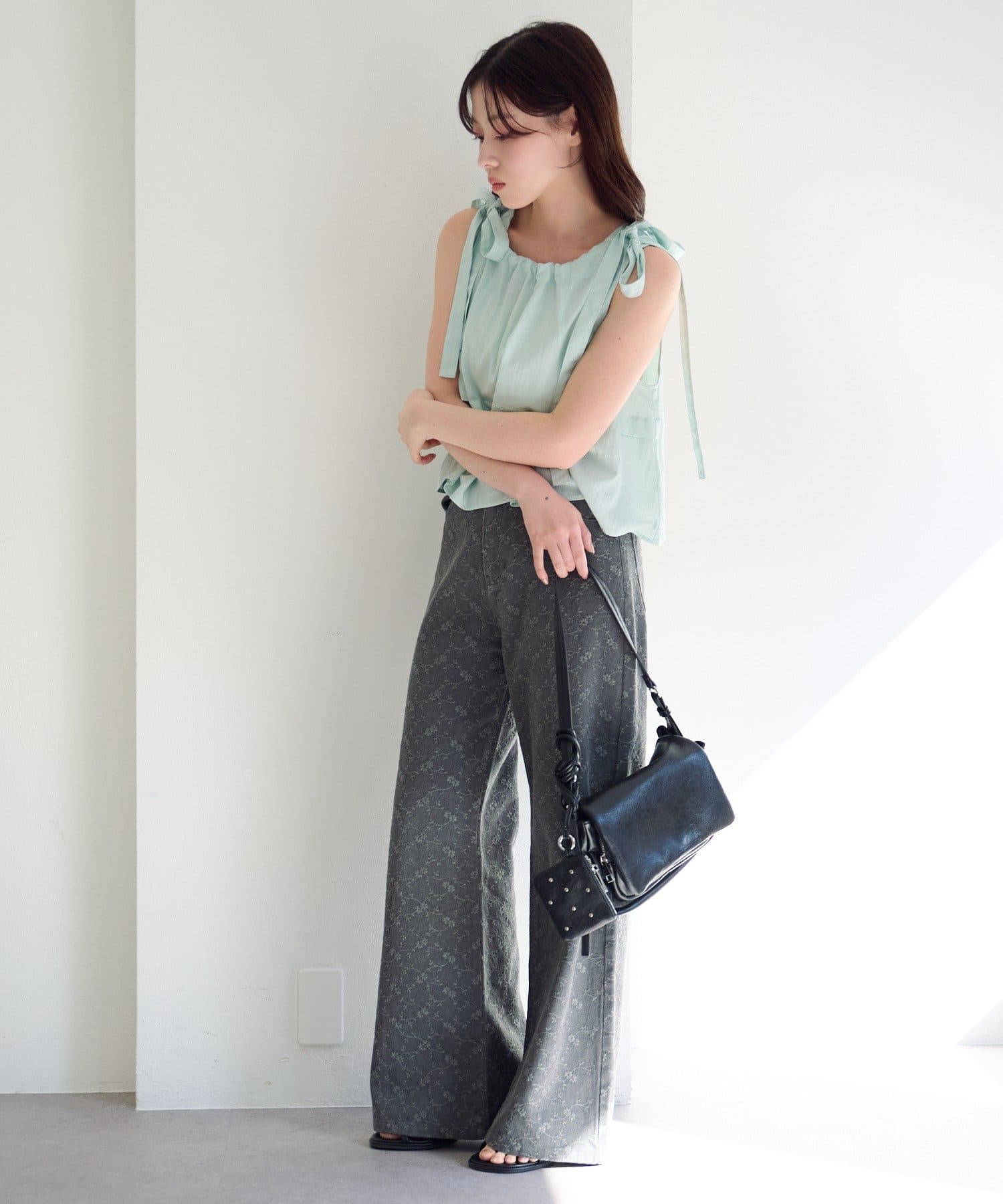 花柄を落ち着いたトーンのデニムに落とし込むことで、大人っぽく洗練された印象に。