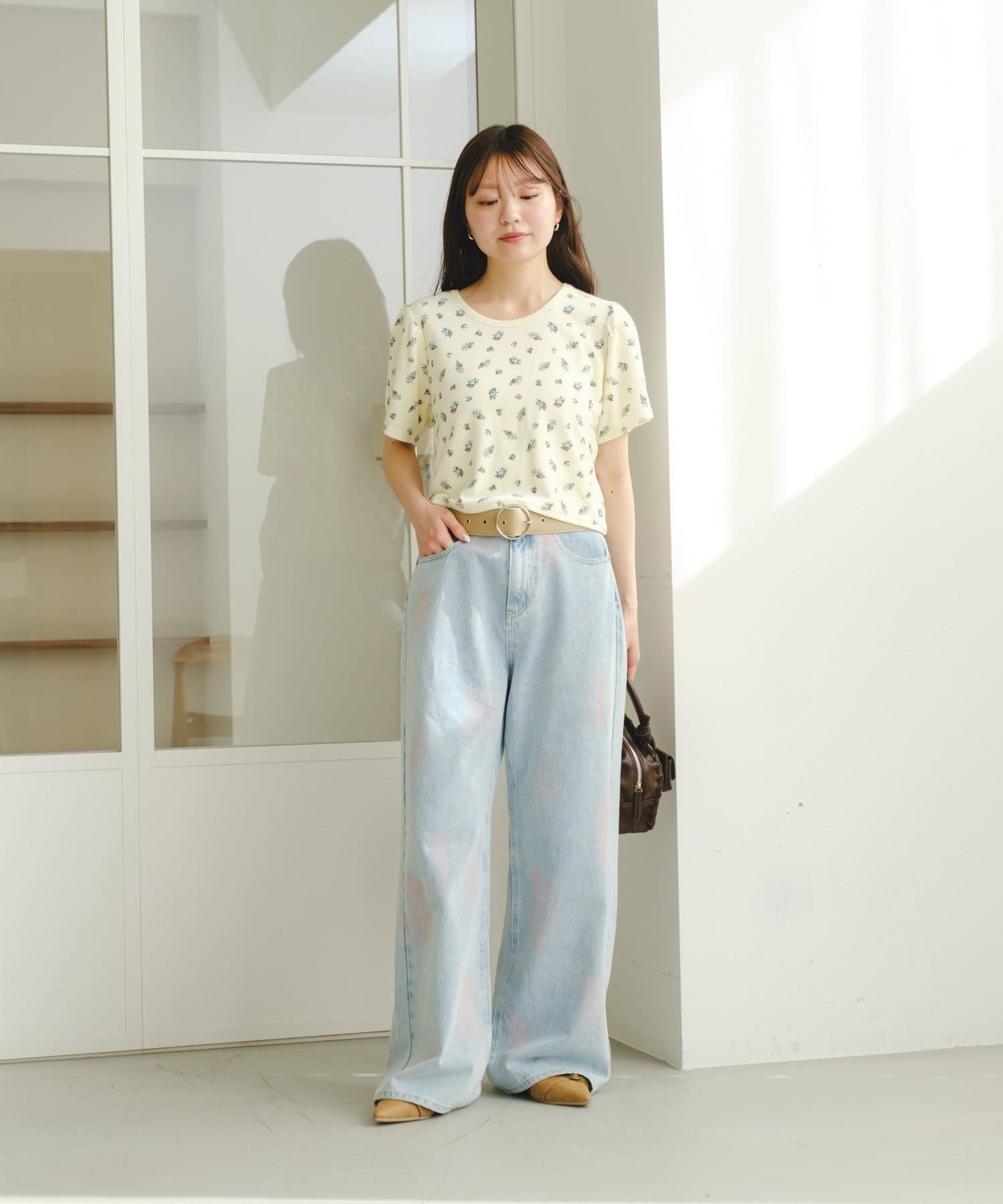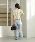 コンパクトなTシャツや柄トップスをインして、デニムを主役に。