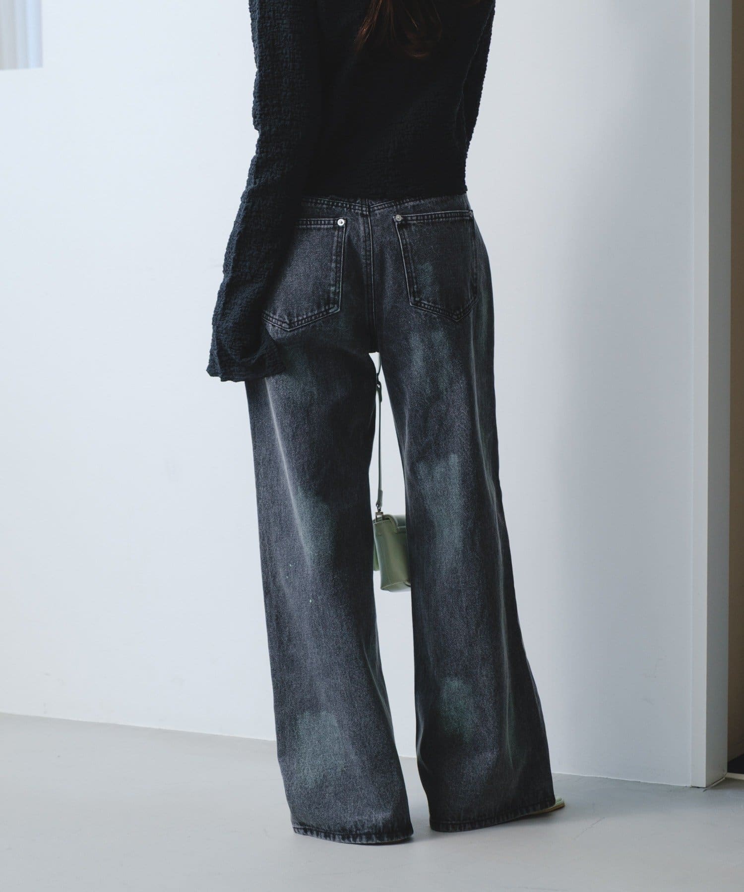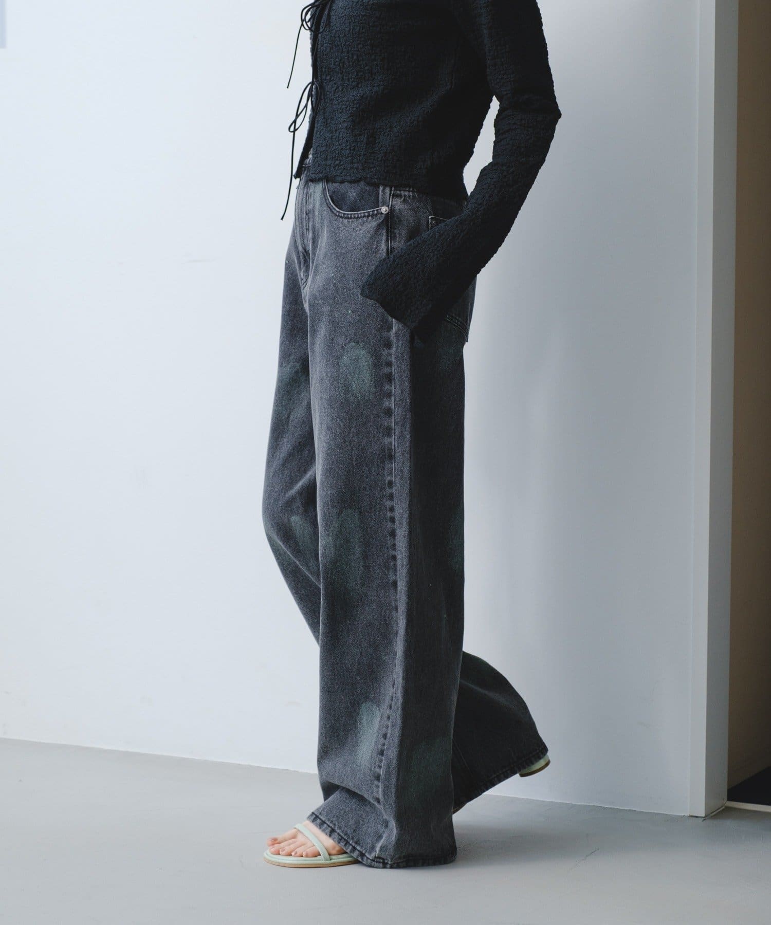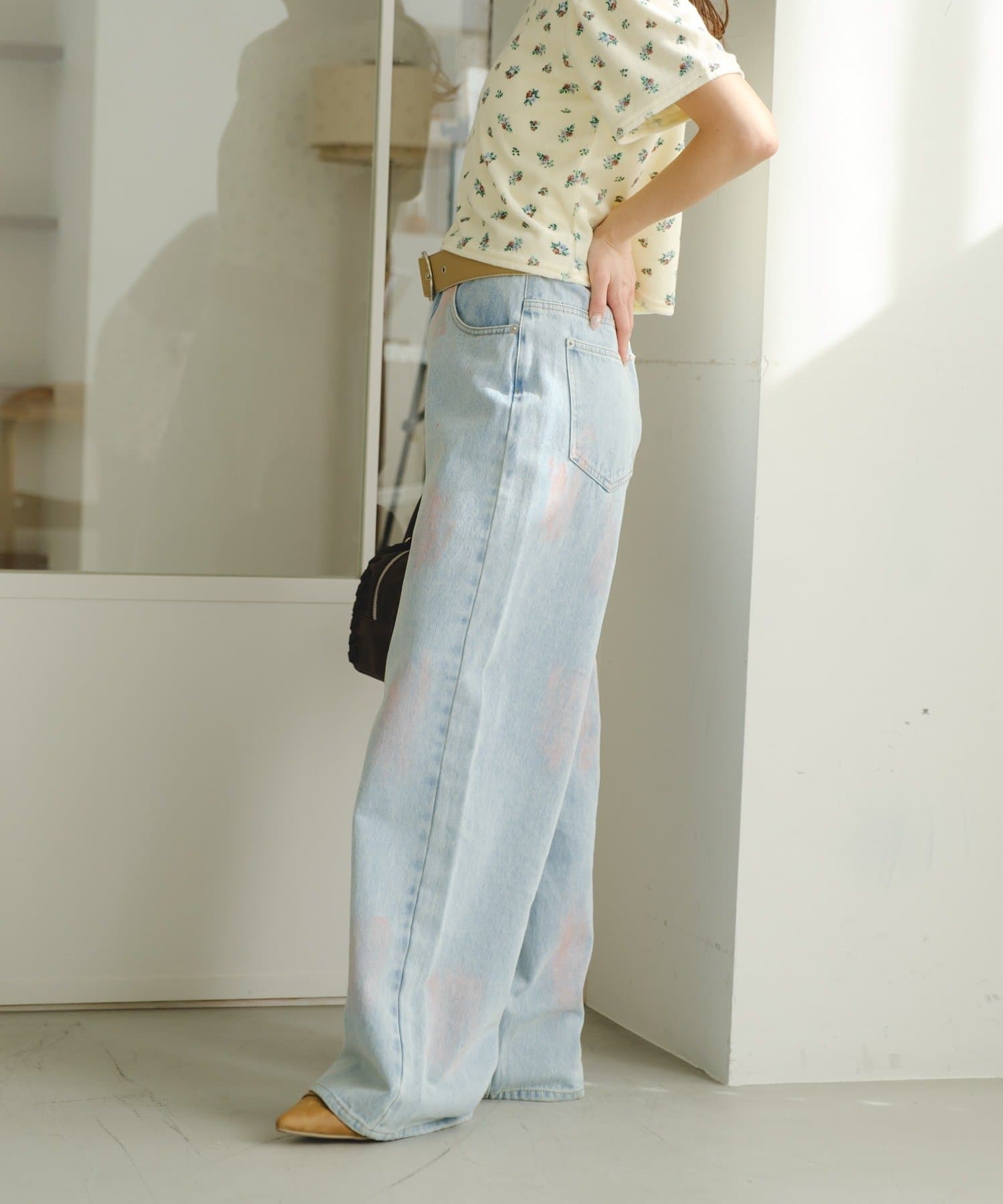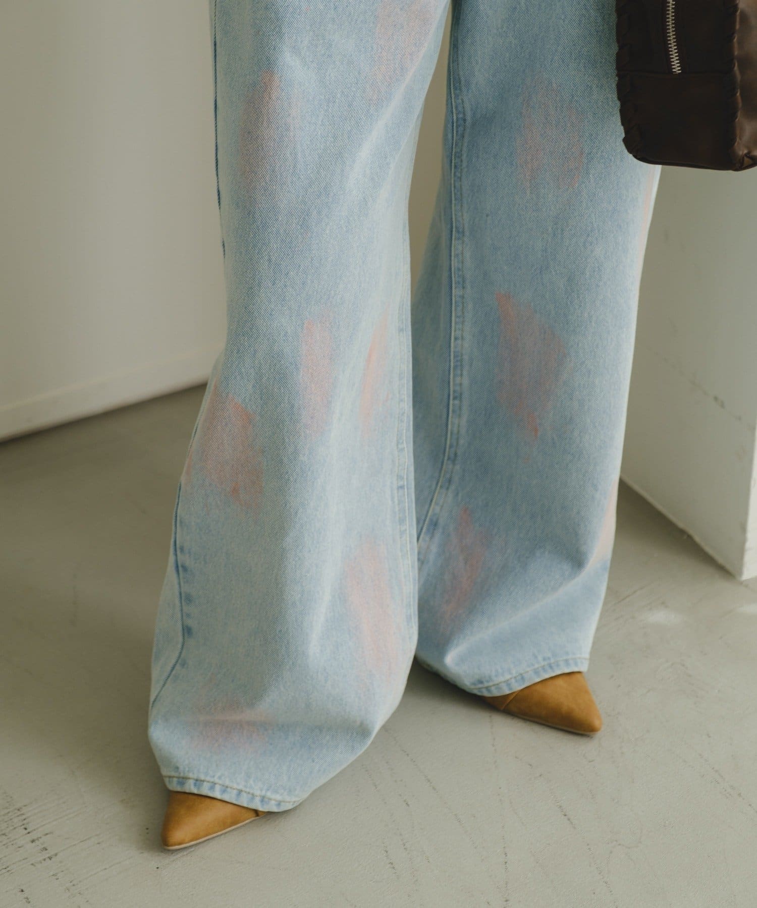 淡いカラーのスプレー加工を施した、表情豊かなワイドデニムパンツ。