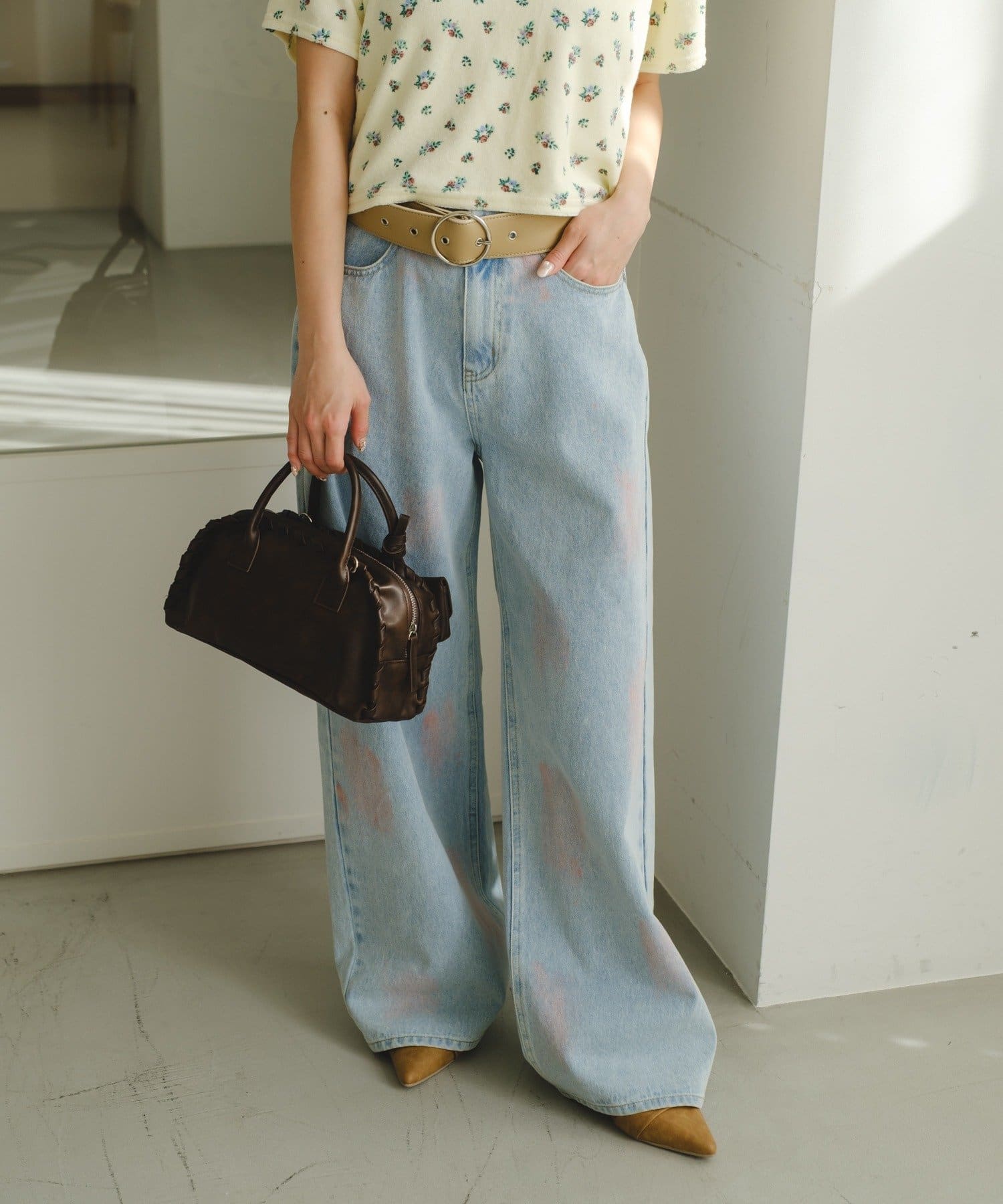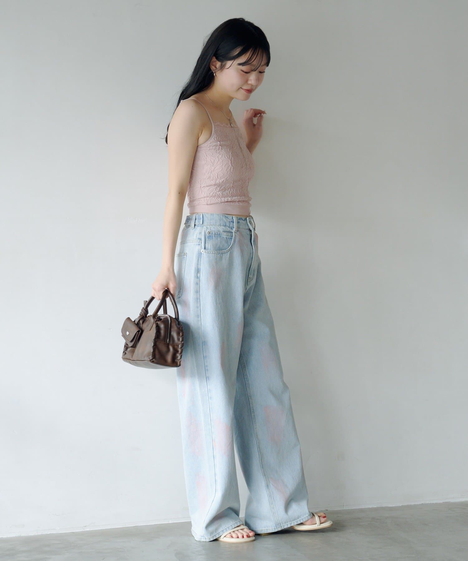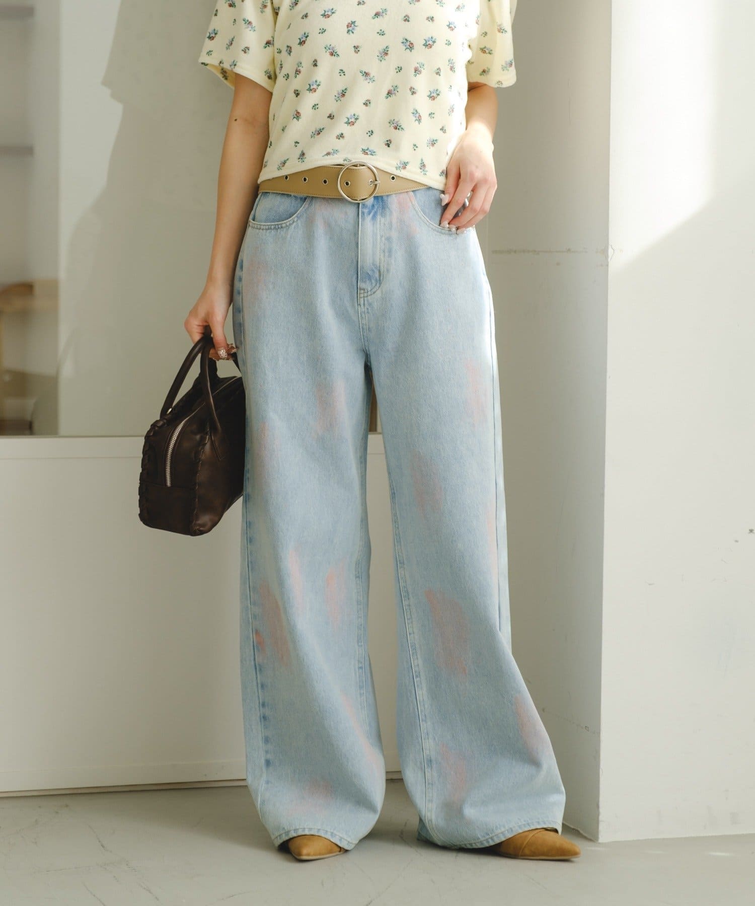 淡いカラーのスプレー加工を施した、表情豊かなワイドデニムパンツ。