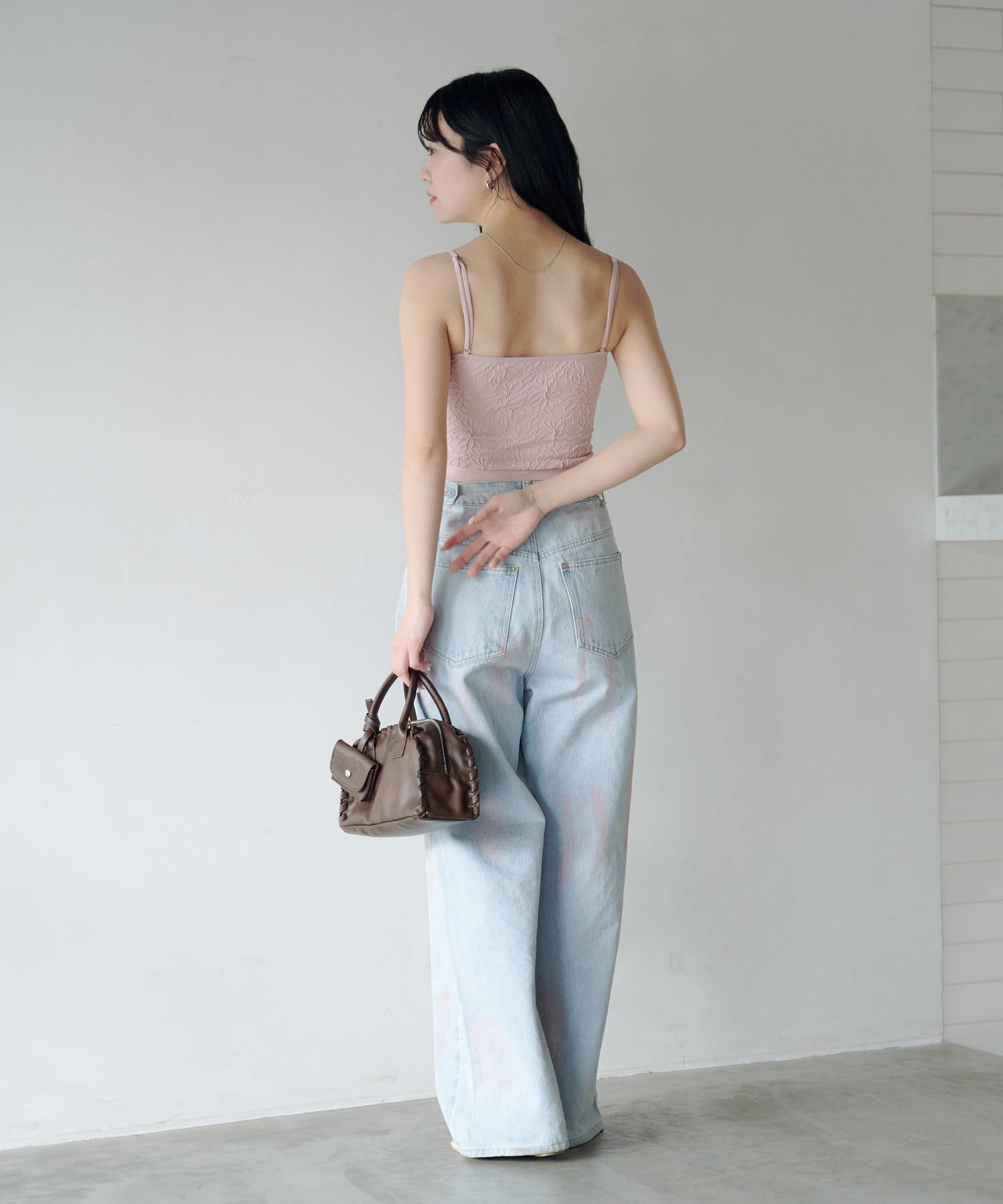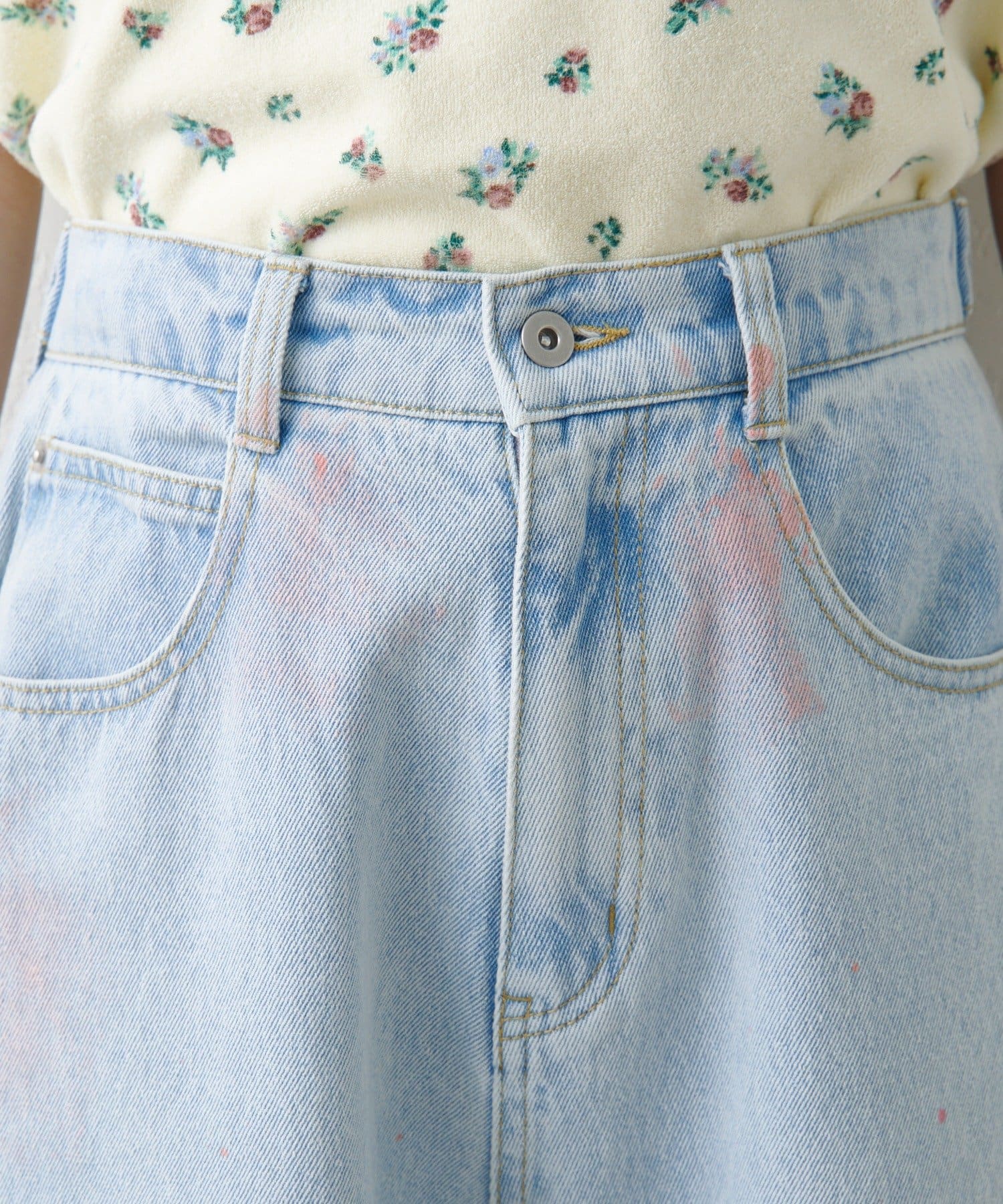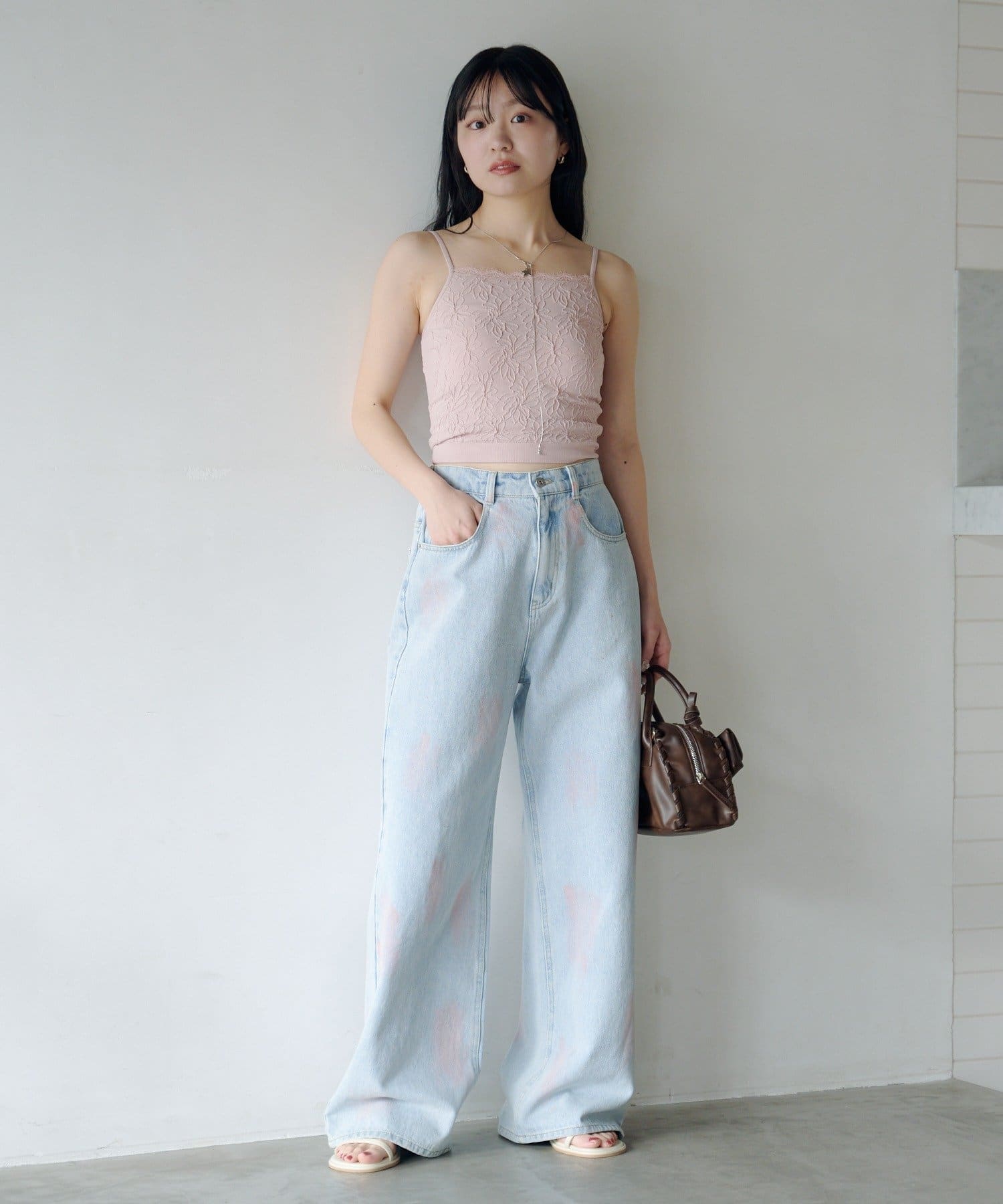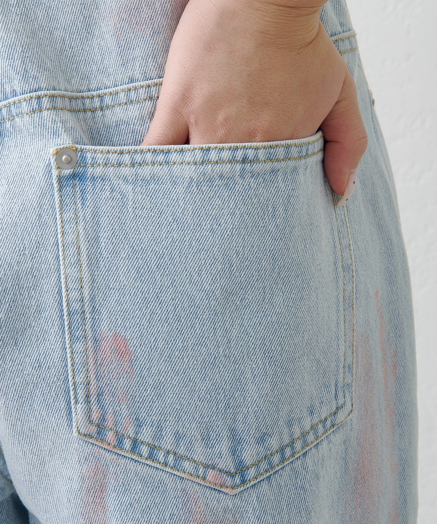 淡いカラーのスプレー加工を施した、表情豊かなワイドデニムパンツ。