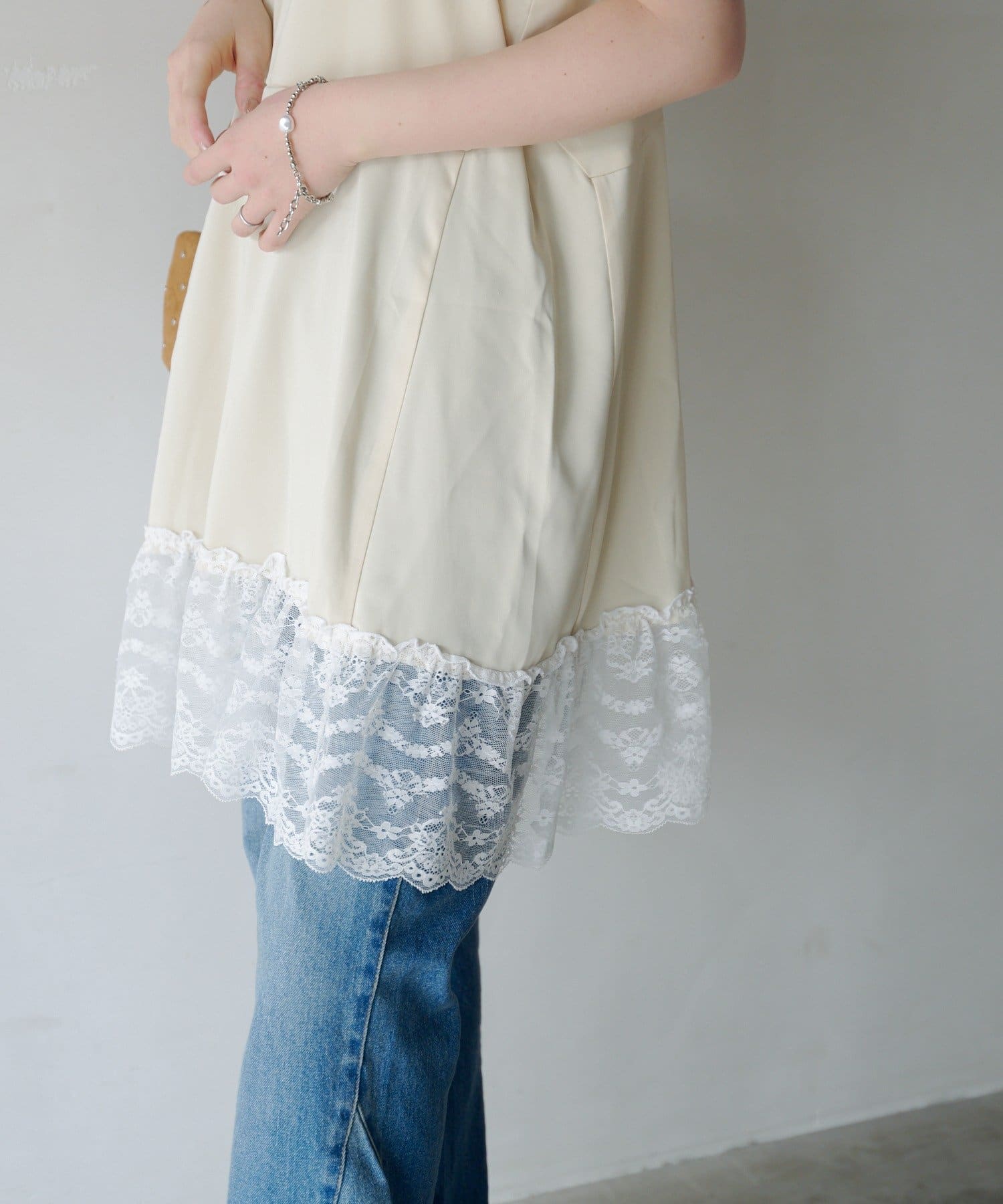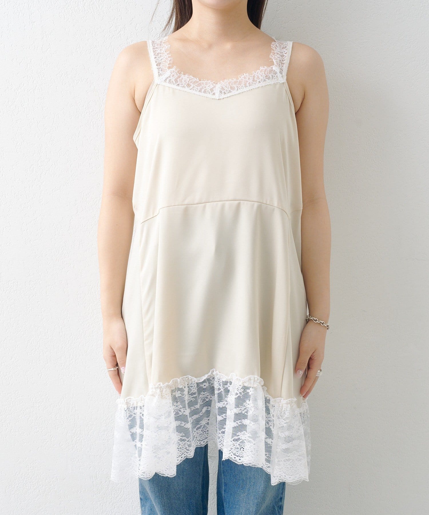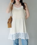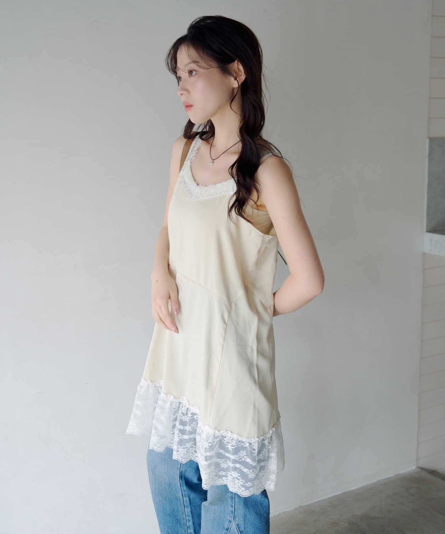 サテン素材に繊細なレースをあしらったフェミニンムード漂うチュニック