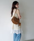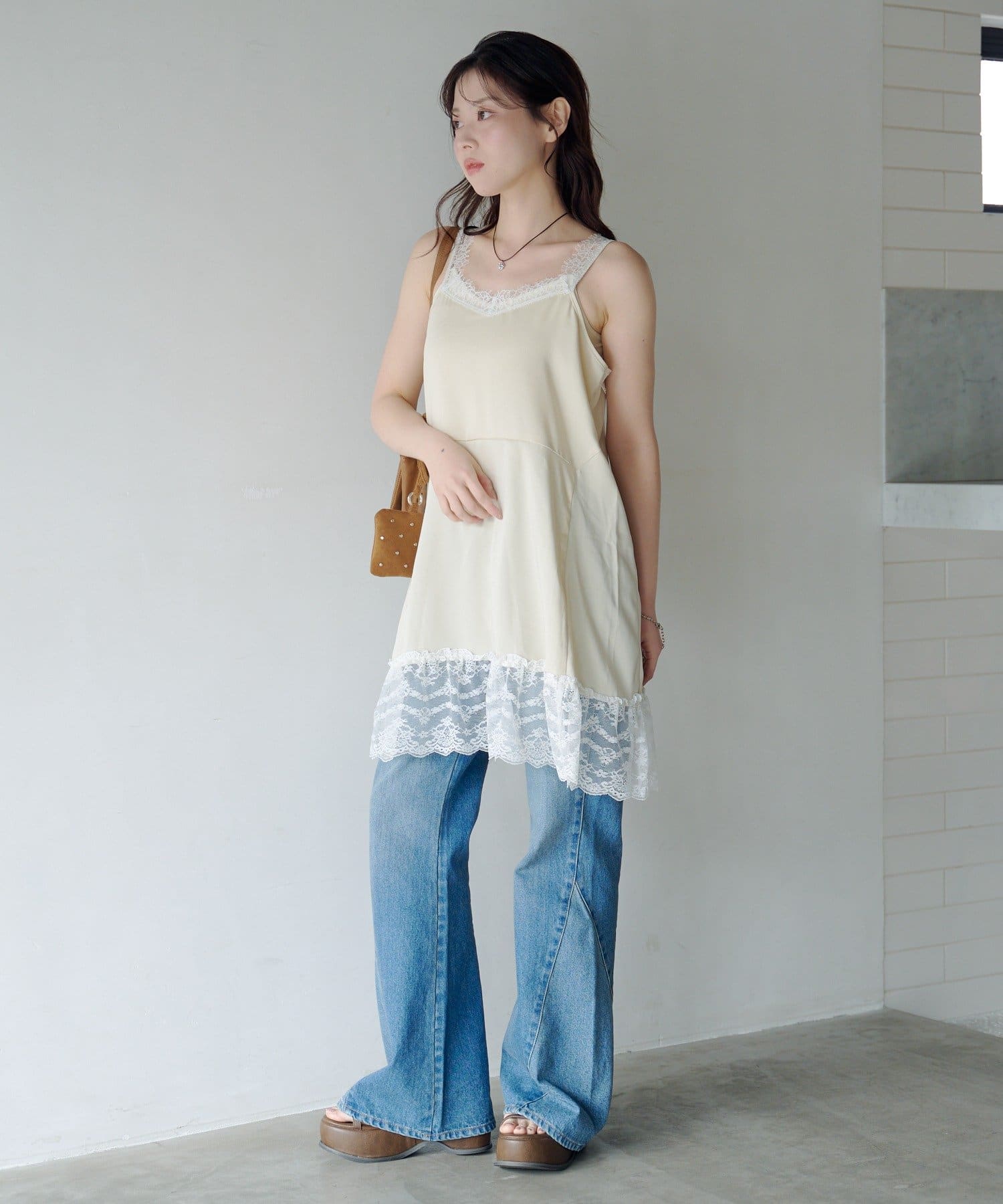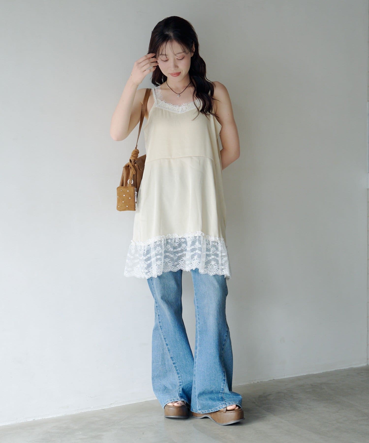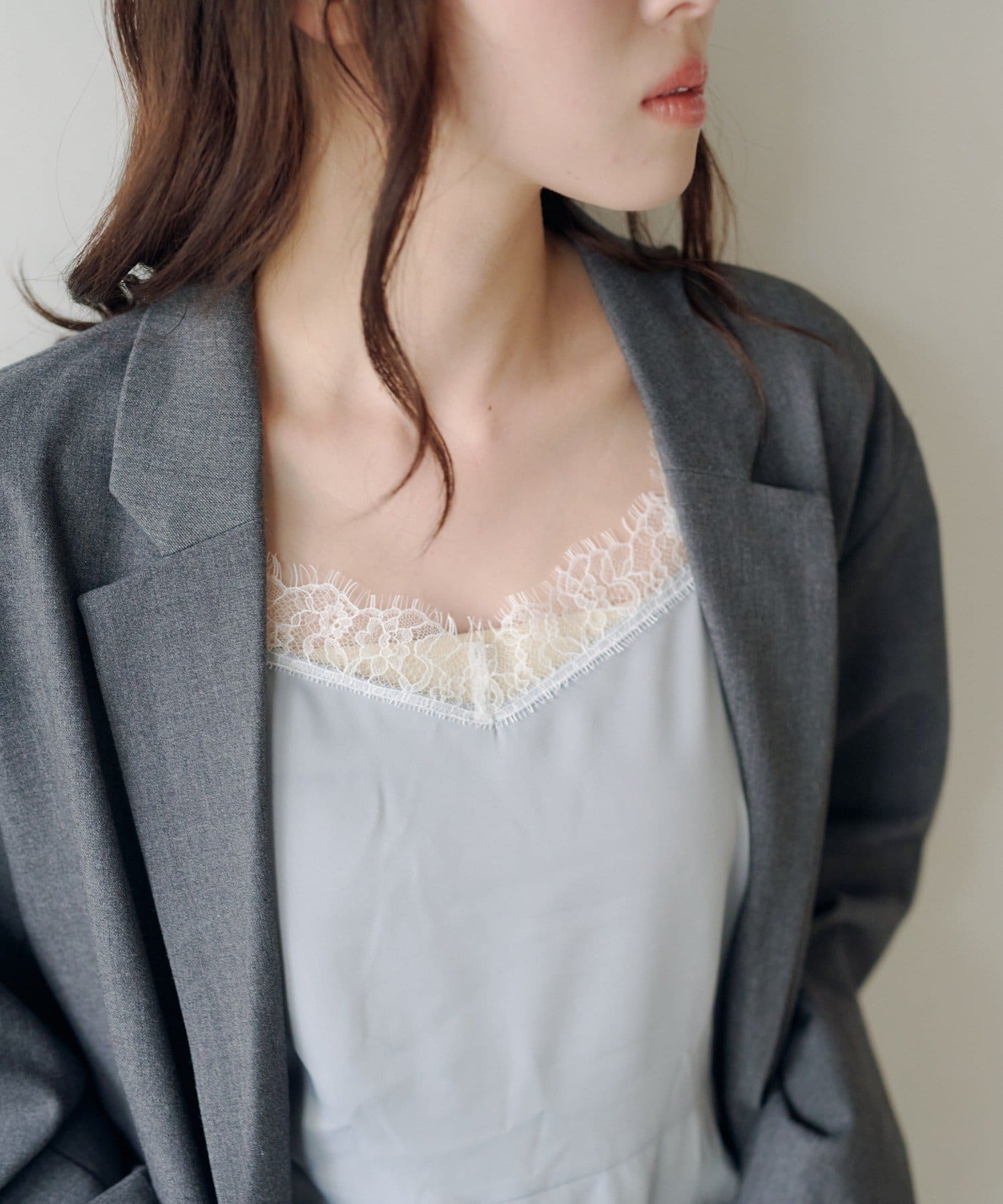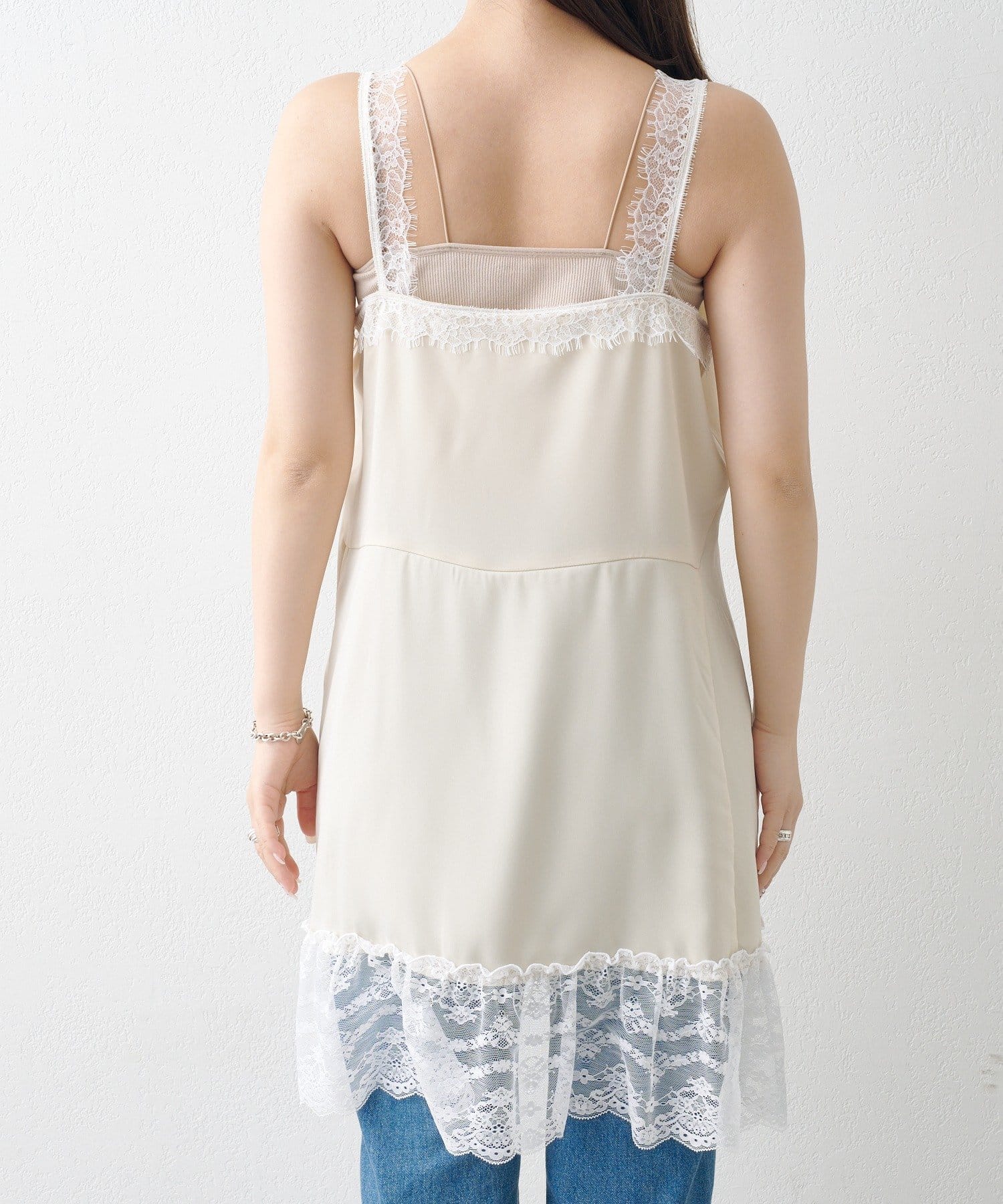 サテン素材に繊細なレースをあしらったフェミニンムード漂うチュニック
