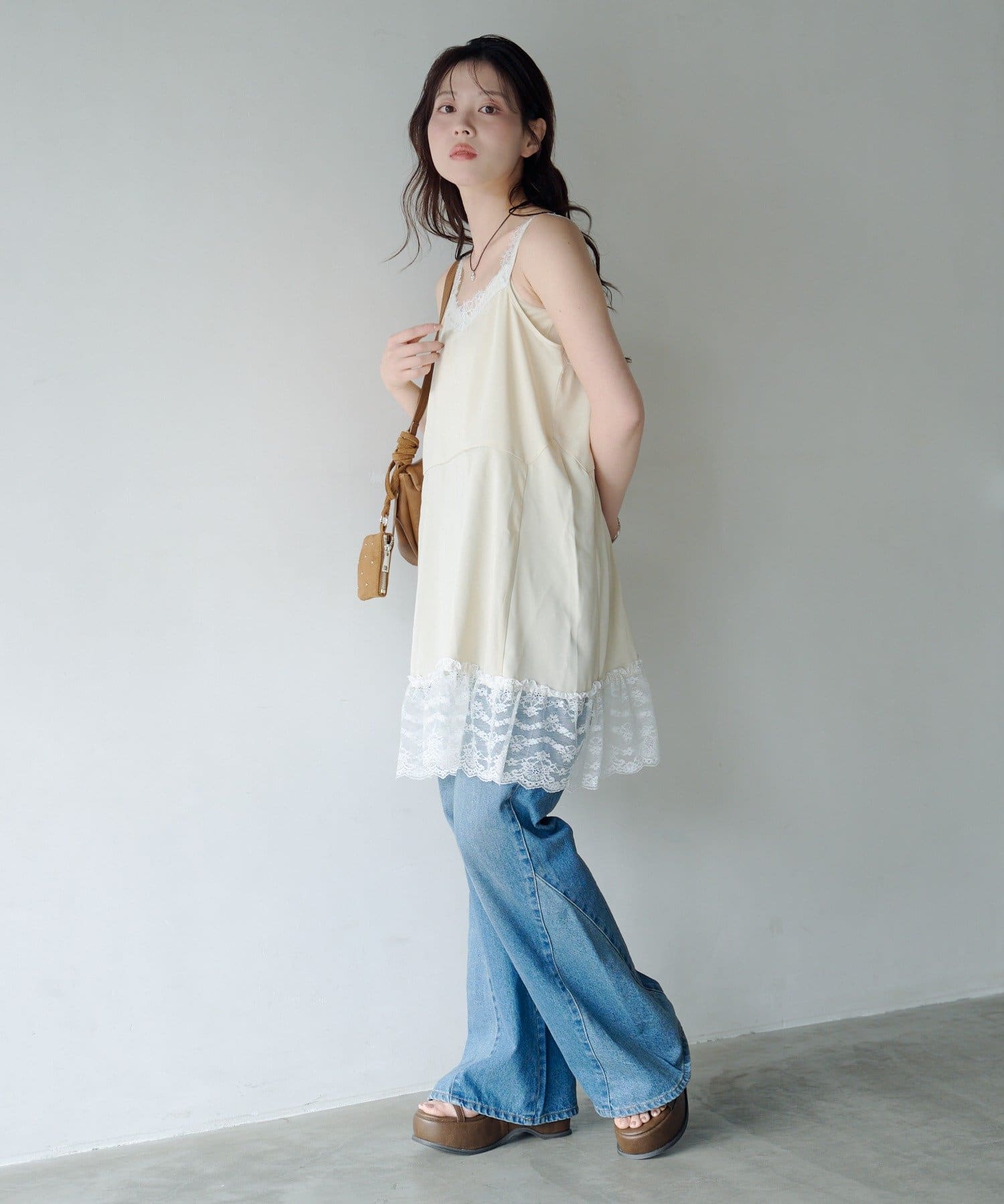華奢なストラップとすっきりとしたIラインシルエットで、大人っぽさと甘さをバランス良く兼ね備えた一枚です。
