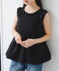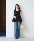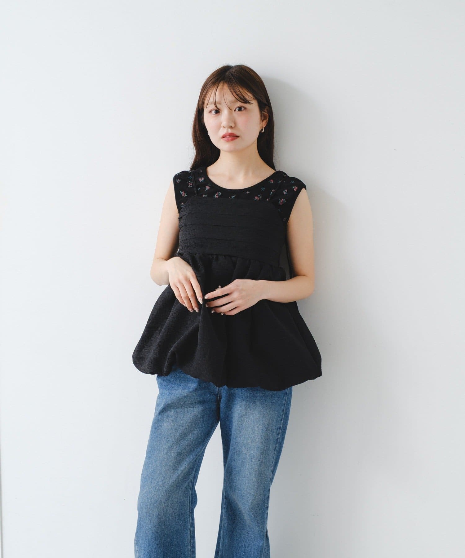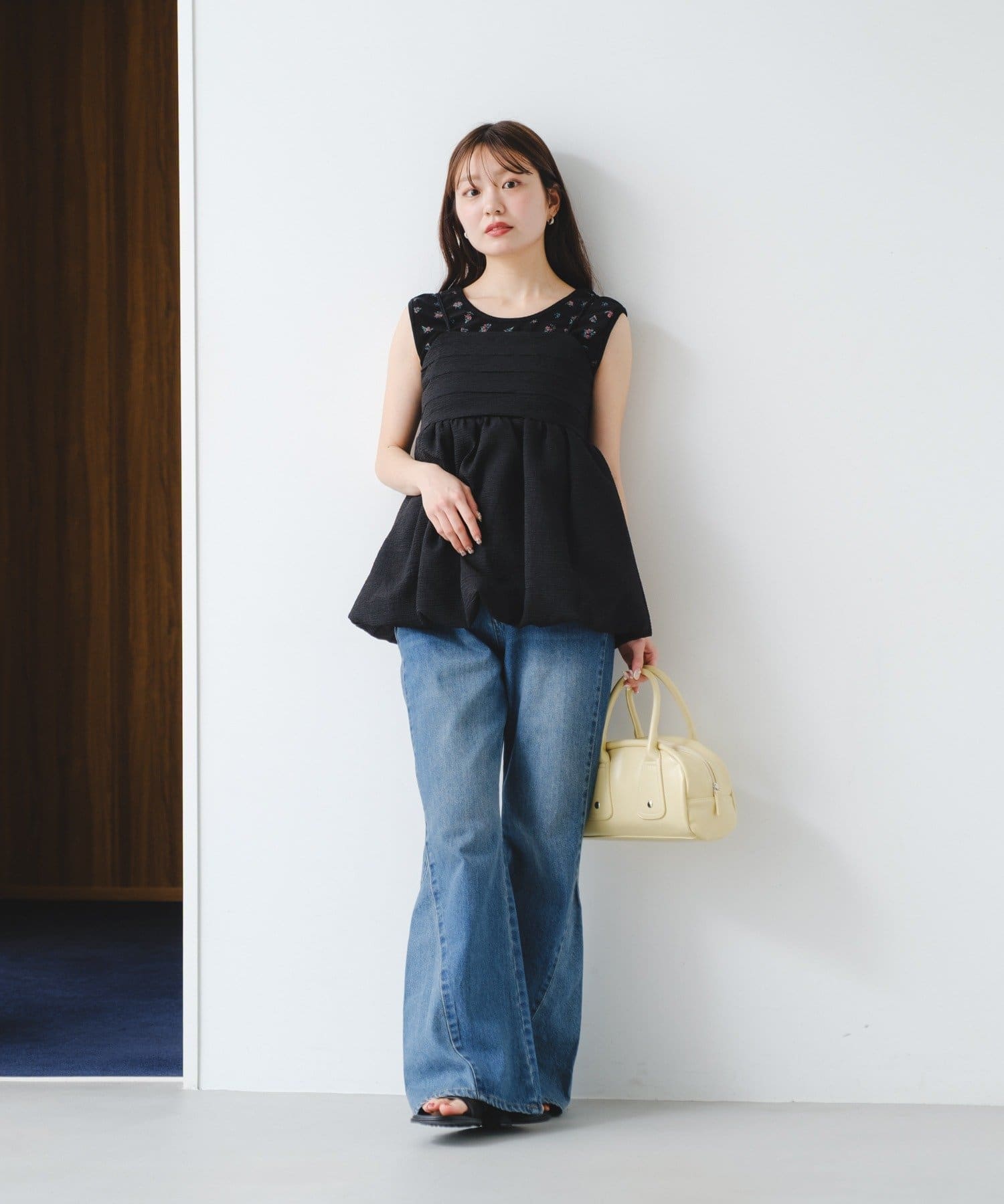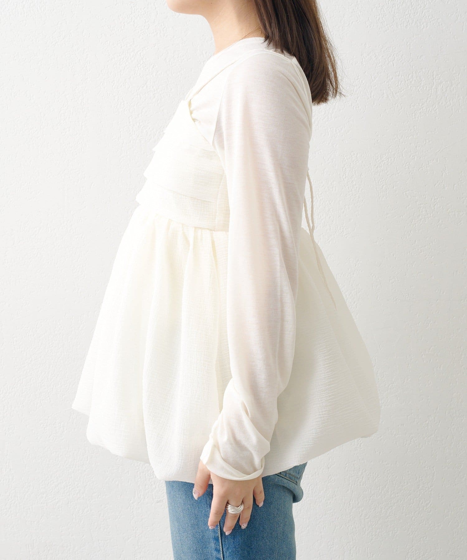 胸元の切り替えとふんわり広がるペプラムシルエットが、女性らしい立体感を演出します。