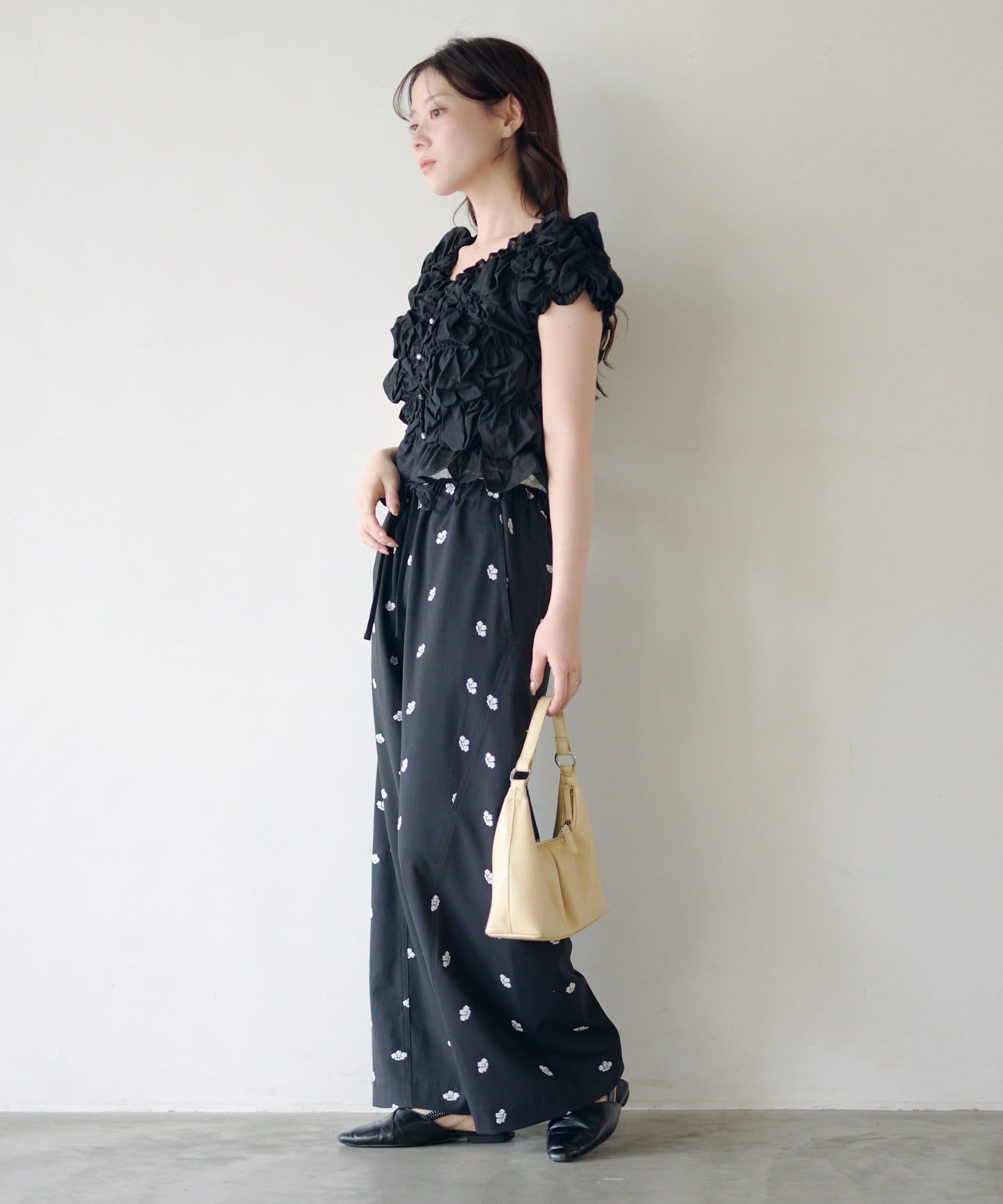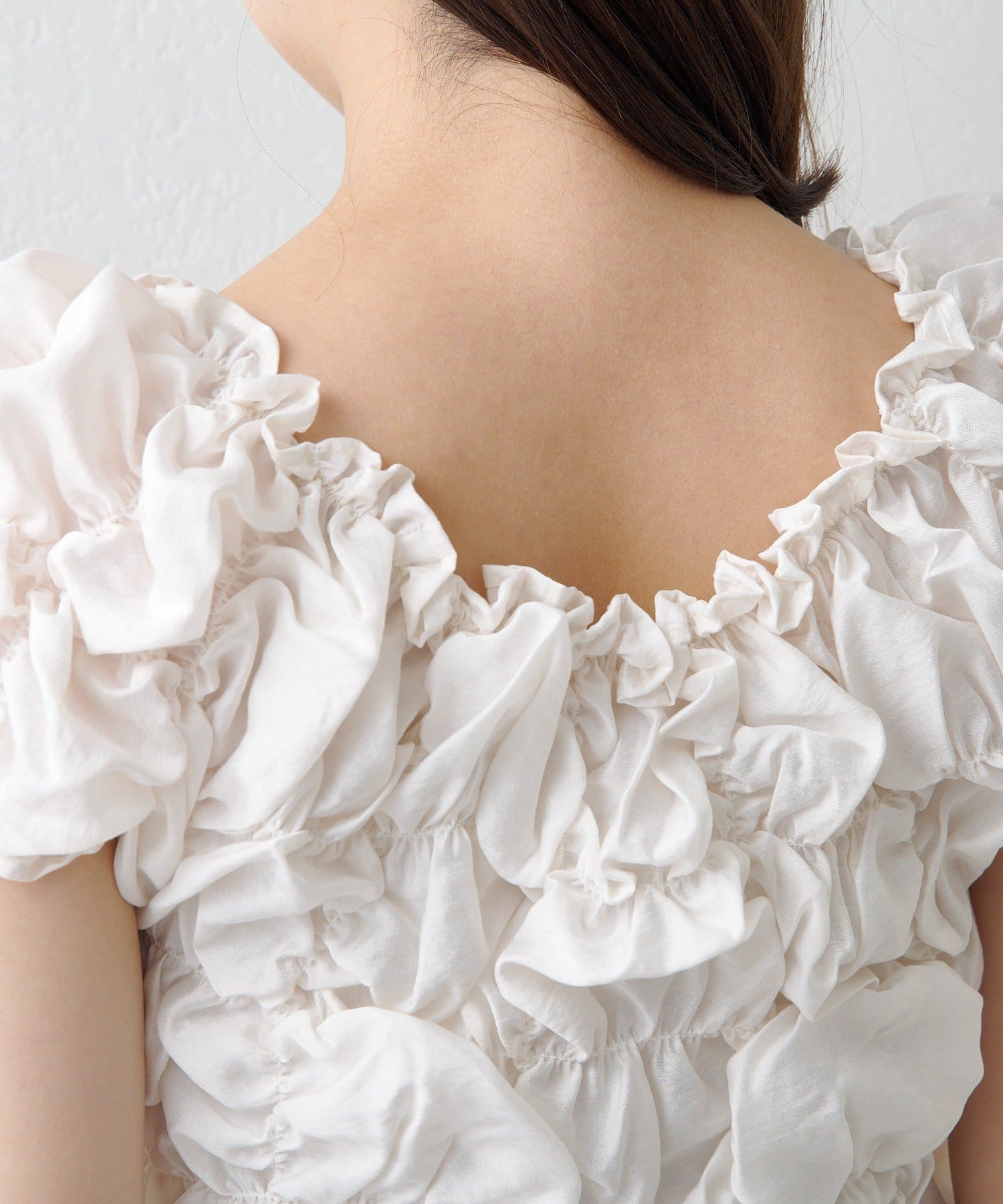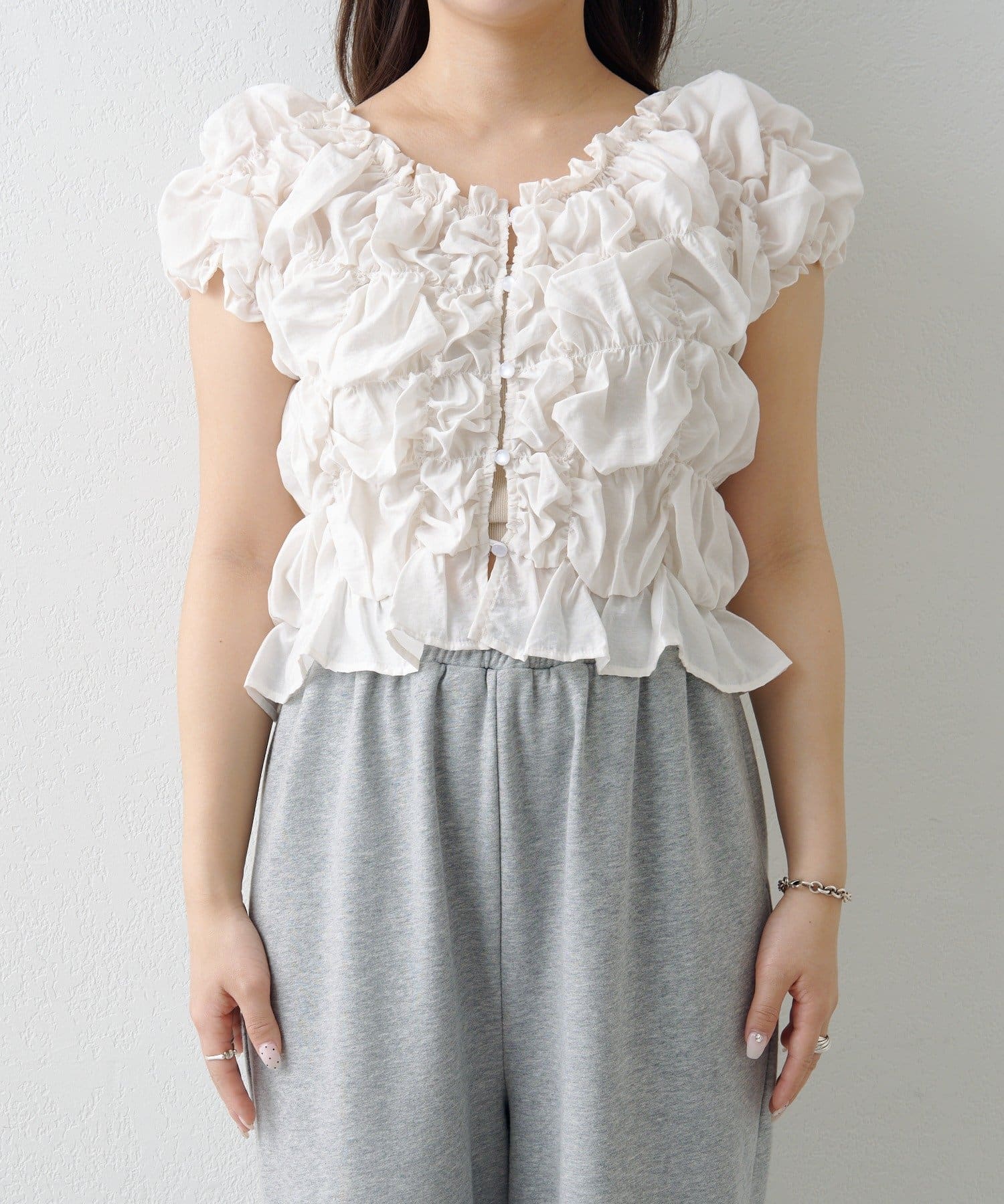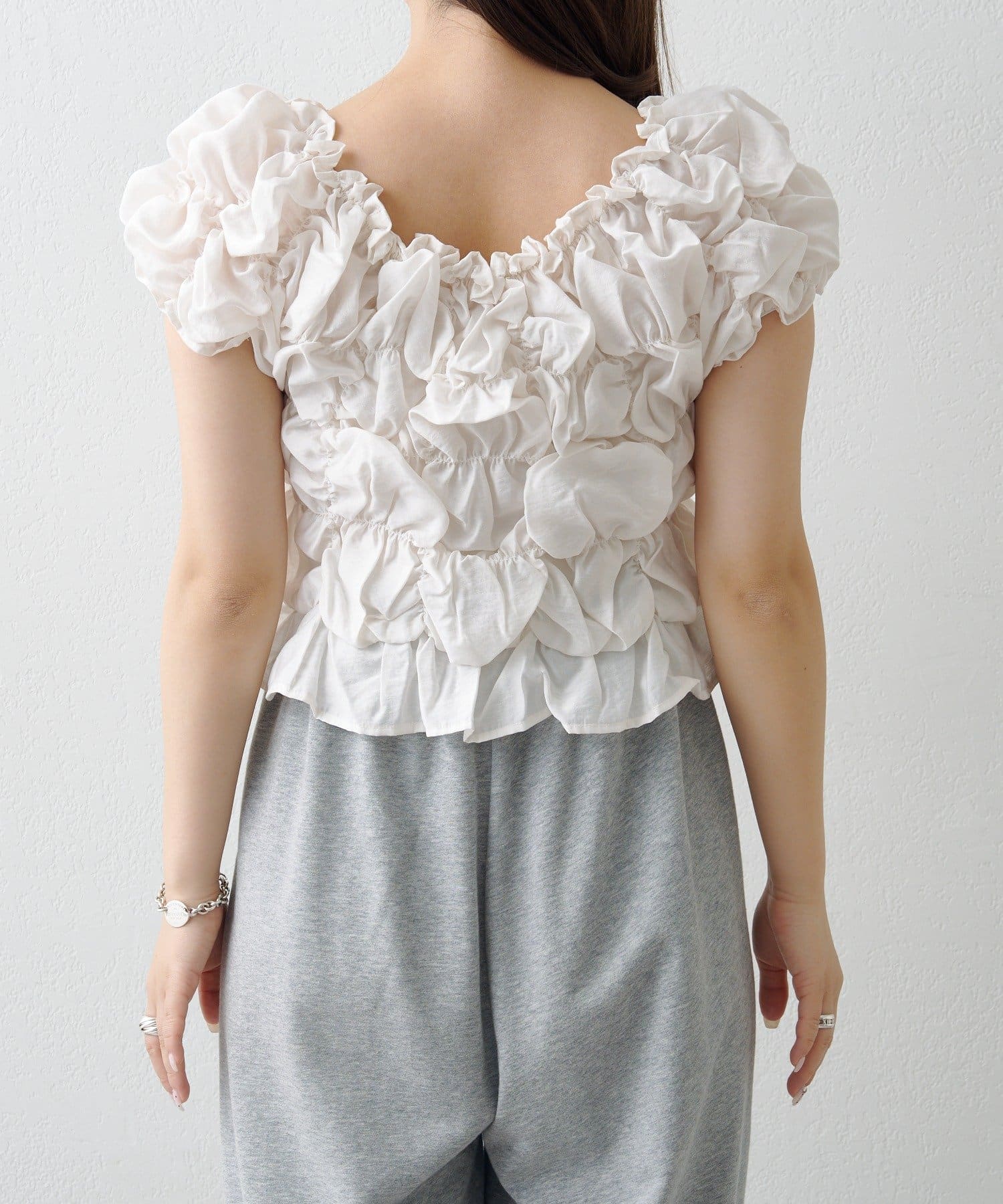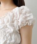ギャザーとフリルが印象的なフェミニンムード漂うブラウス