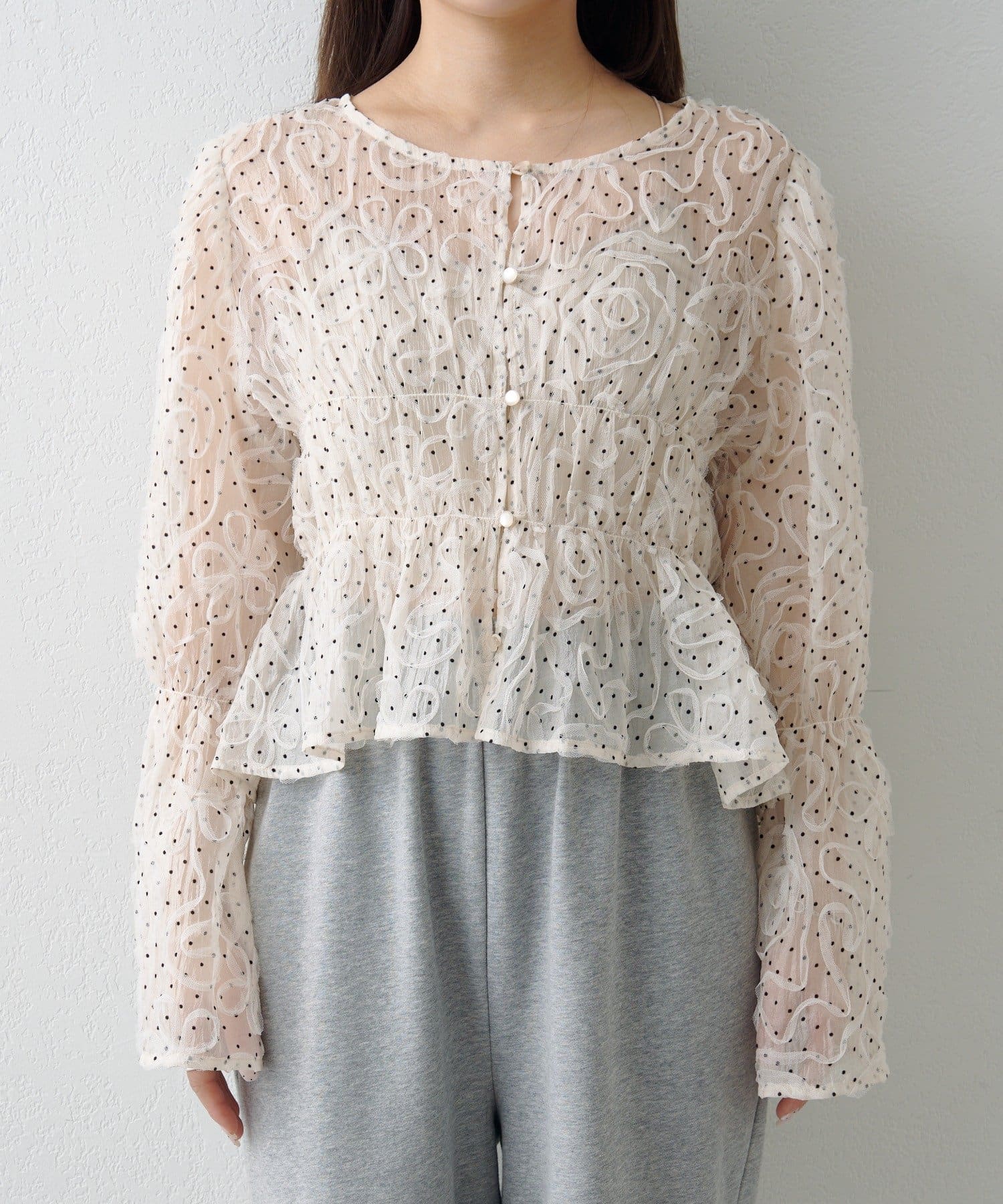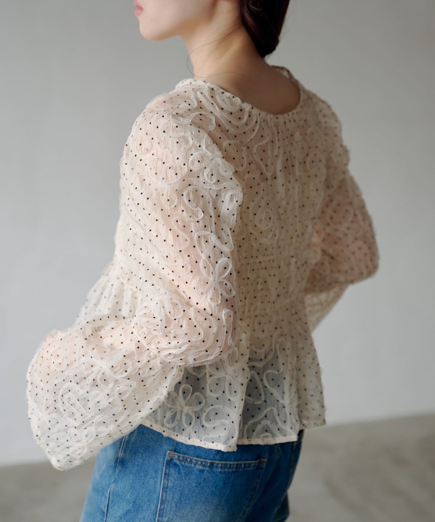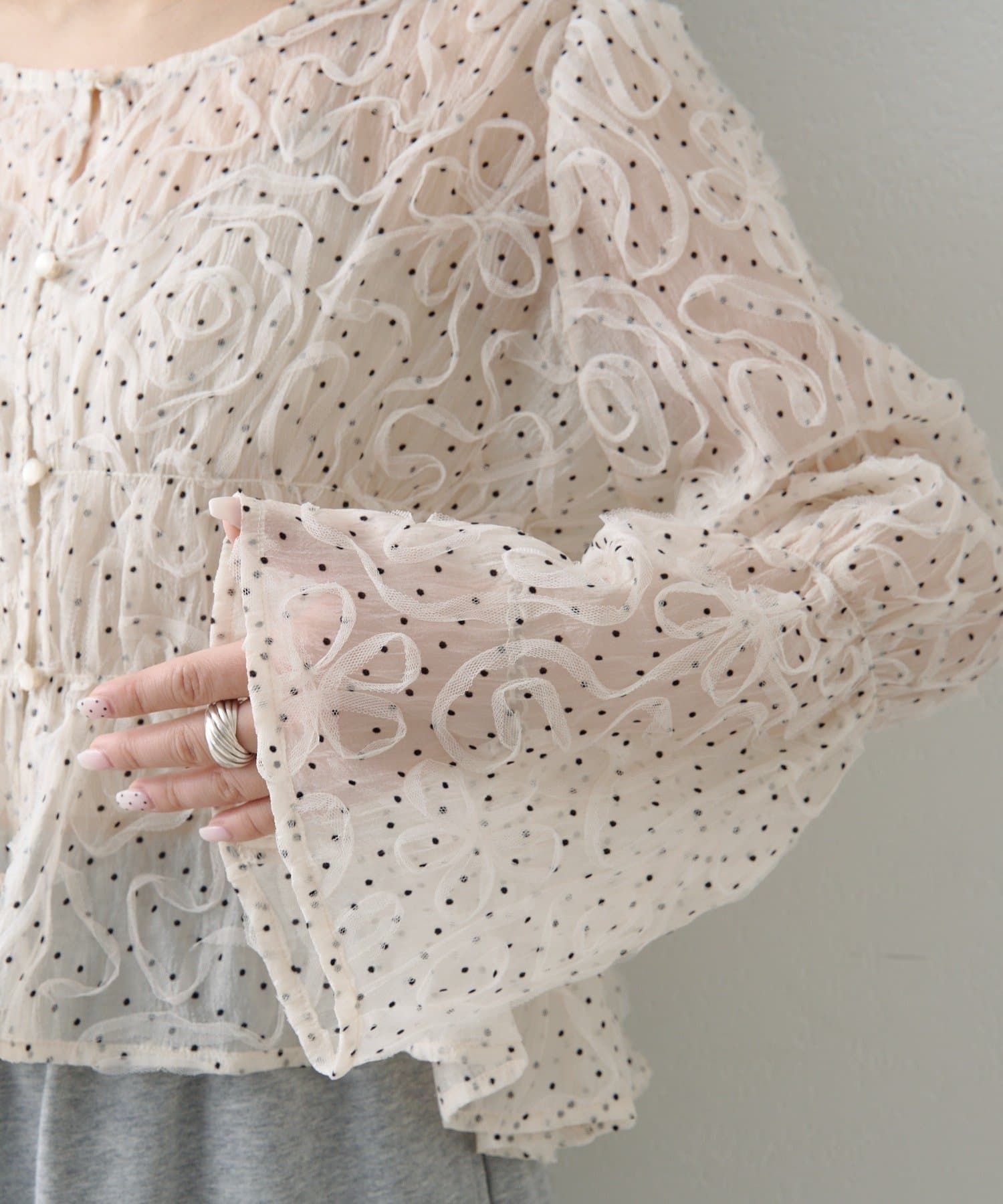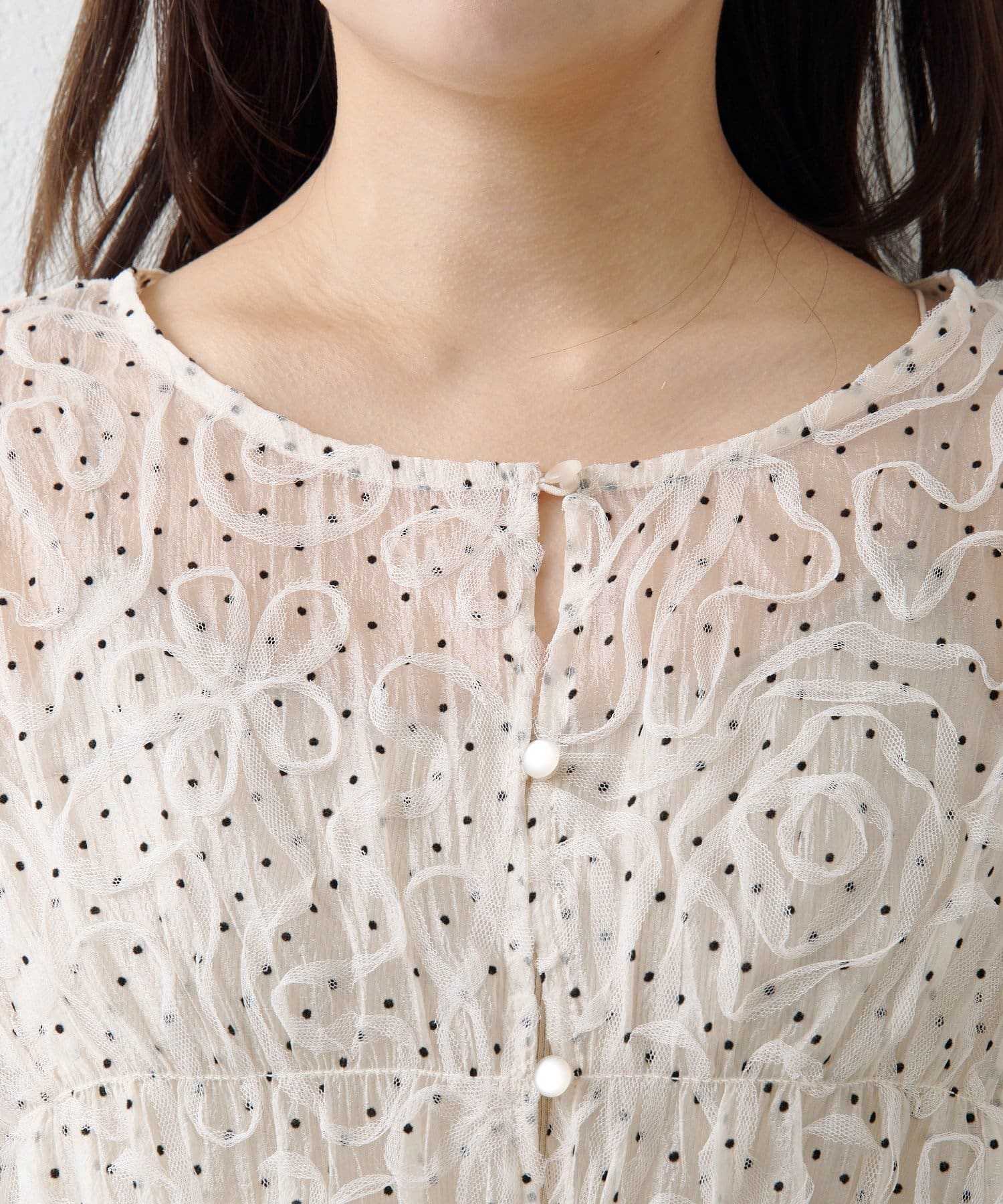 繊細なドット柄にゆるやかなウェーブ刺繍を重ねたチュール素材が魅力のブラウス。
