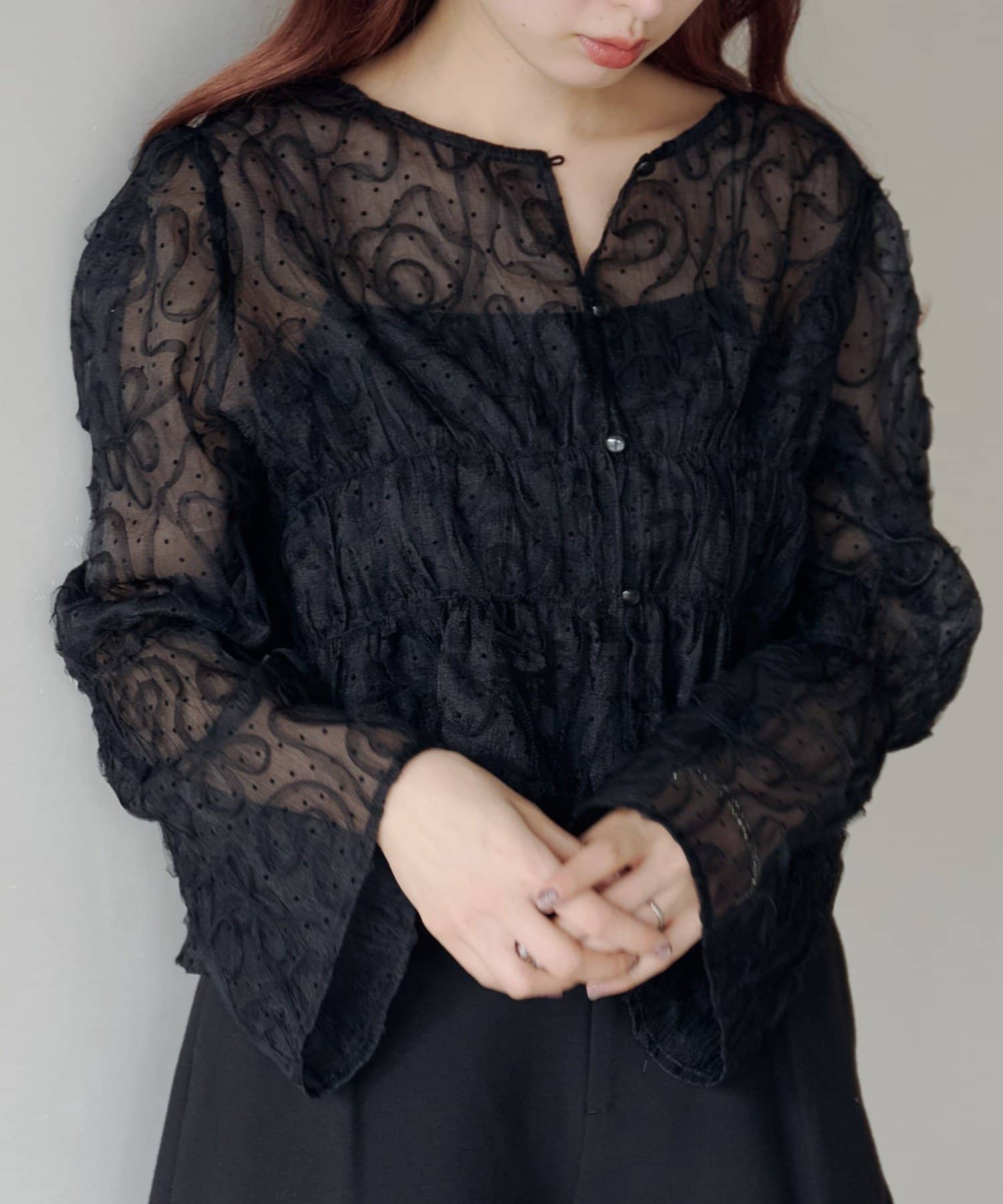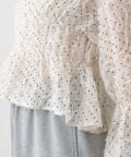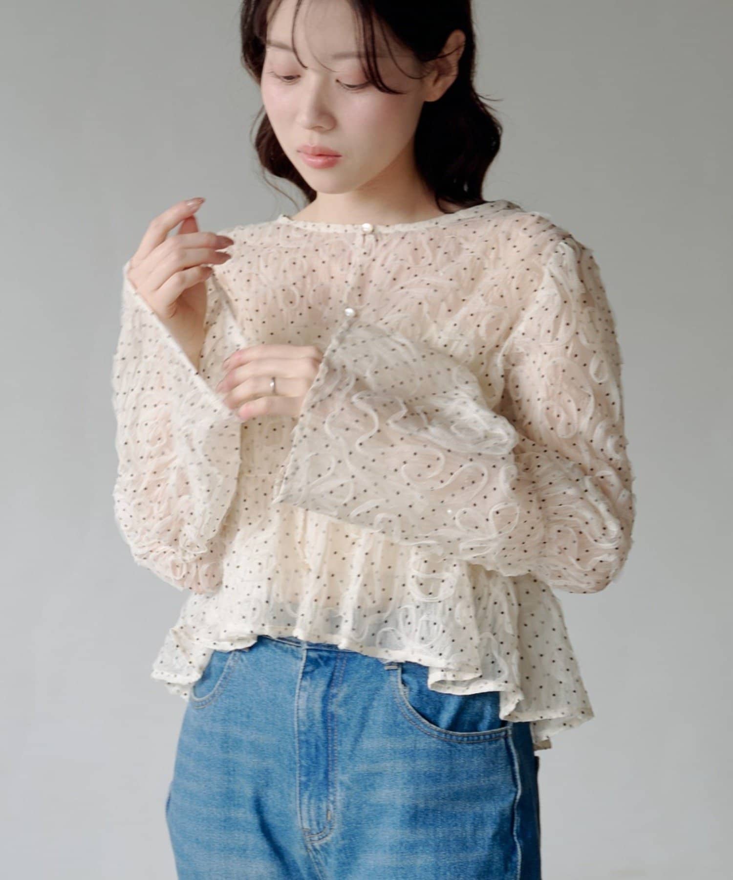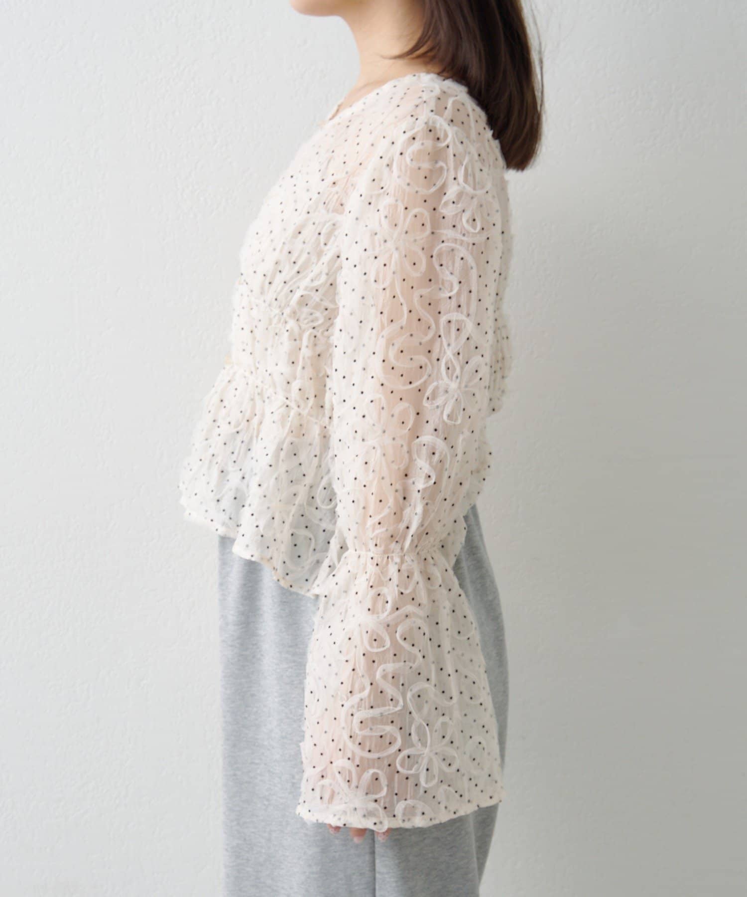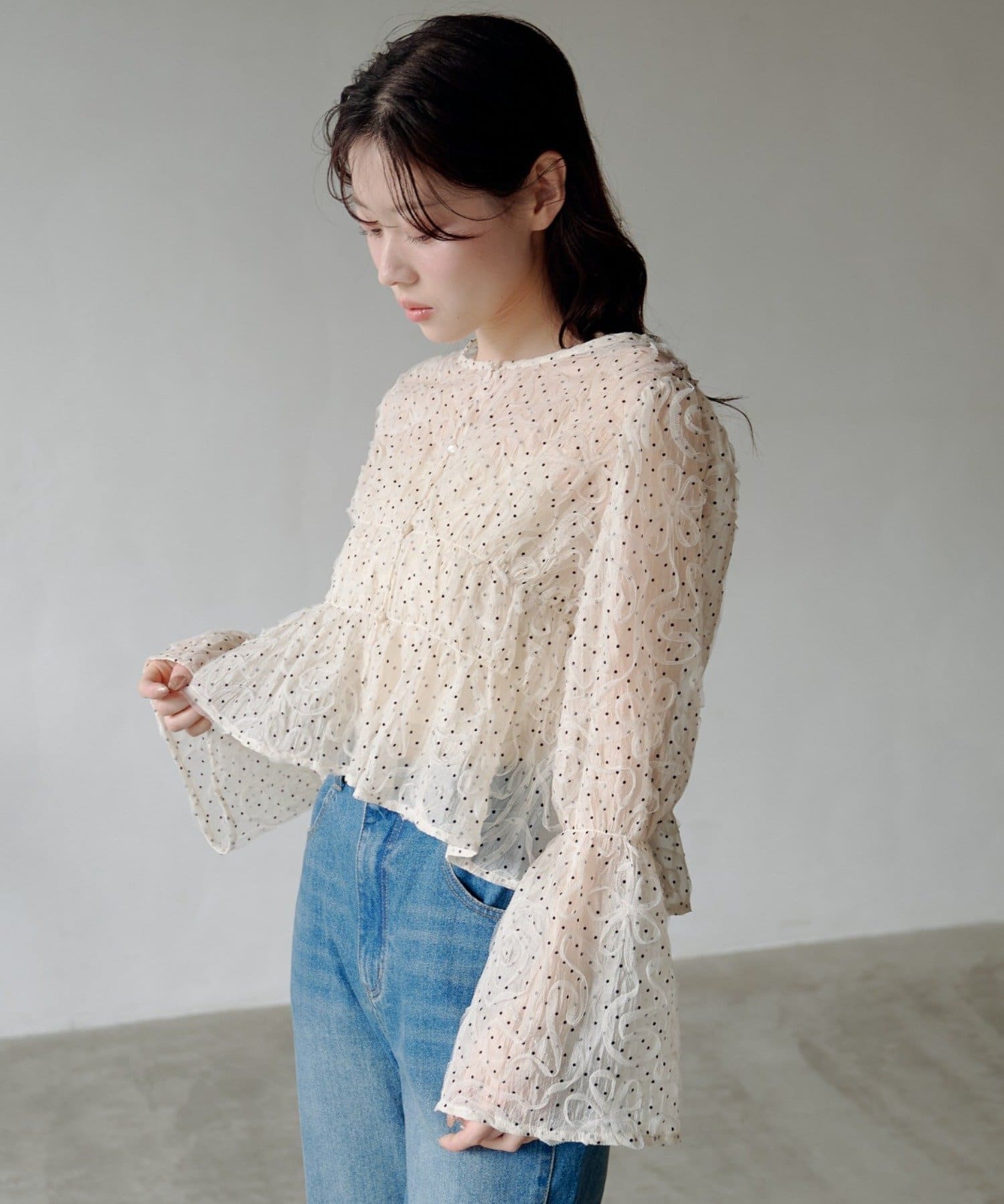 繊細なドット柄にゆるやかなウェーブ刺繍を重ねたチュール素材が魅力のブラウス。