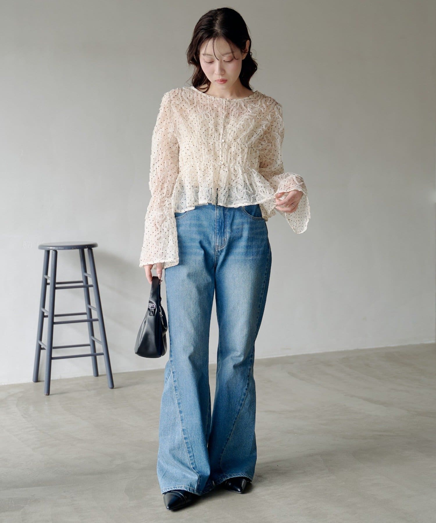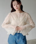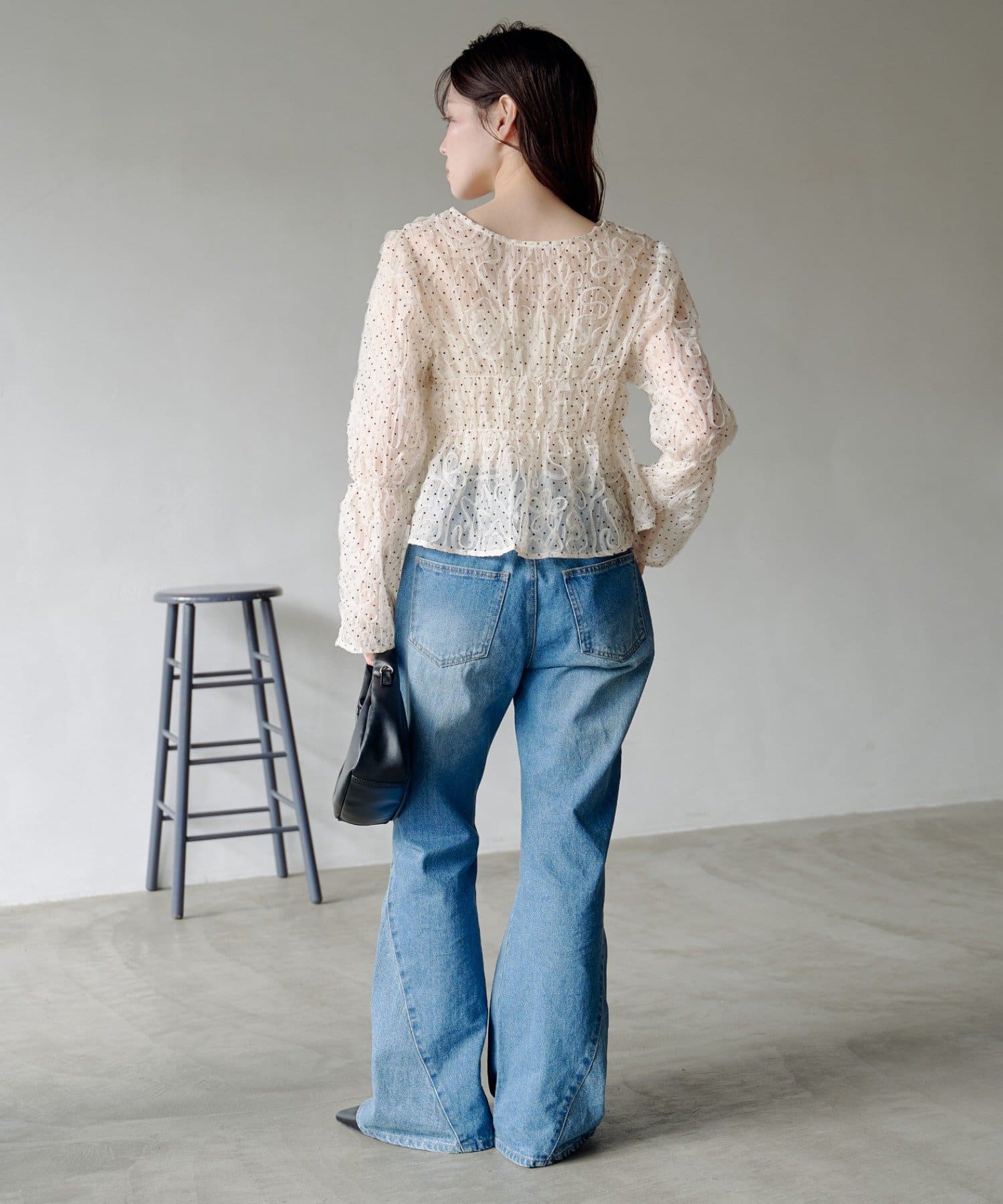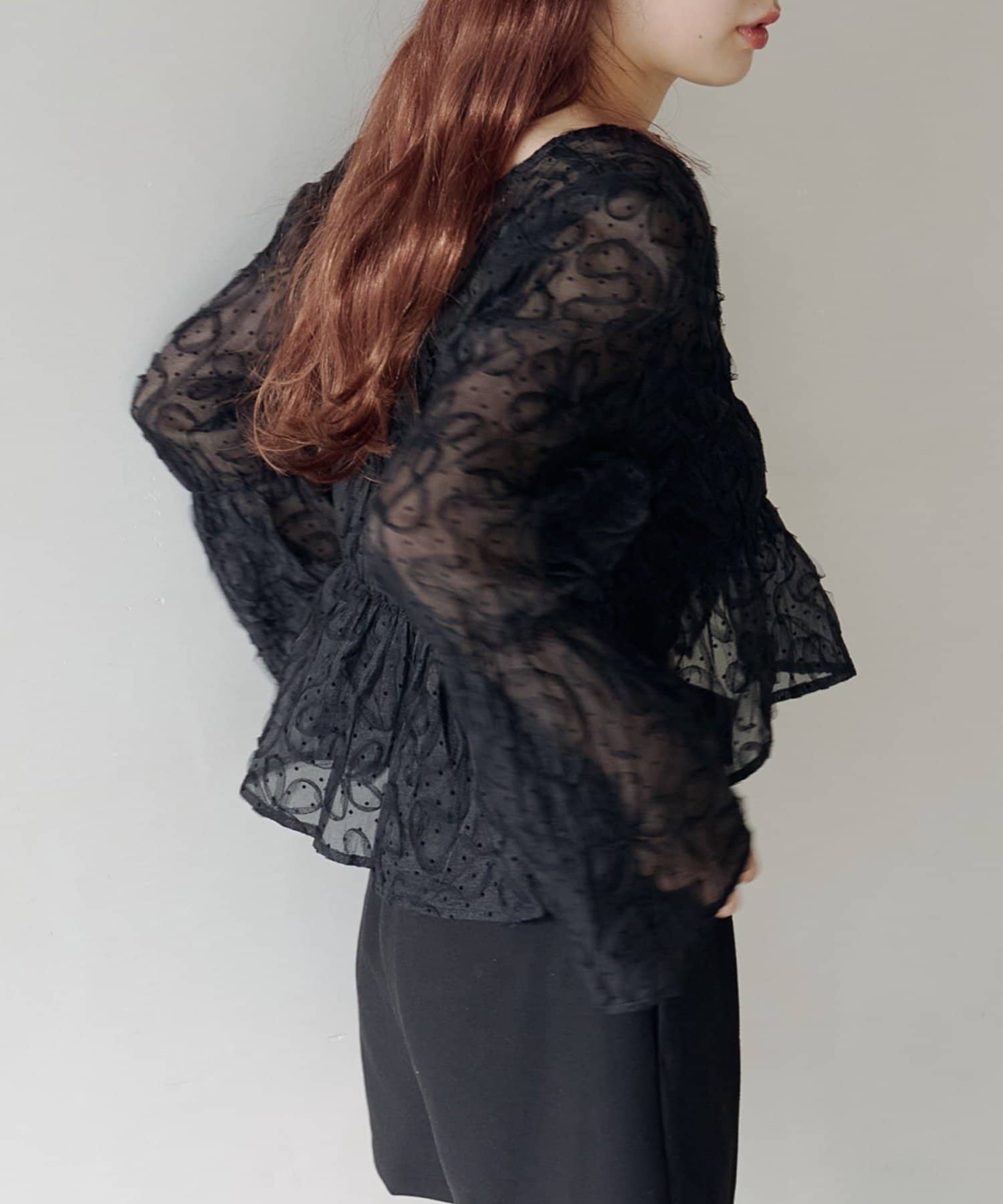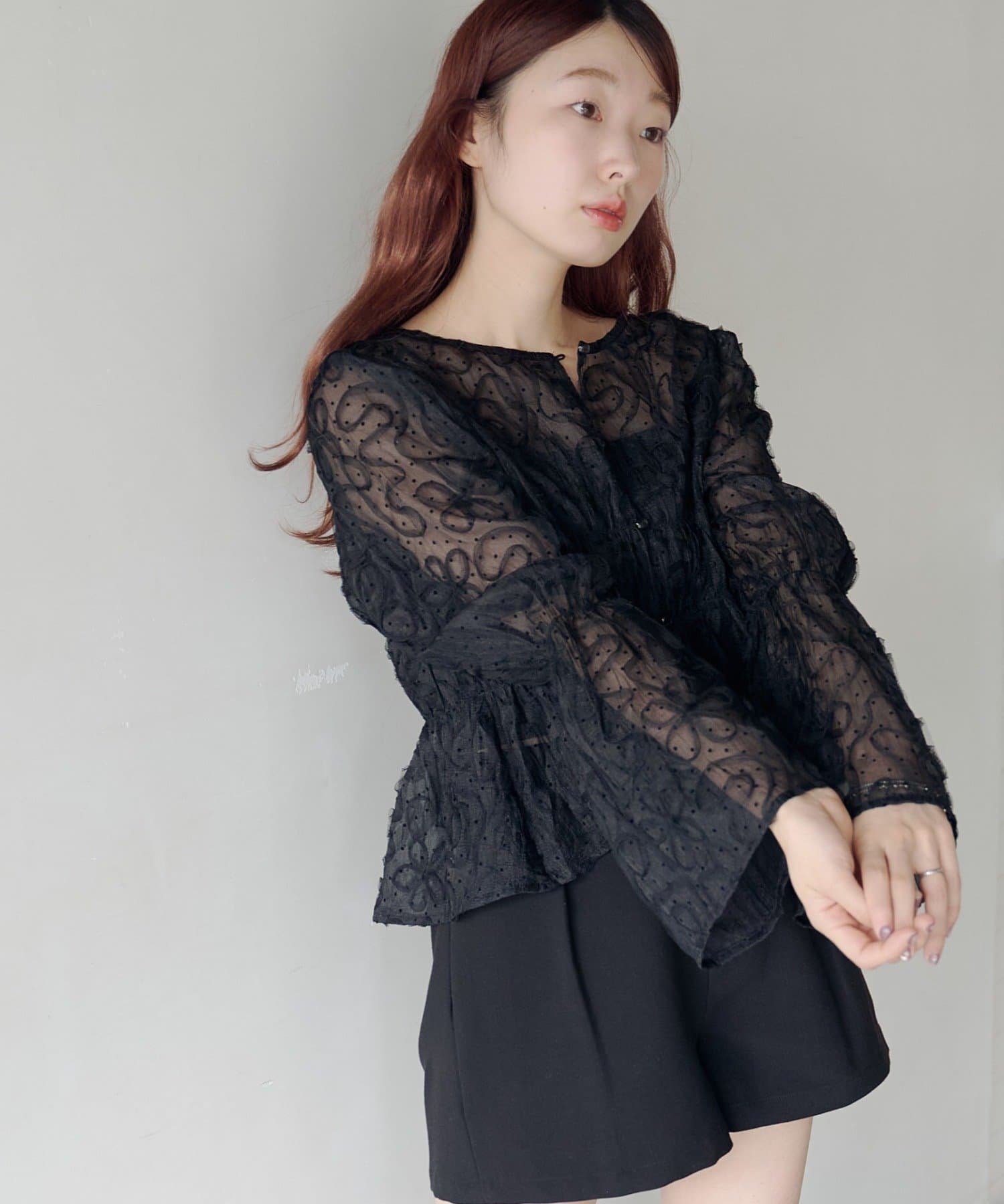 繊細なドット柄にゆるやかなウェーブ刺繍を重ねたチュール素材が魅力のブラウス。