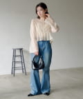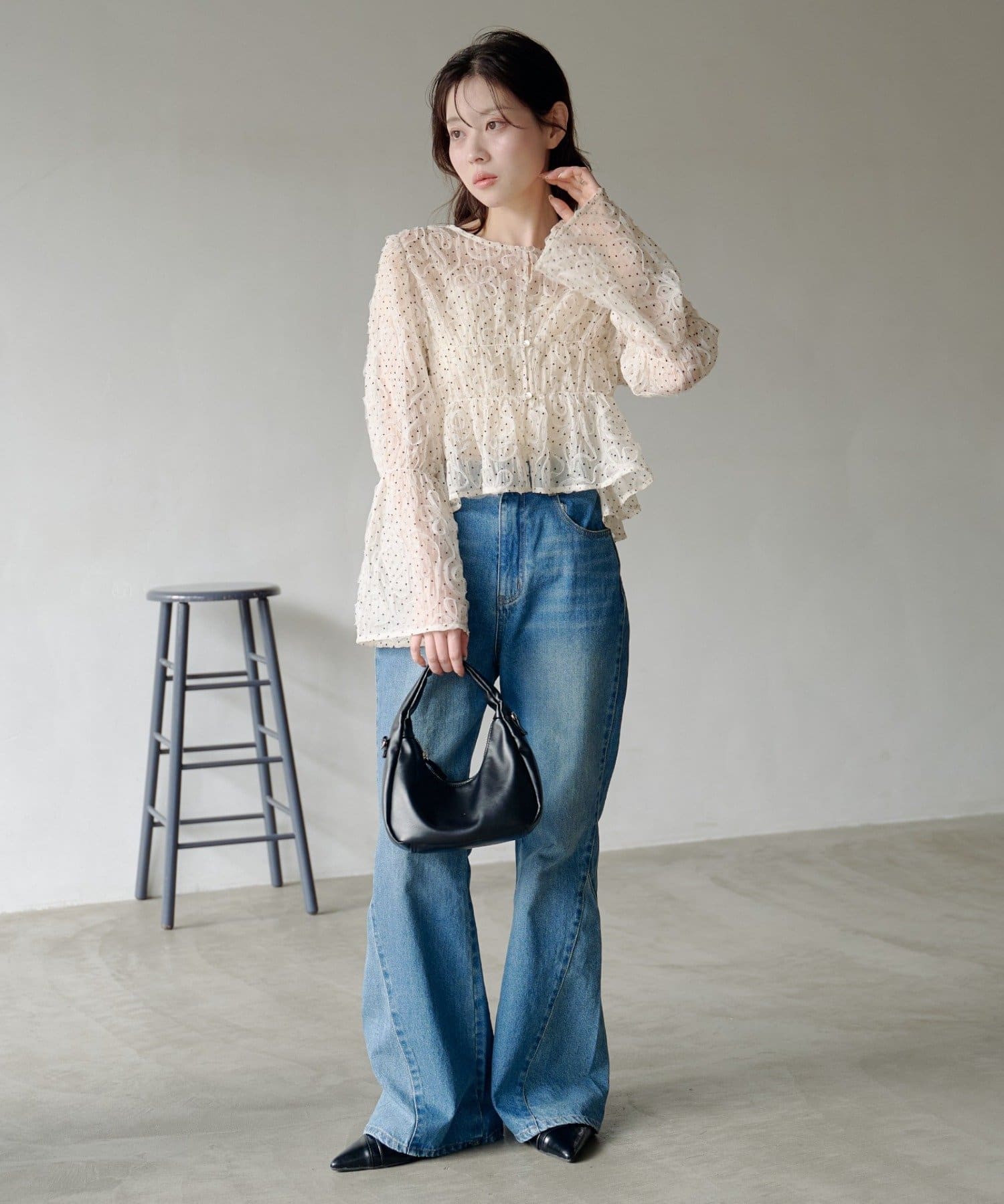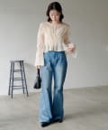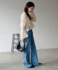 女性らしいデザインなので甘さを抑えたい方はデニム素材やスウェットパンツ合わせがおすすめ。