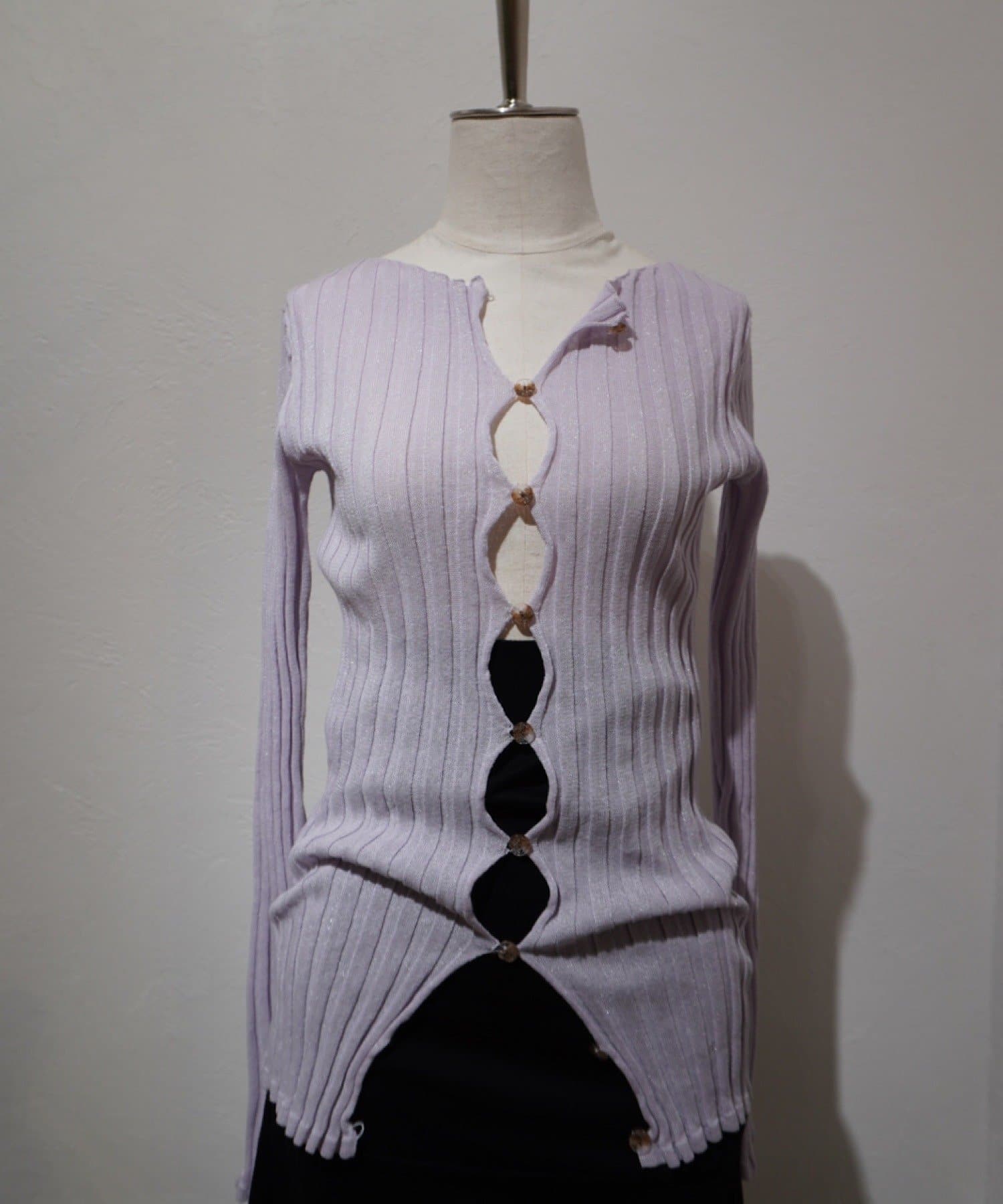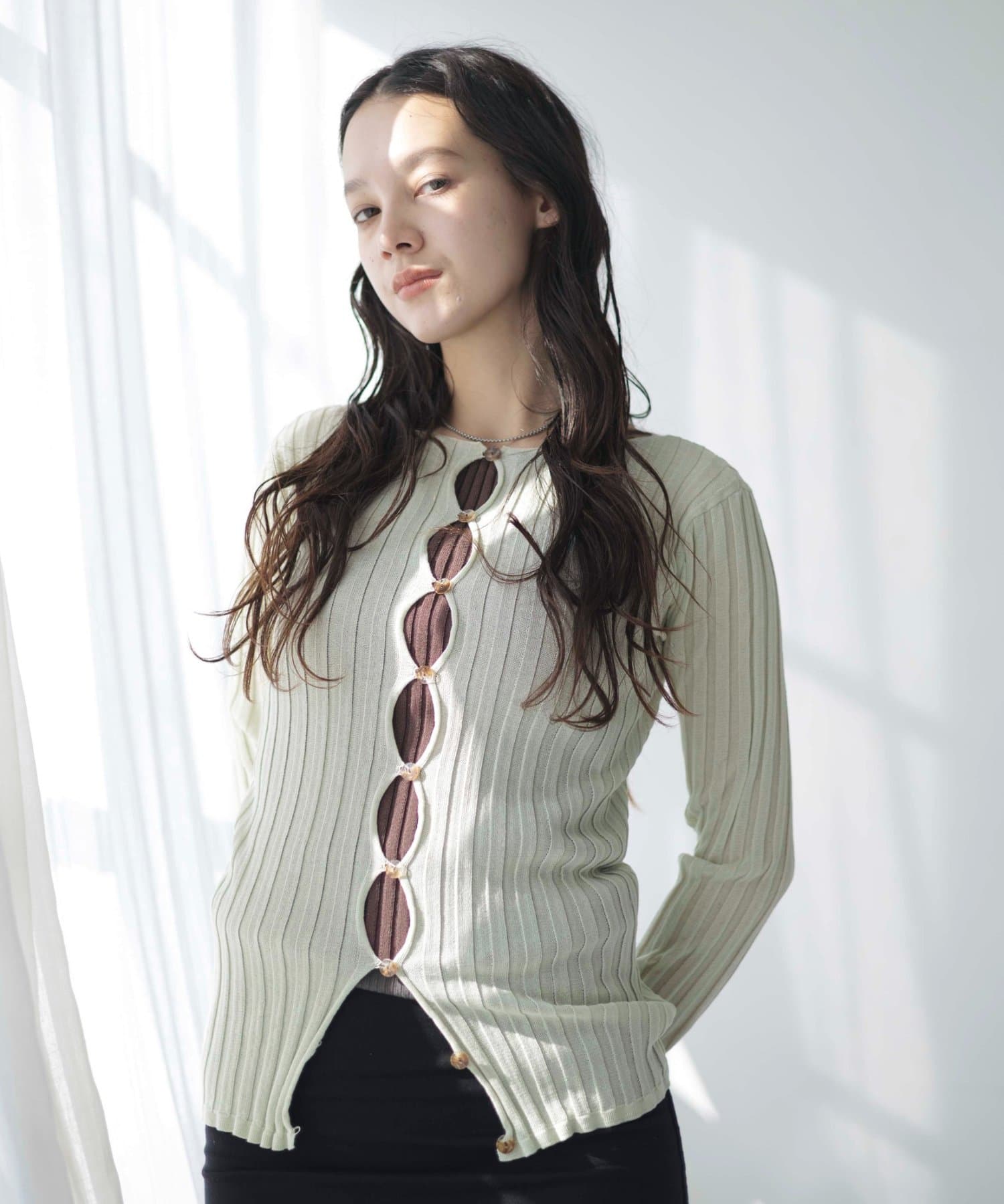 カーディガンですが、コンパクトなトップスのような感覚で着ていただけたらと思います。