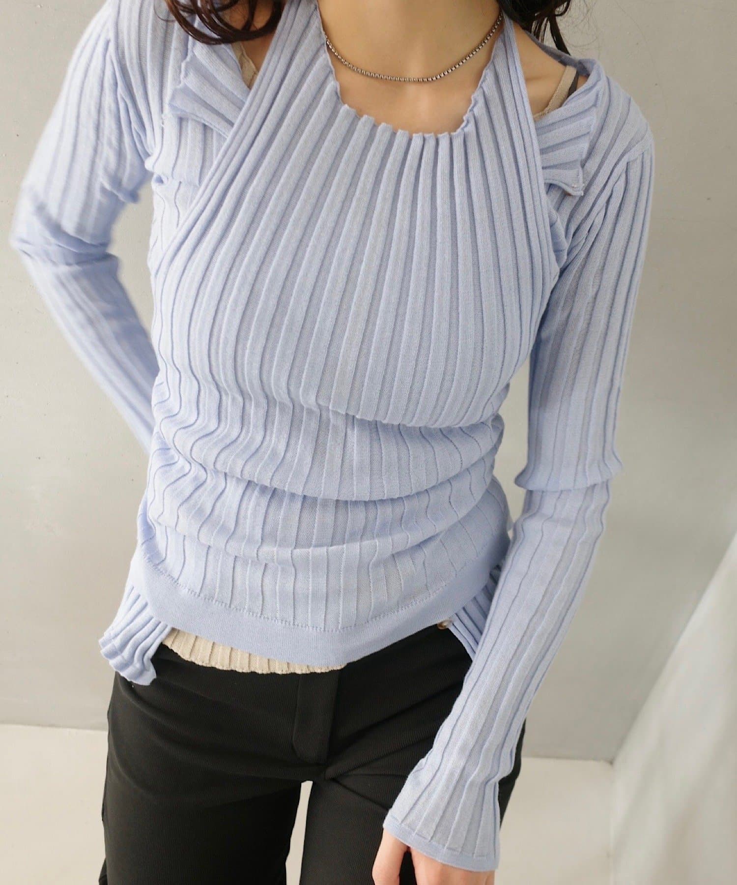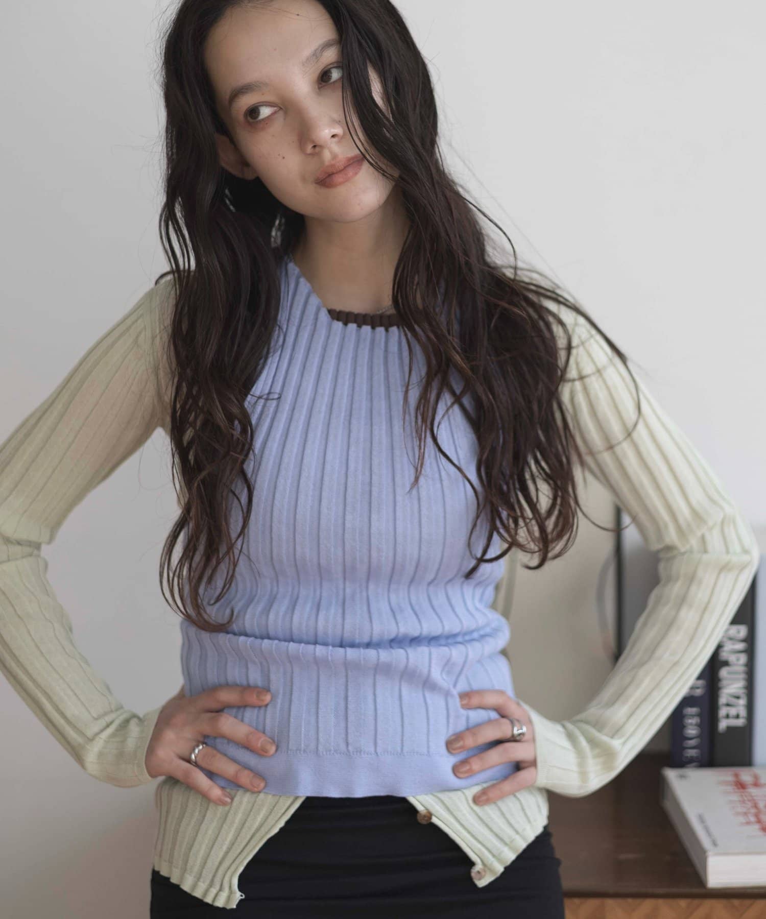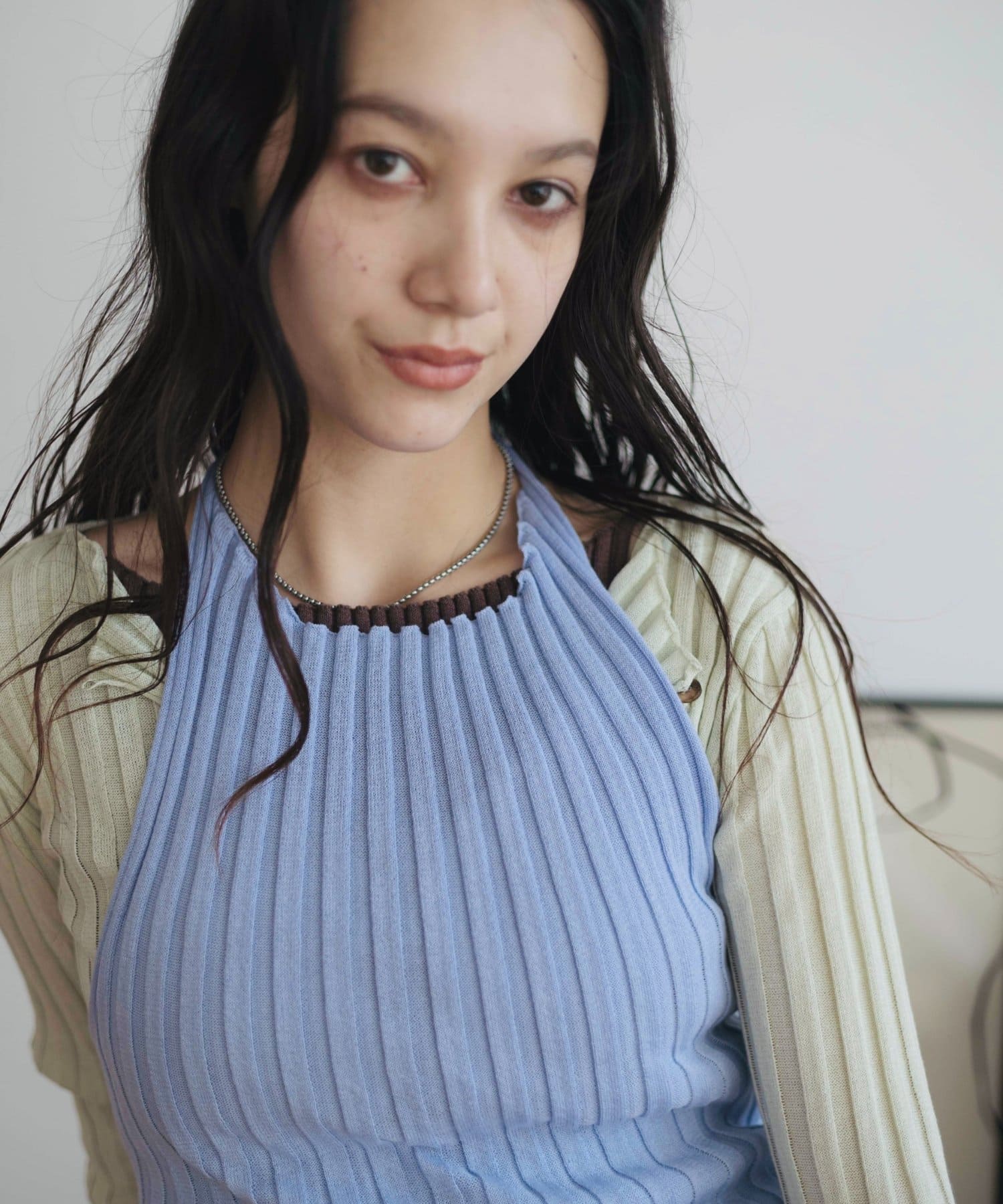 リブシリーズのリブキャミソールをカーディガンの上に重ねレイヤードするのもおすすめです。
