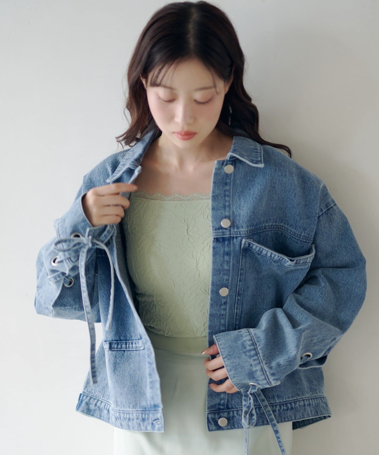 デコルテラインには繊細なレースをあしらい、華奢なストラップで抜け感のある印象に。