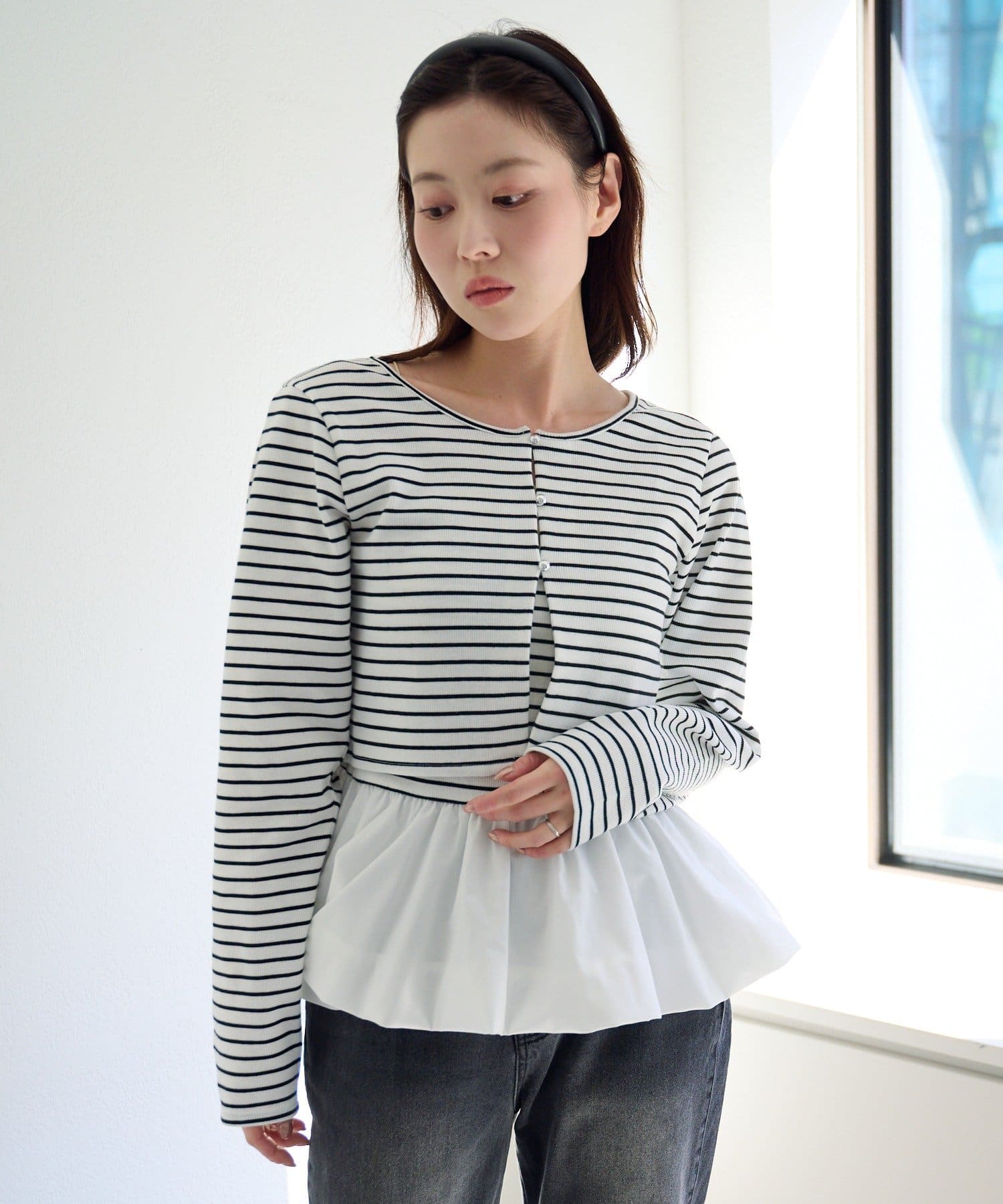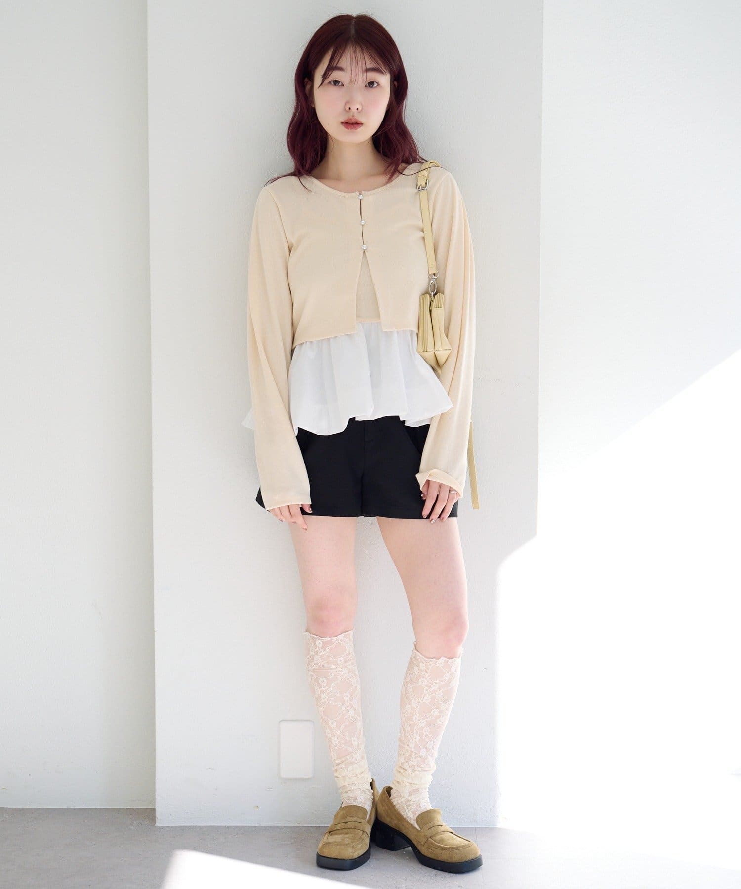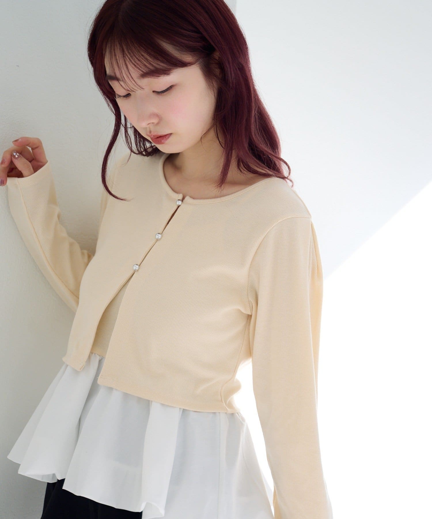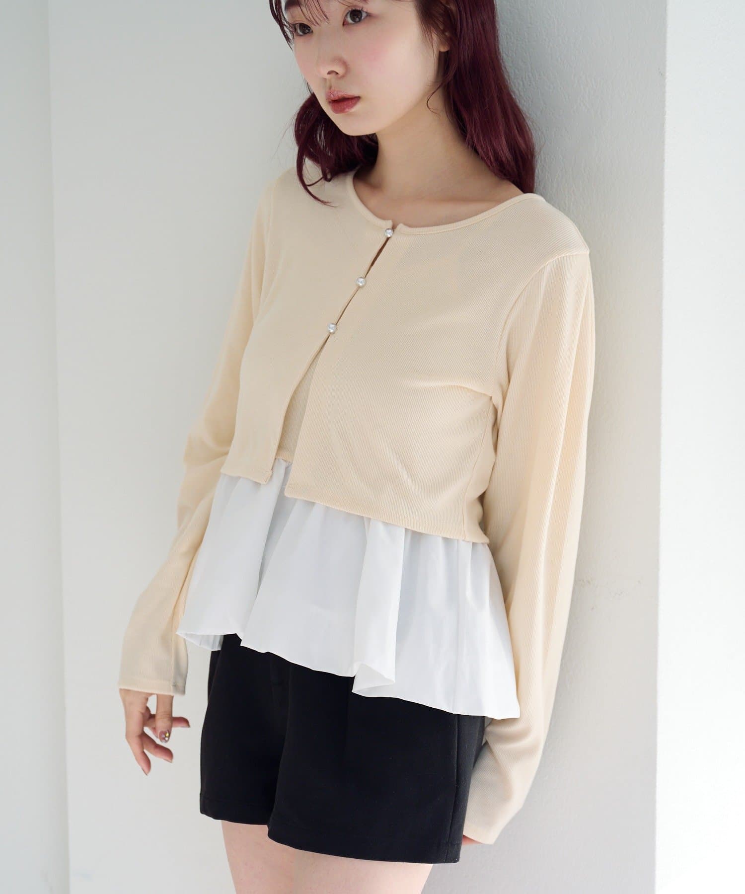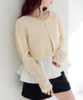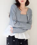 バルーンシルエットのキャミソールと、シンプルなカーディガンがセットになったレイヤードトップス。