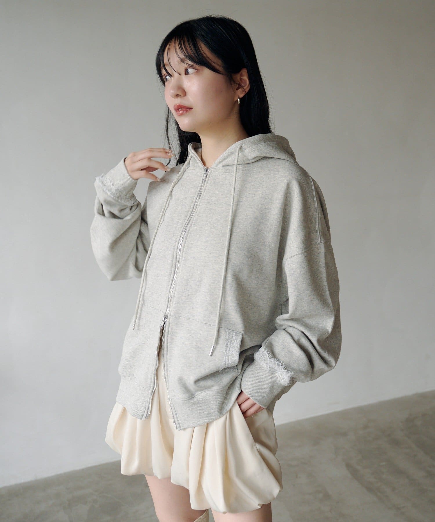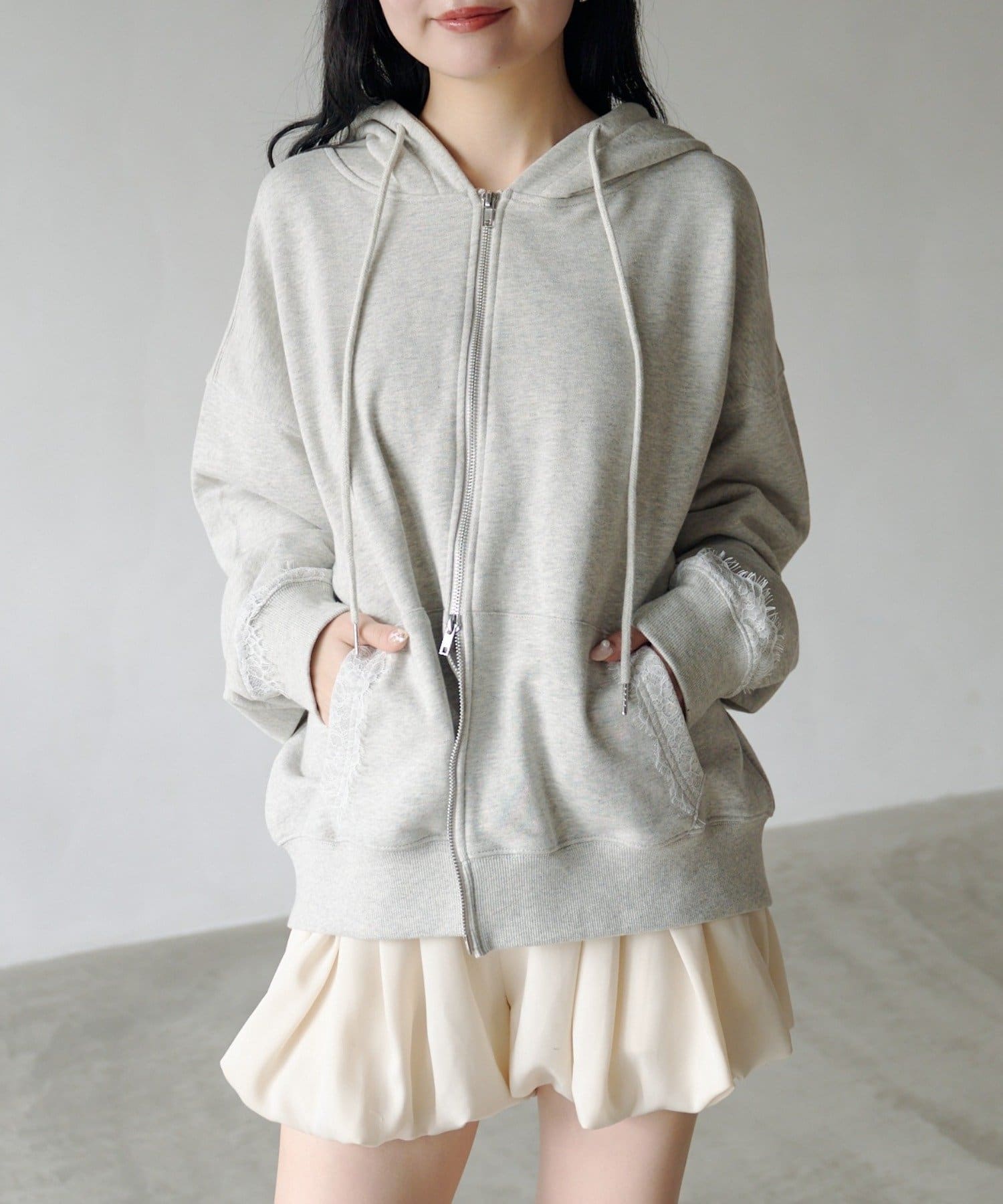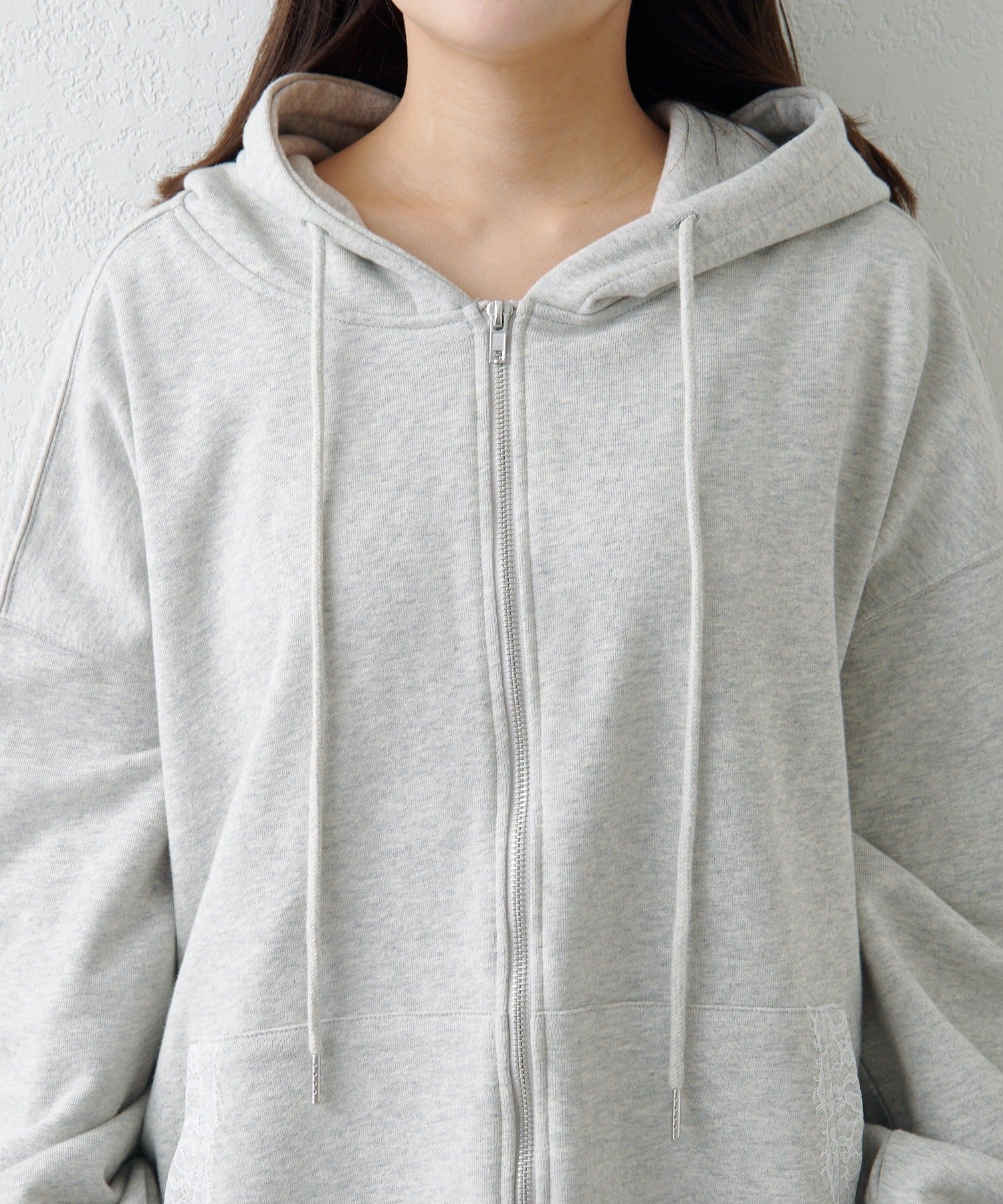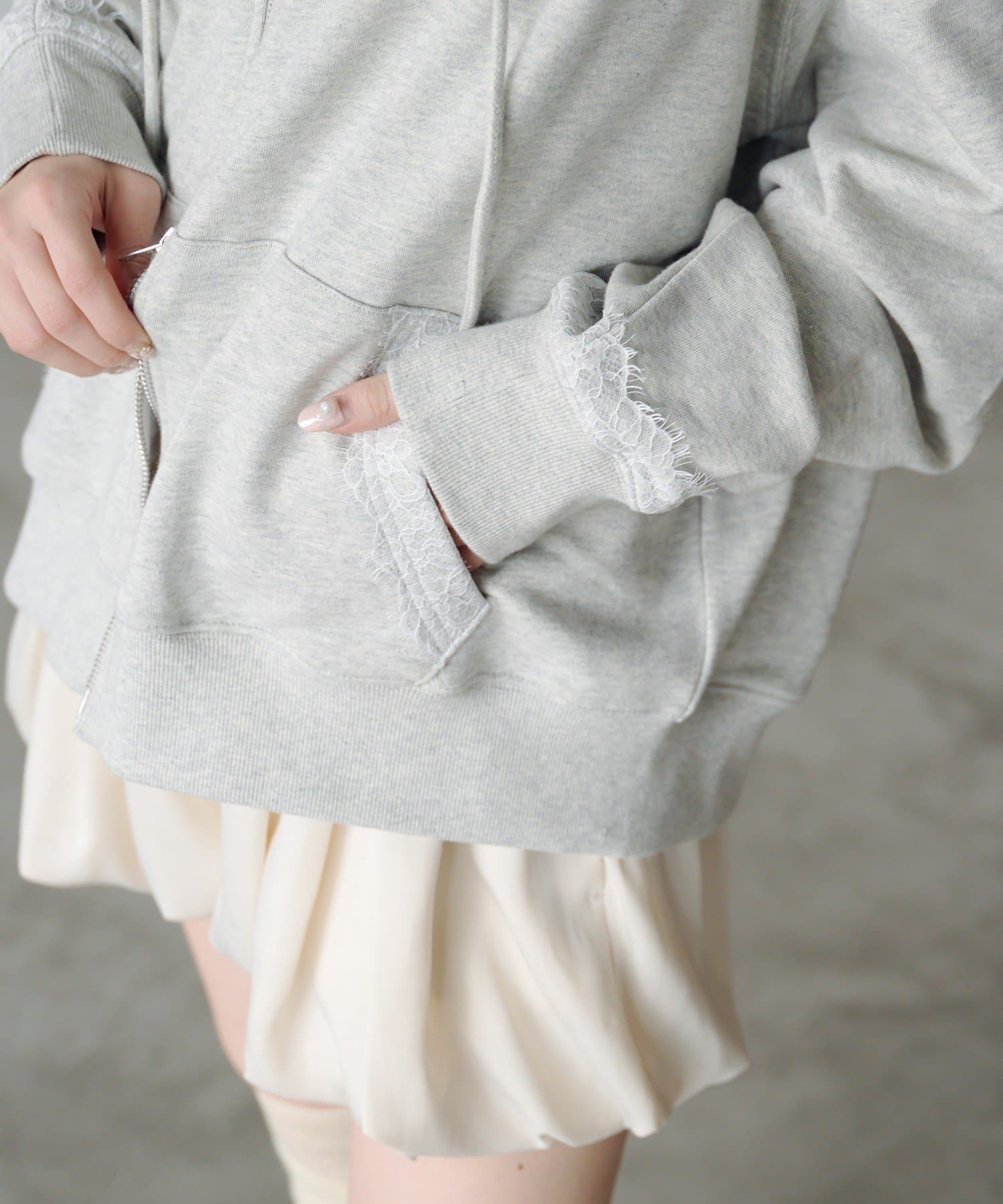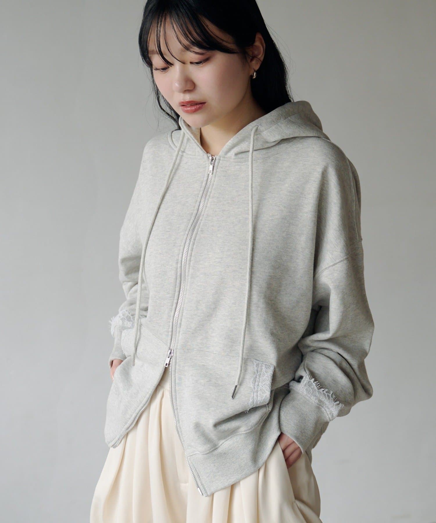 ジップパーカーに、さりげない繊細なレースがポイント。