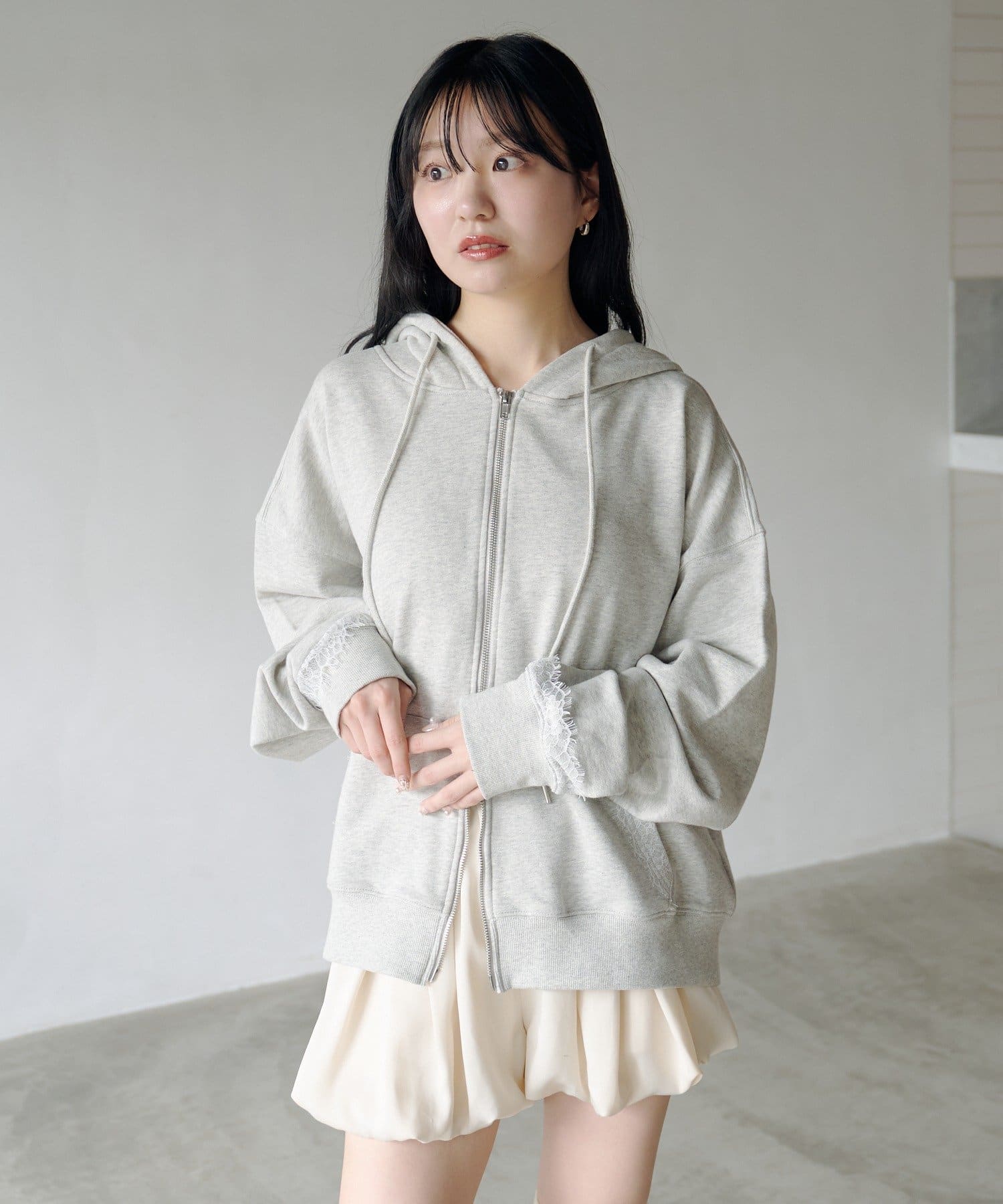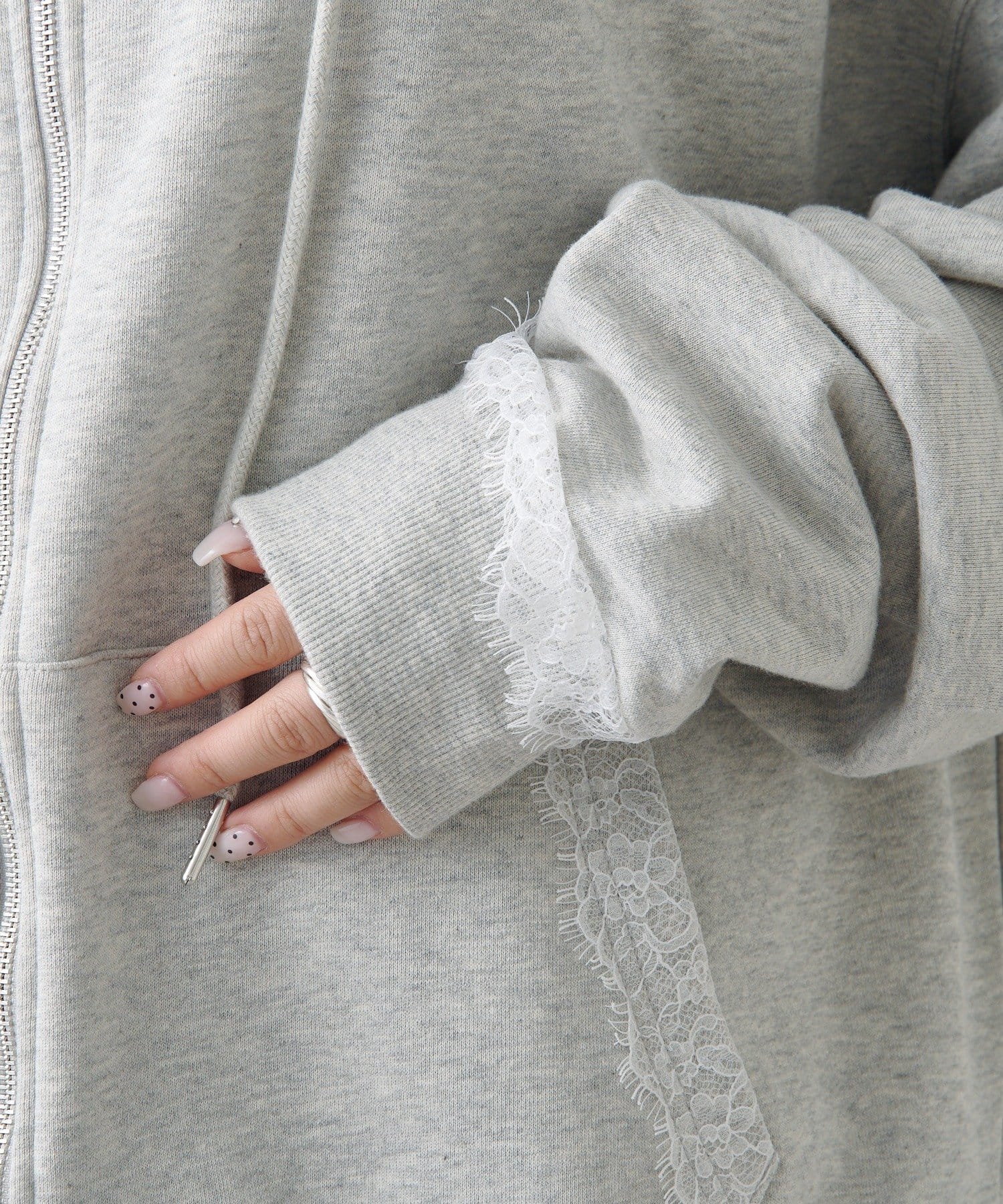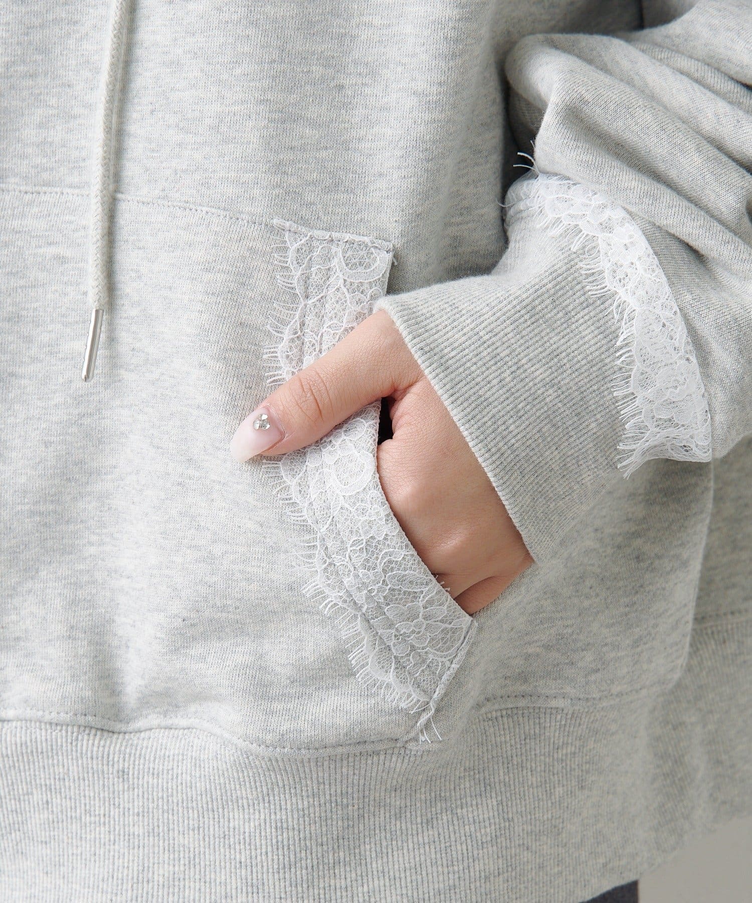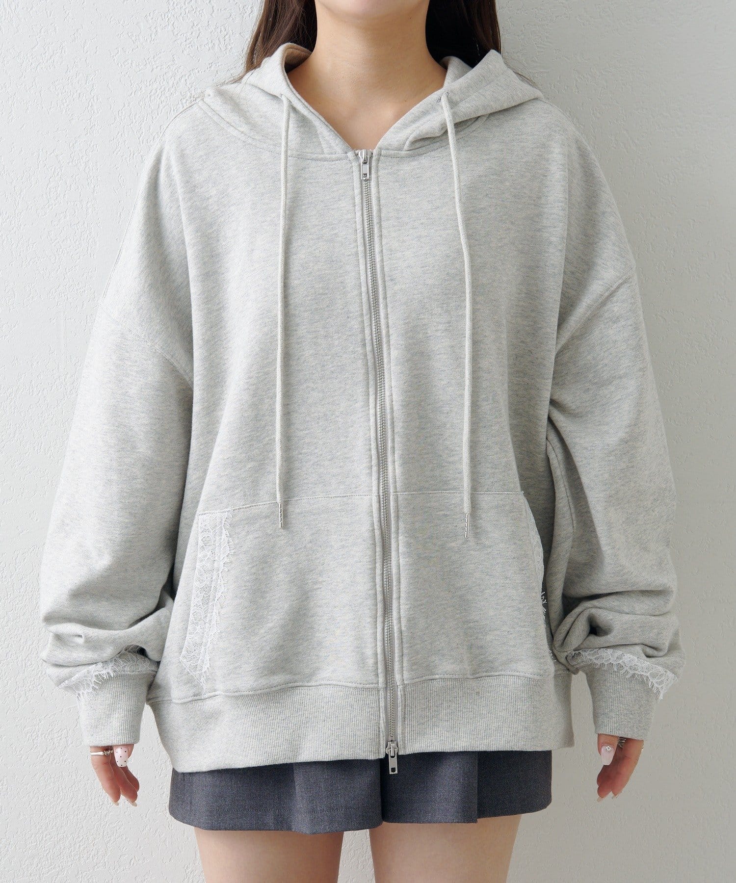 ジップパーカーに、さりげない繊細なレースがポイント。