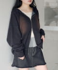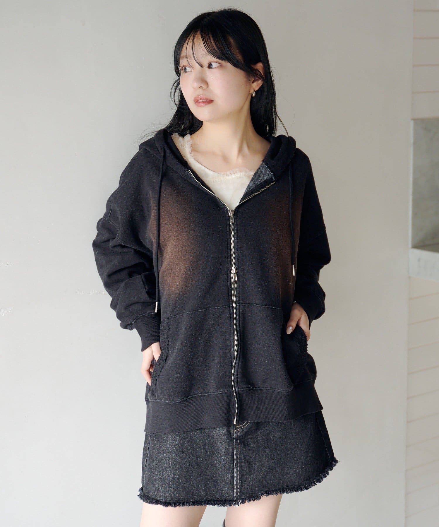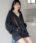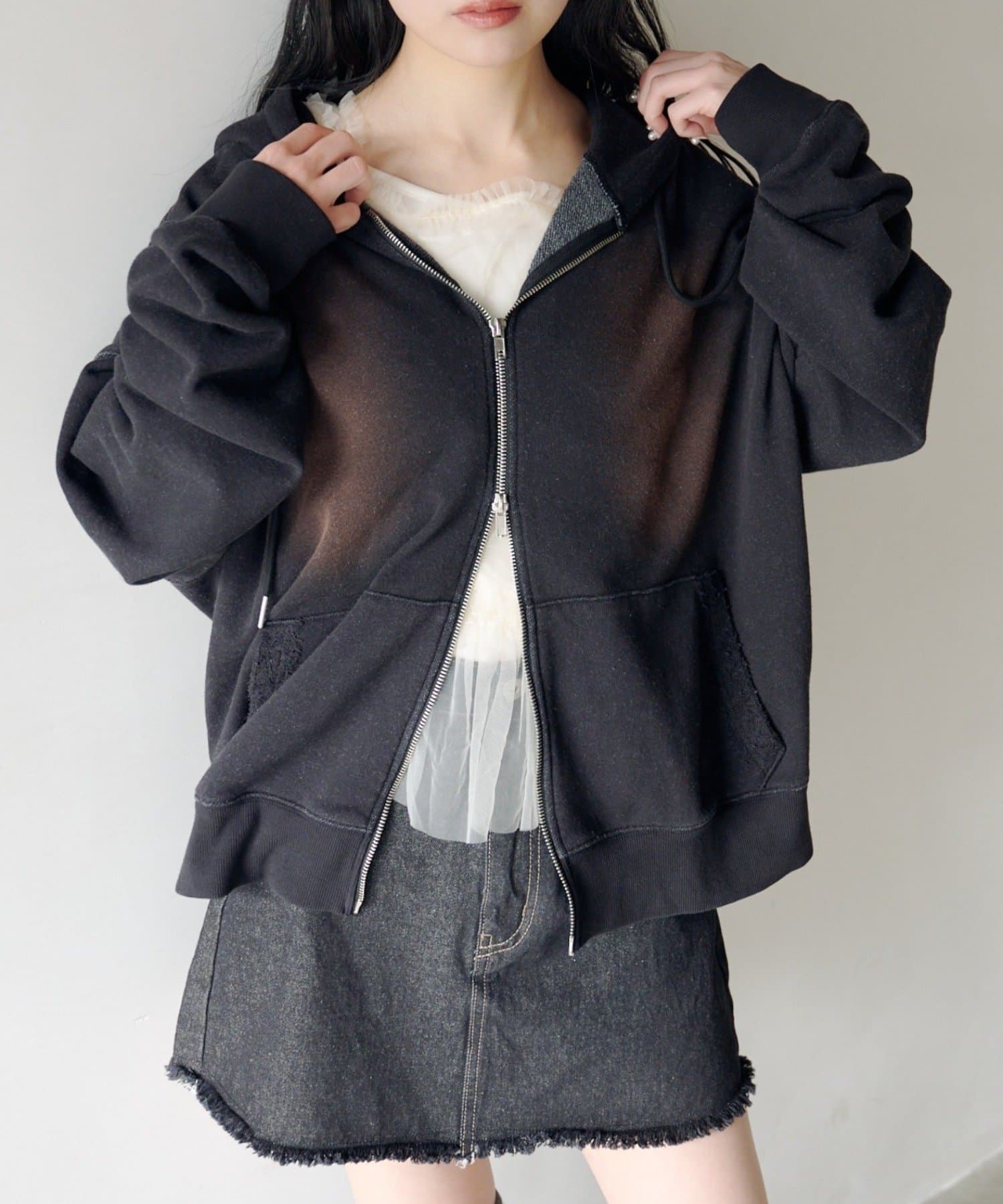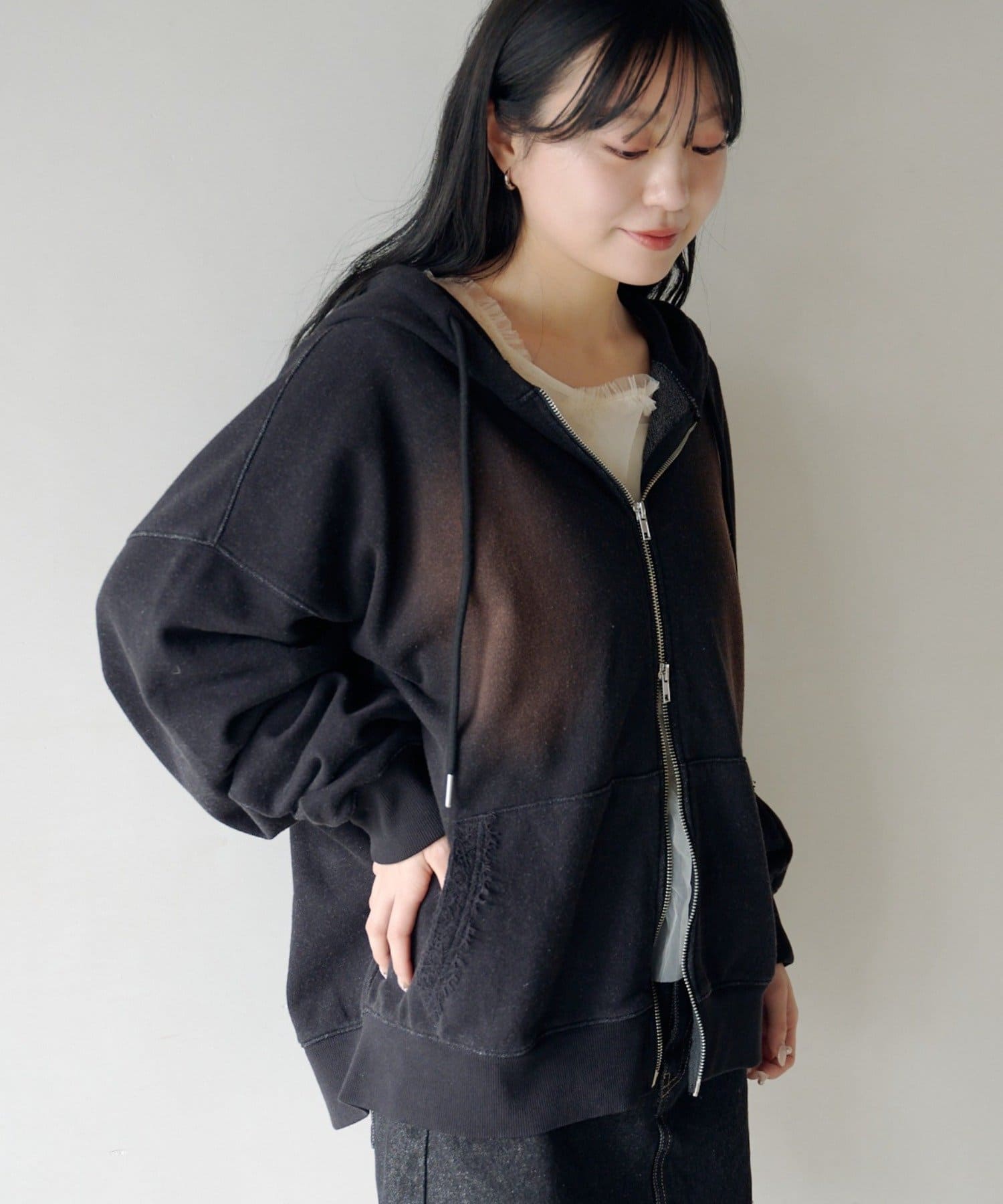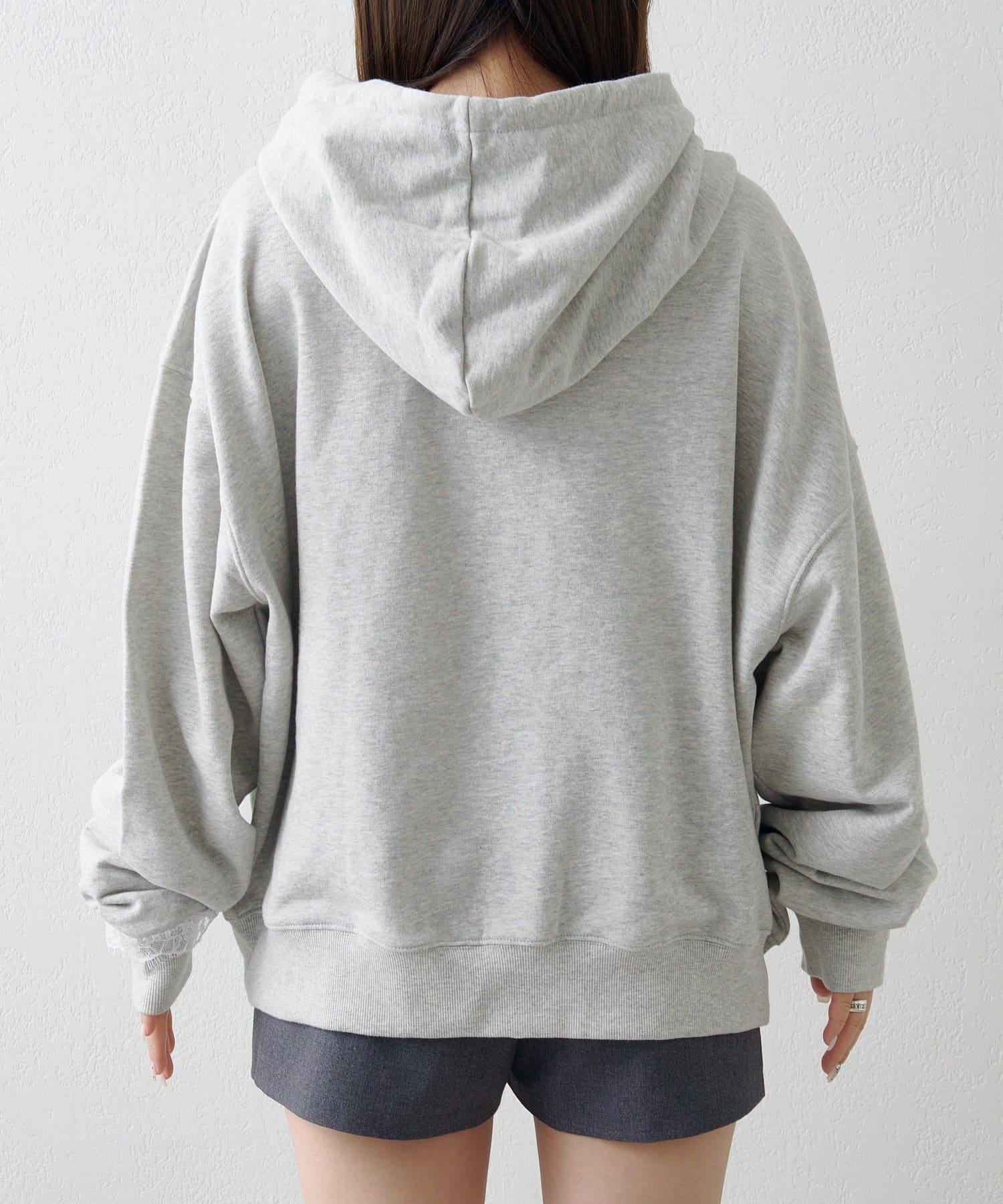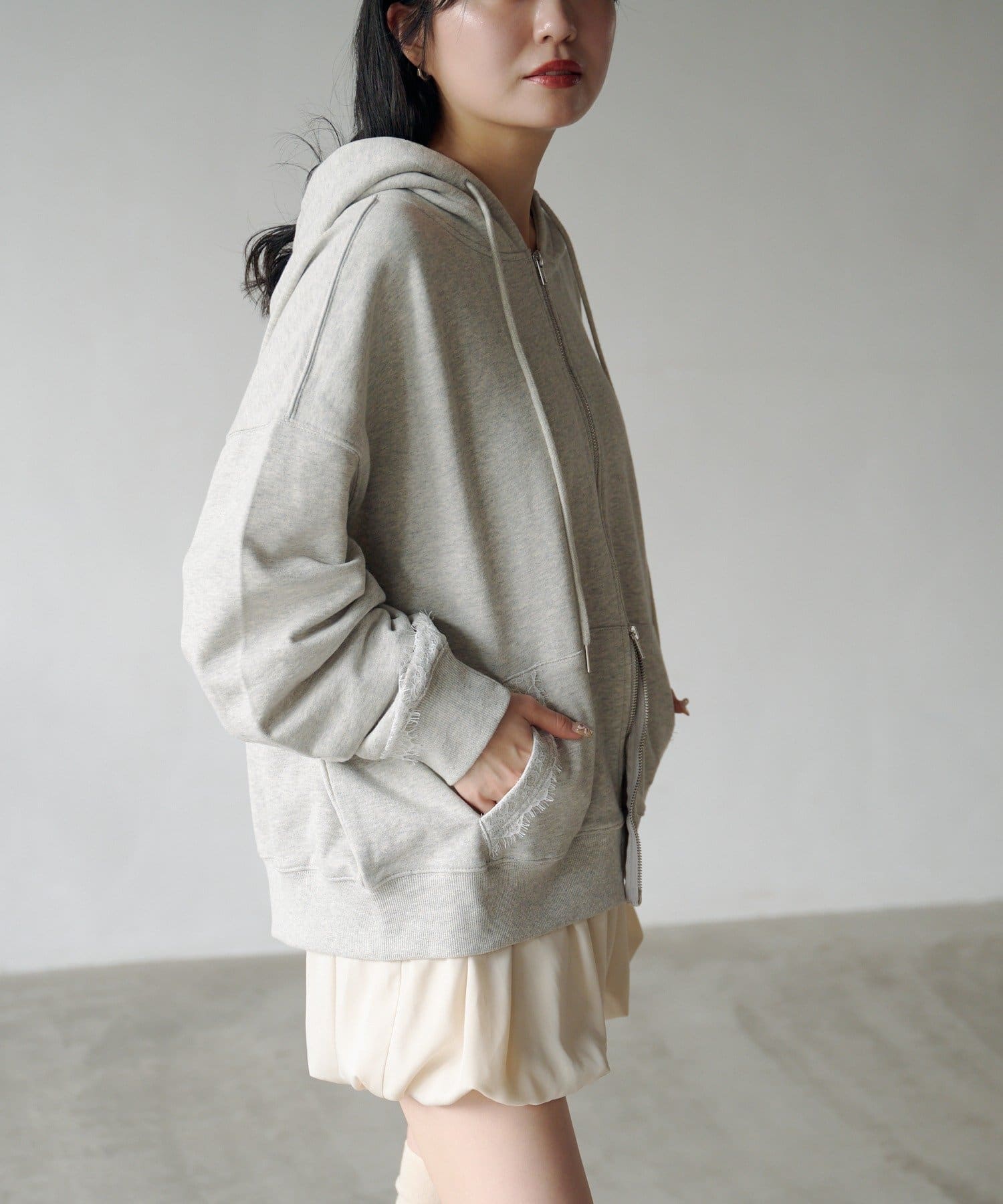 ジップパーカーに、さりげない繊細なレースがポイント。