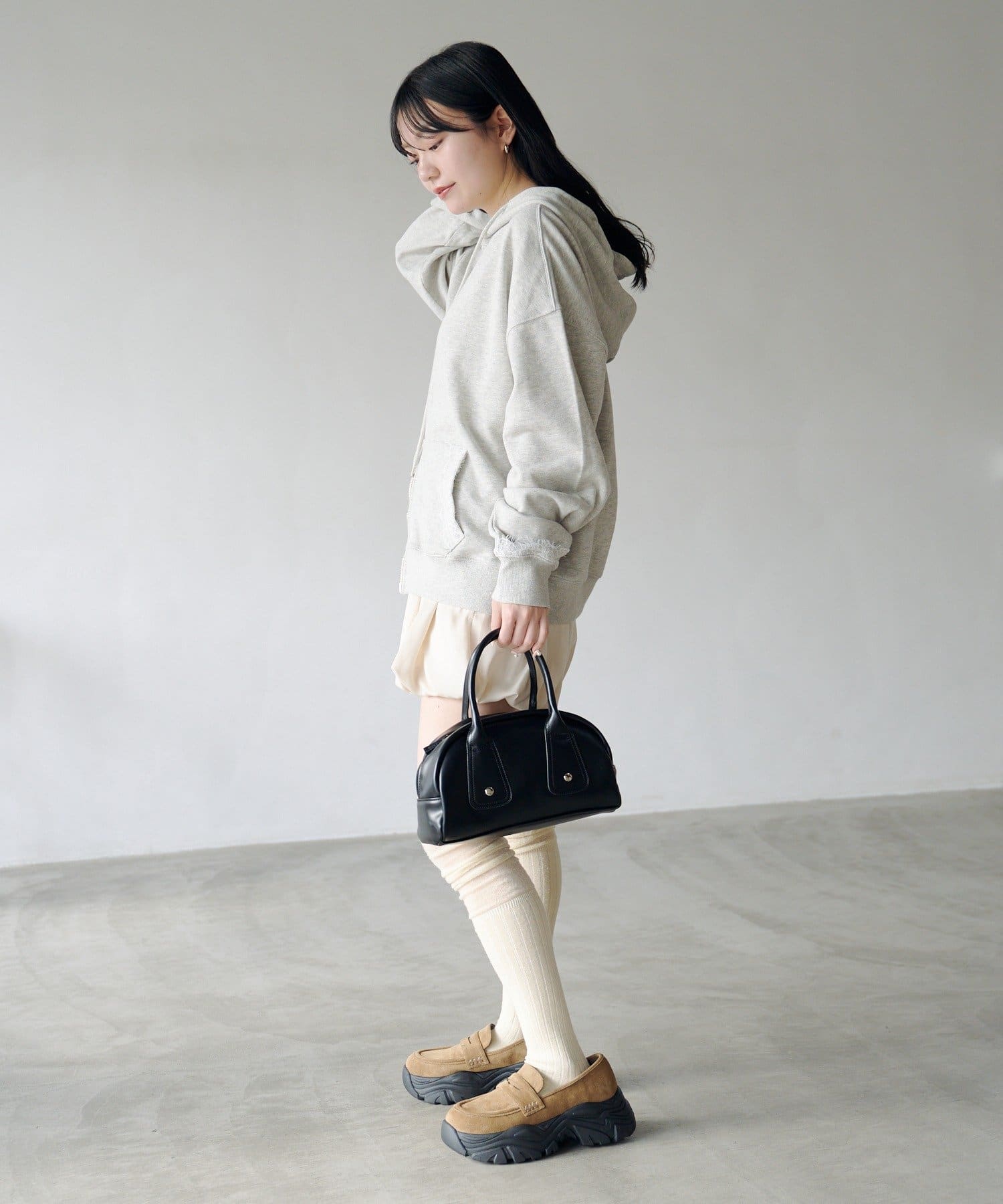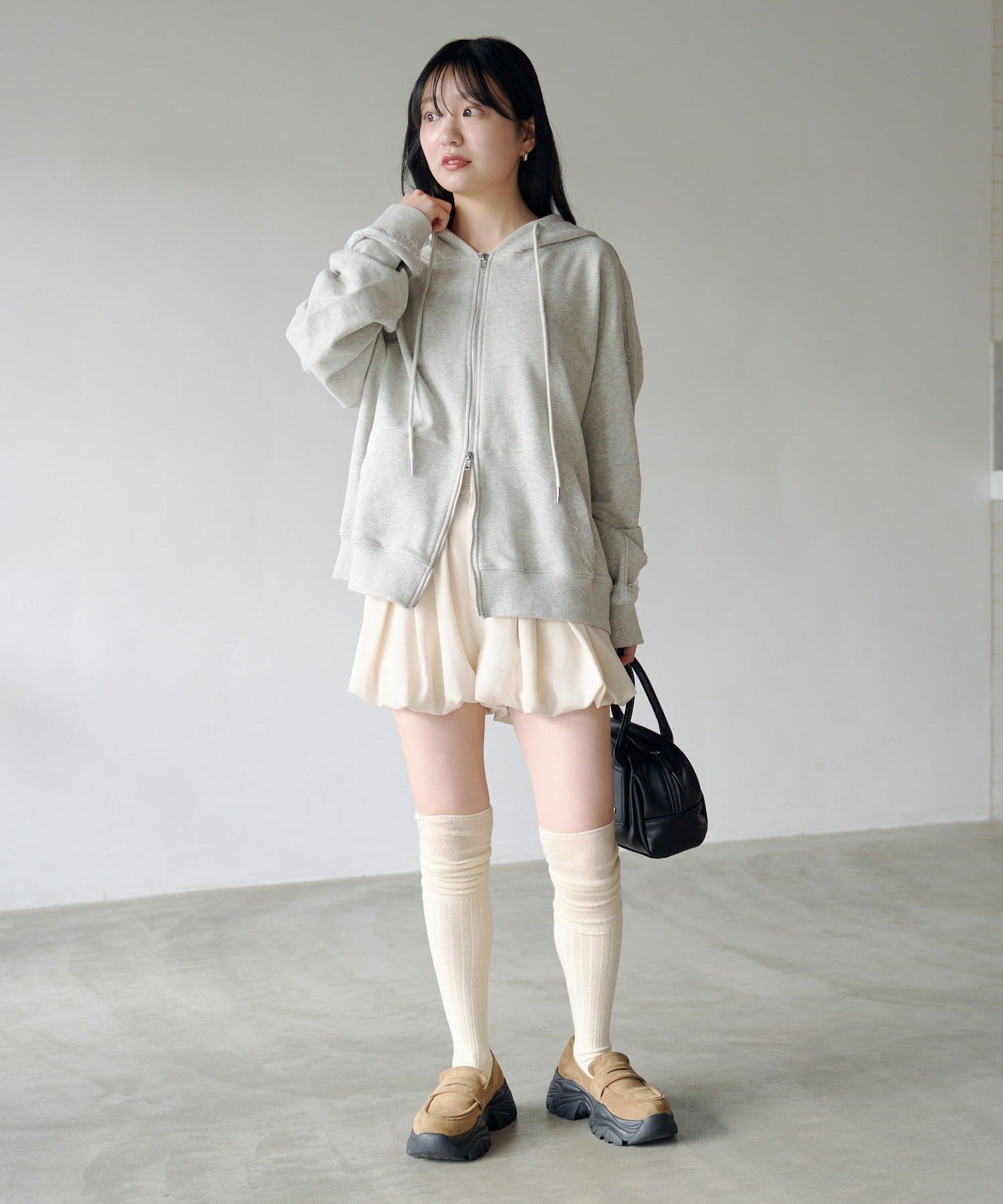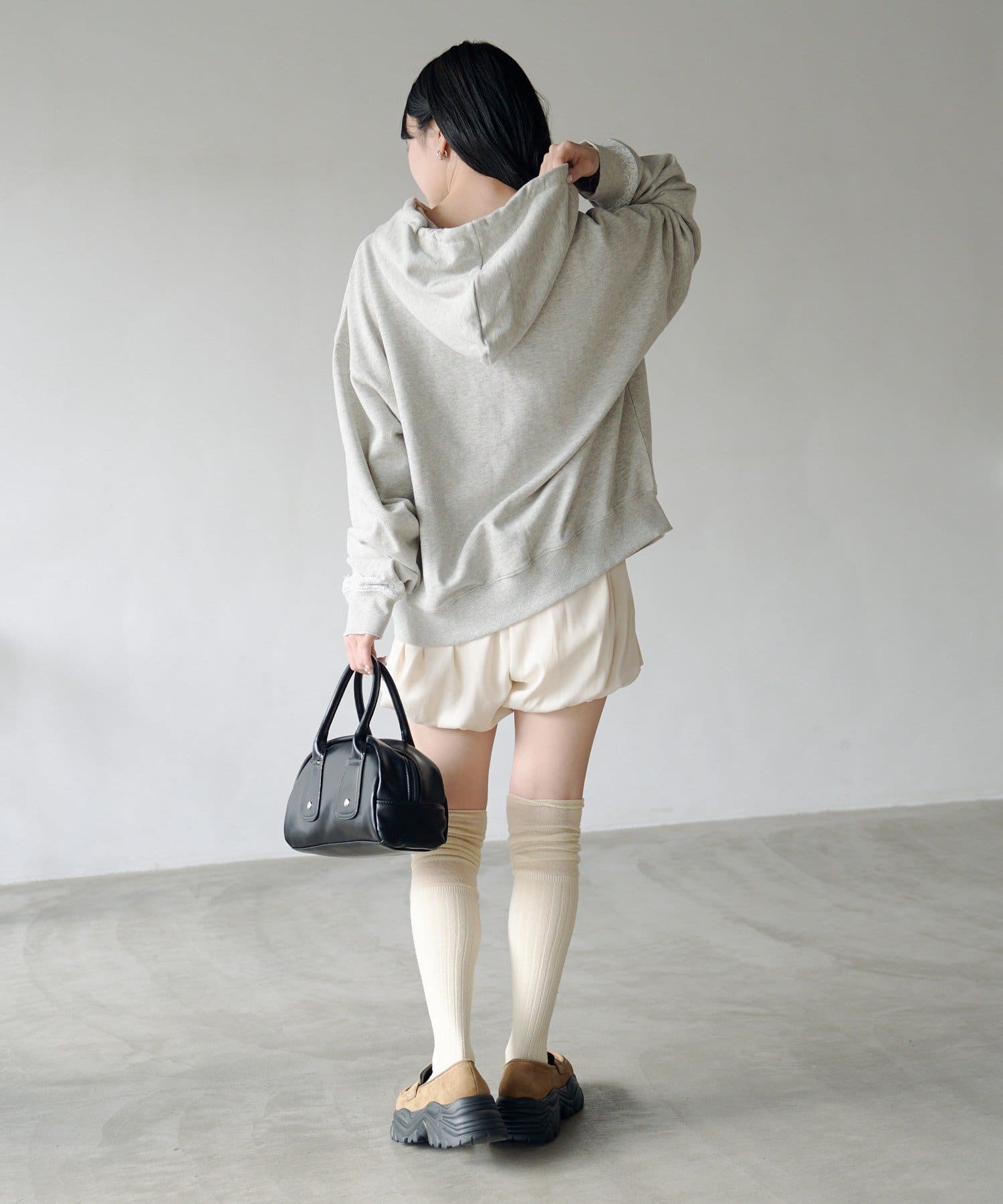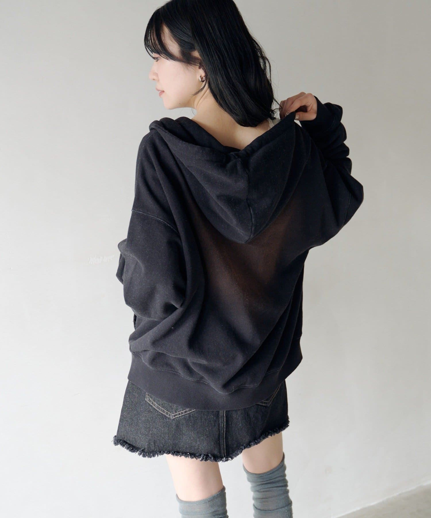 ゆとりのあるサイズ感なのでミニボトムとのスタイリングが相性抜群。