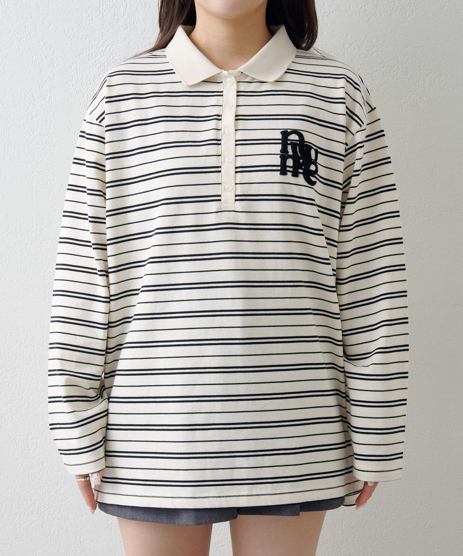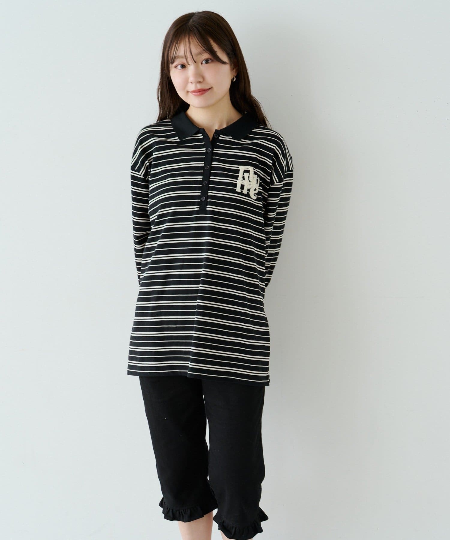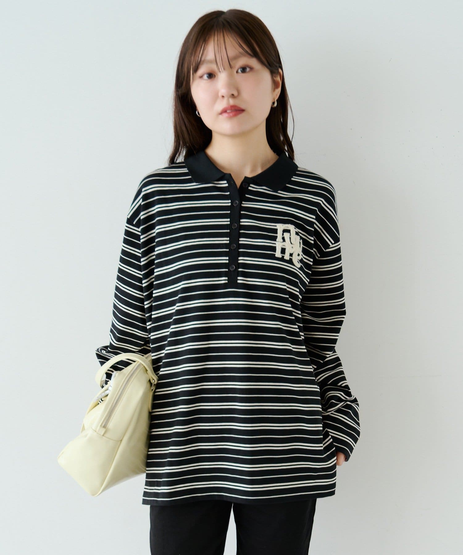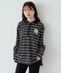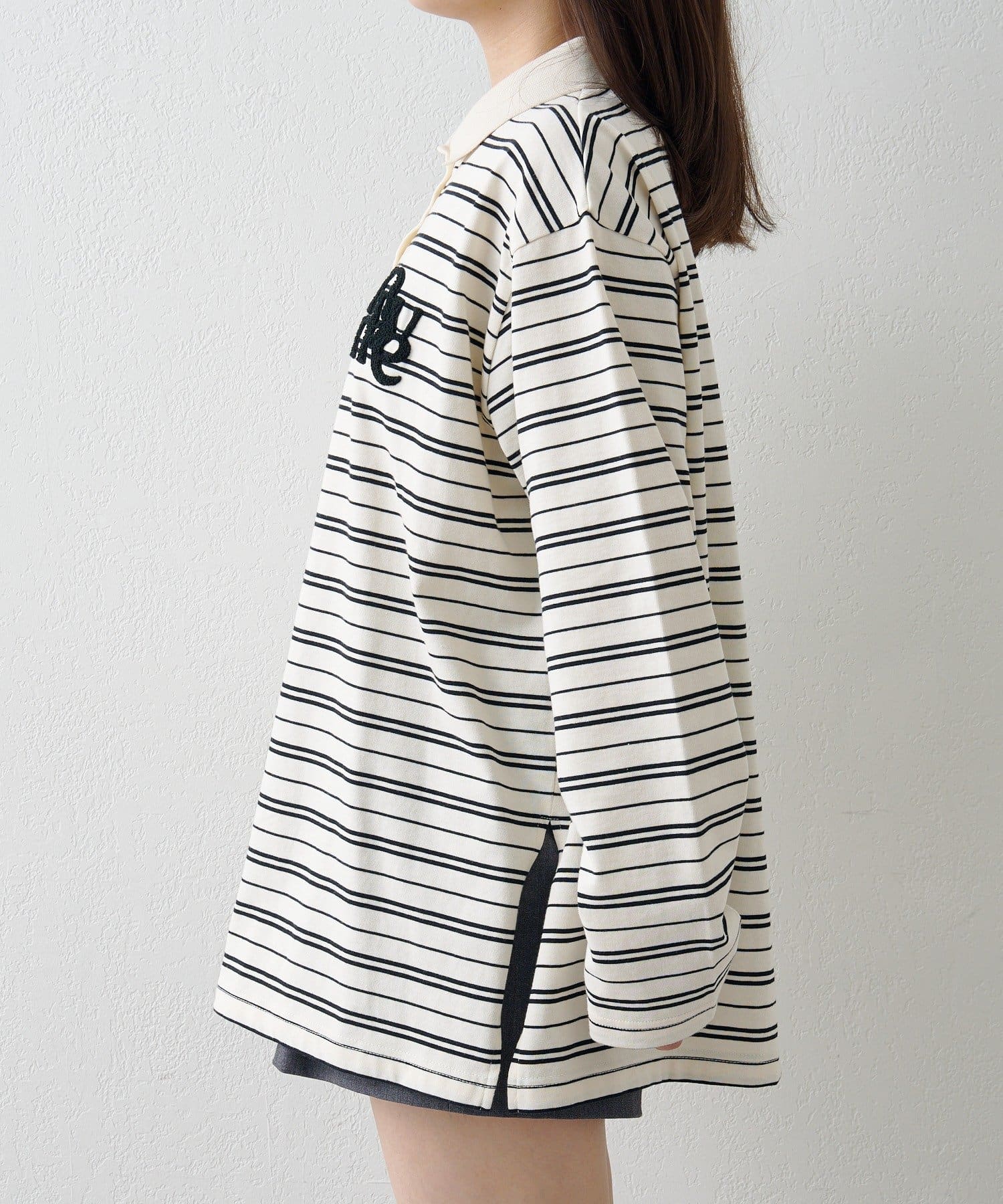 程よいピッチのボーダー柄に、胸元のサガラ刺繍がアクセントになったポロトップス。