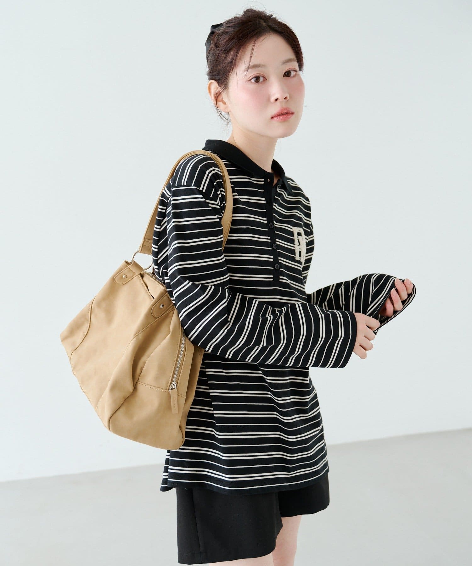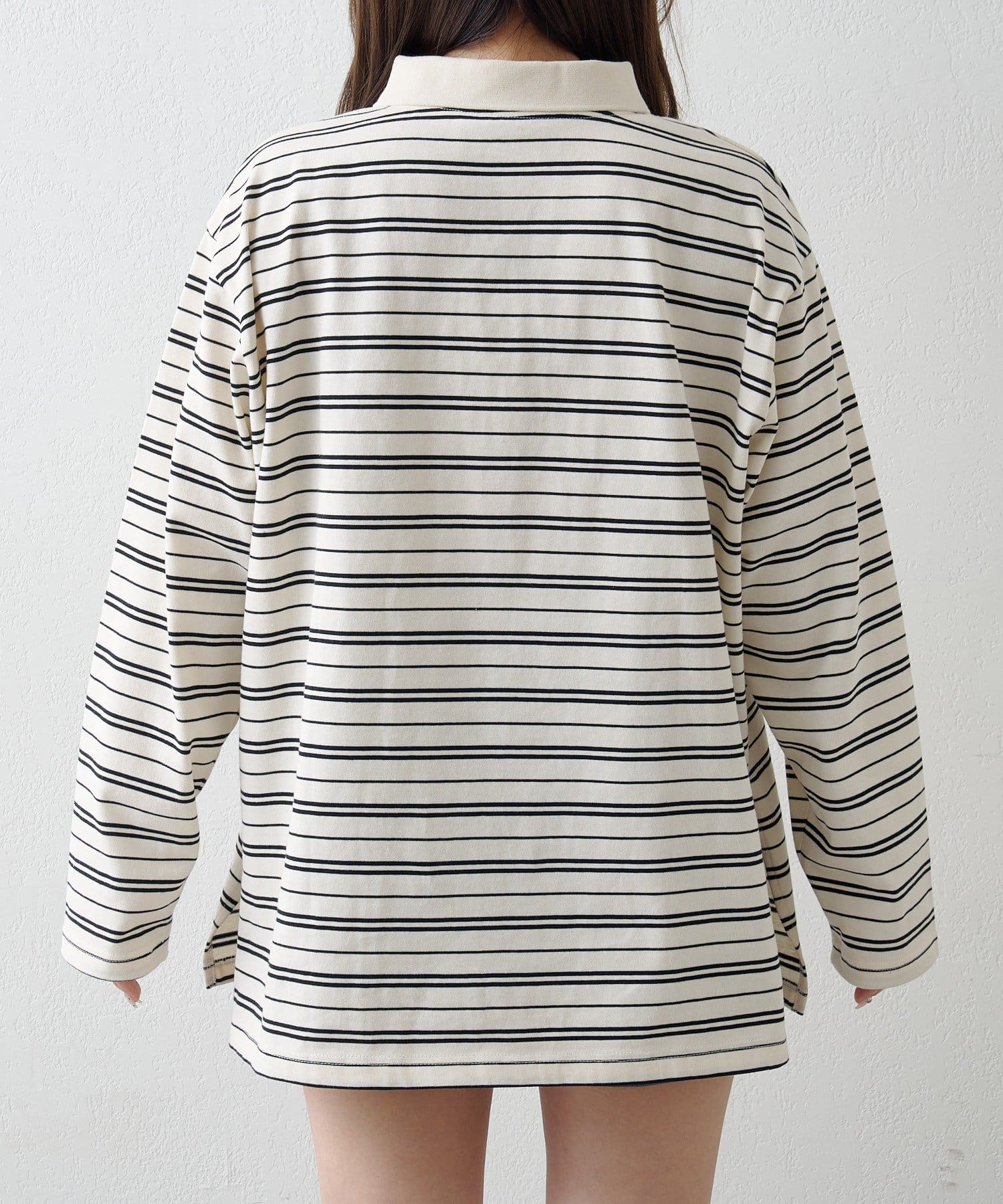 ややゆとりのあるシルエットと長めの袖丈で、体のラインを拾いにくく、デイリーに着回しやすい一枚。