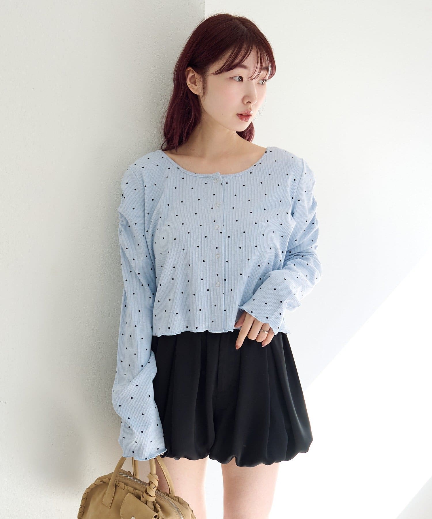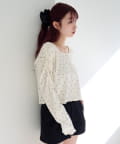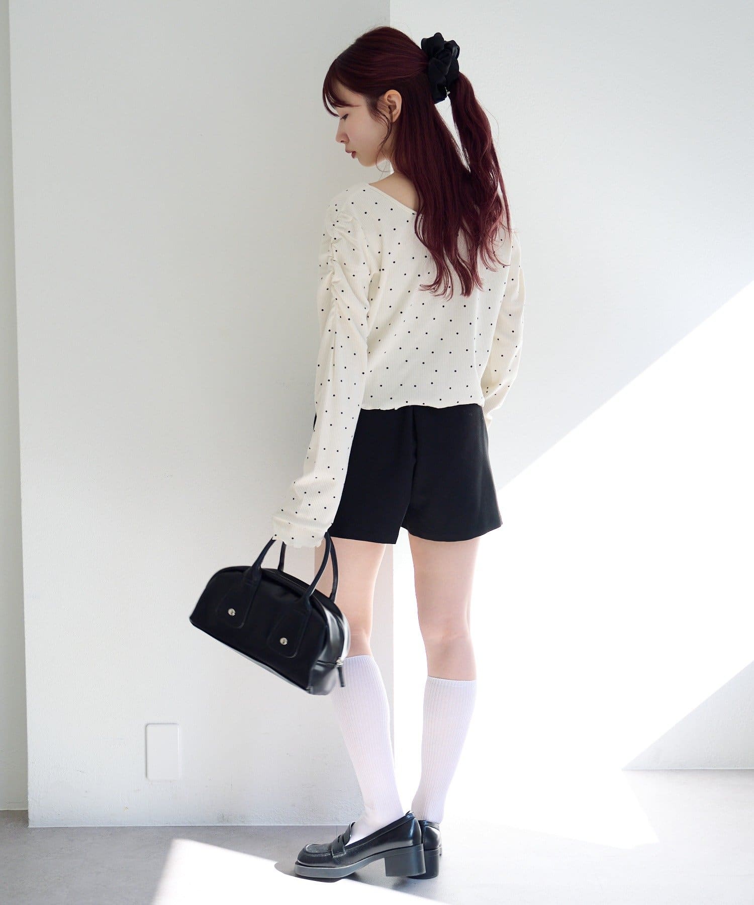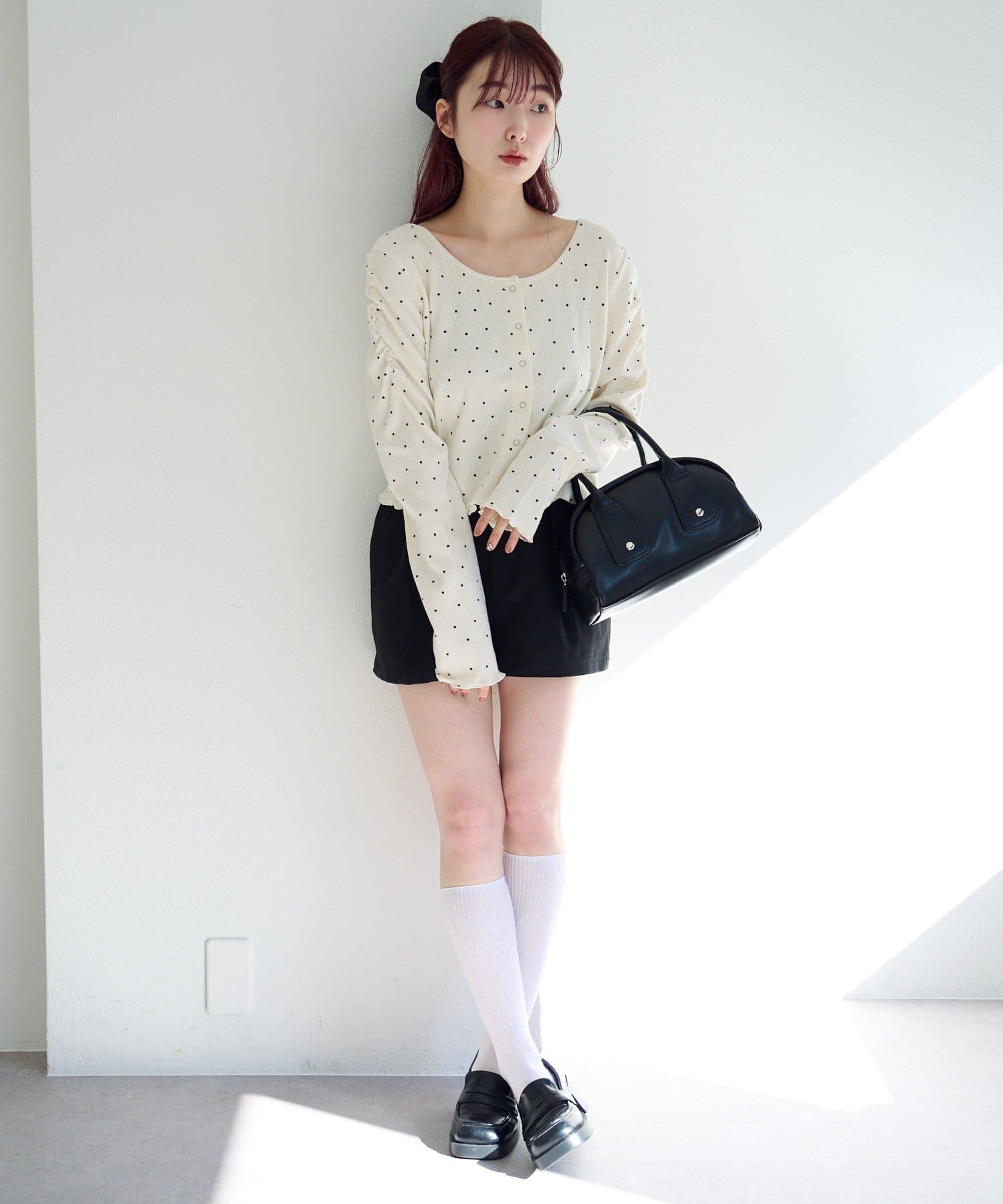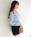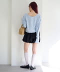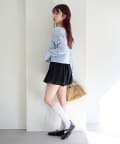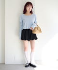 ミニスカートと合わせてコンパクトなシルエットを活かしたフェミニンコーデに。