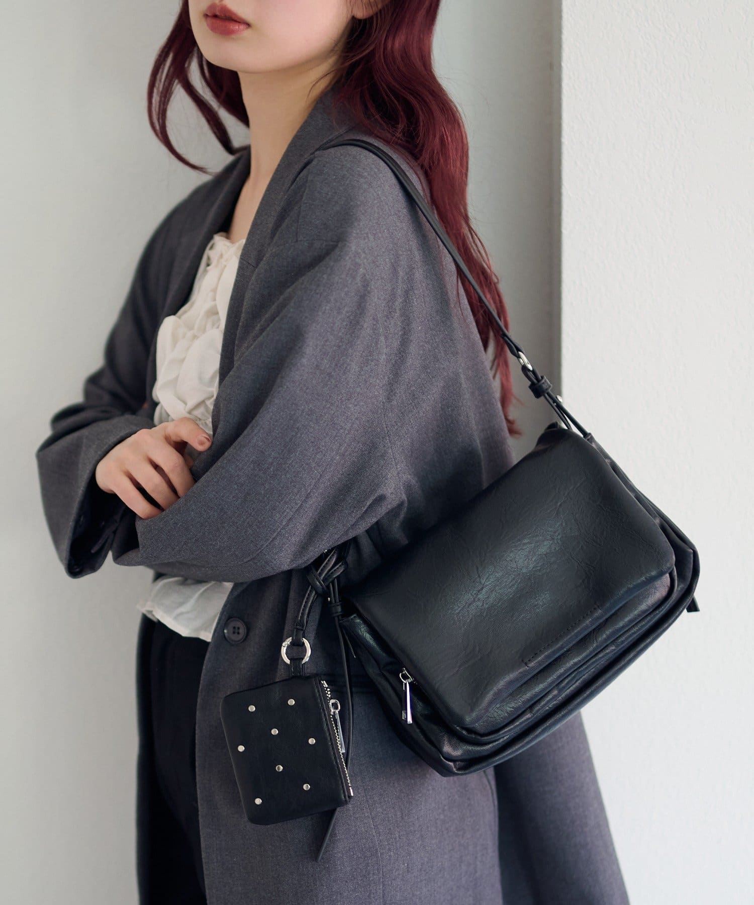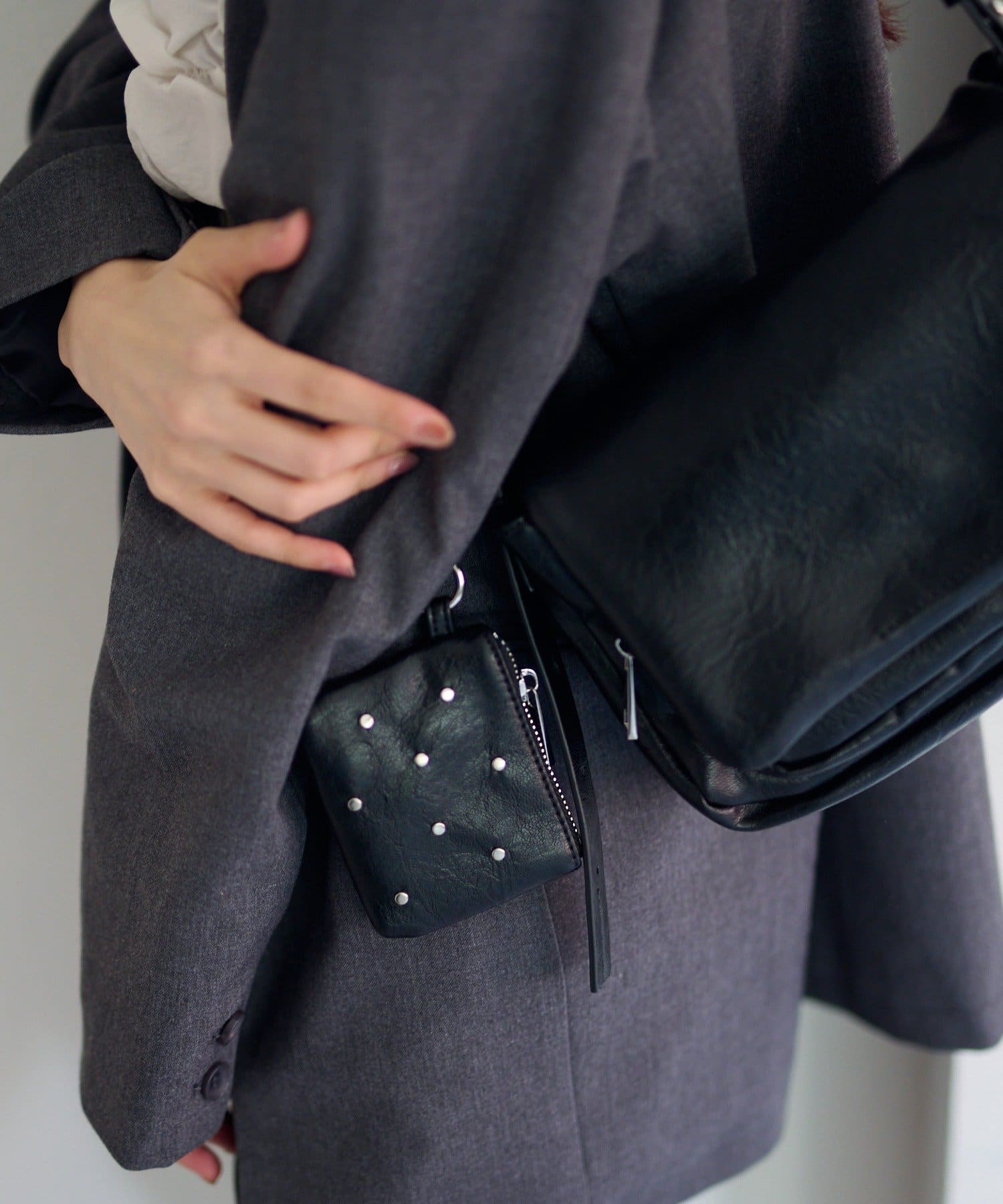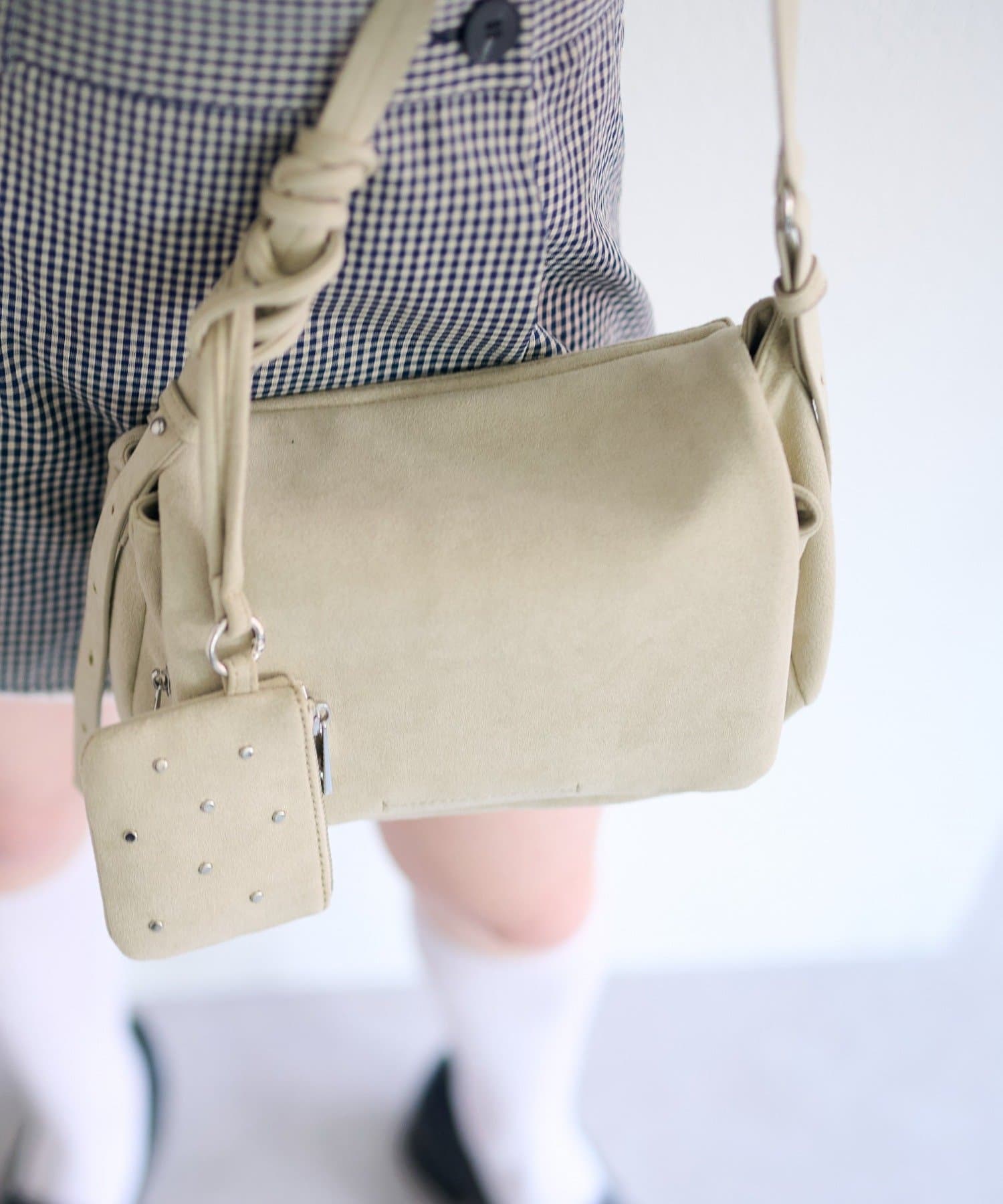 ワンショルダーバッグとスタッズ付きポーチがセットになった、使い方を楽しめるバッグ。