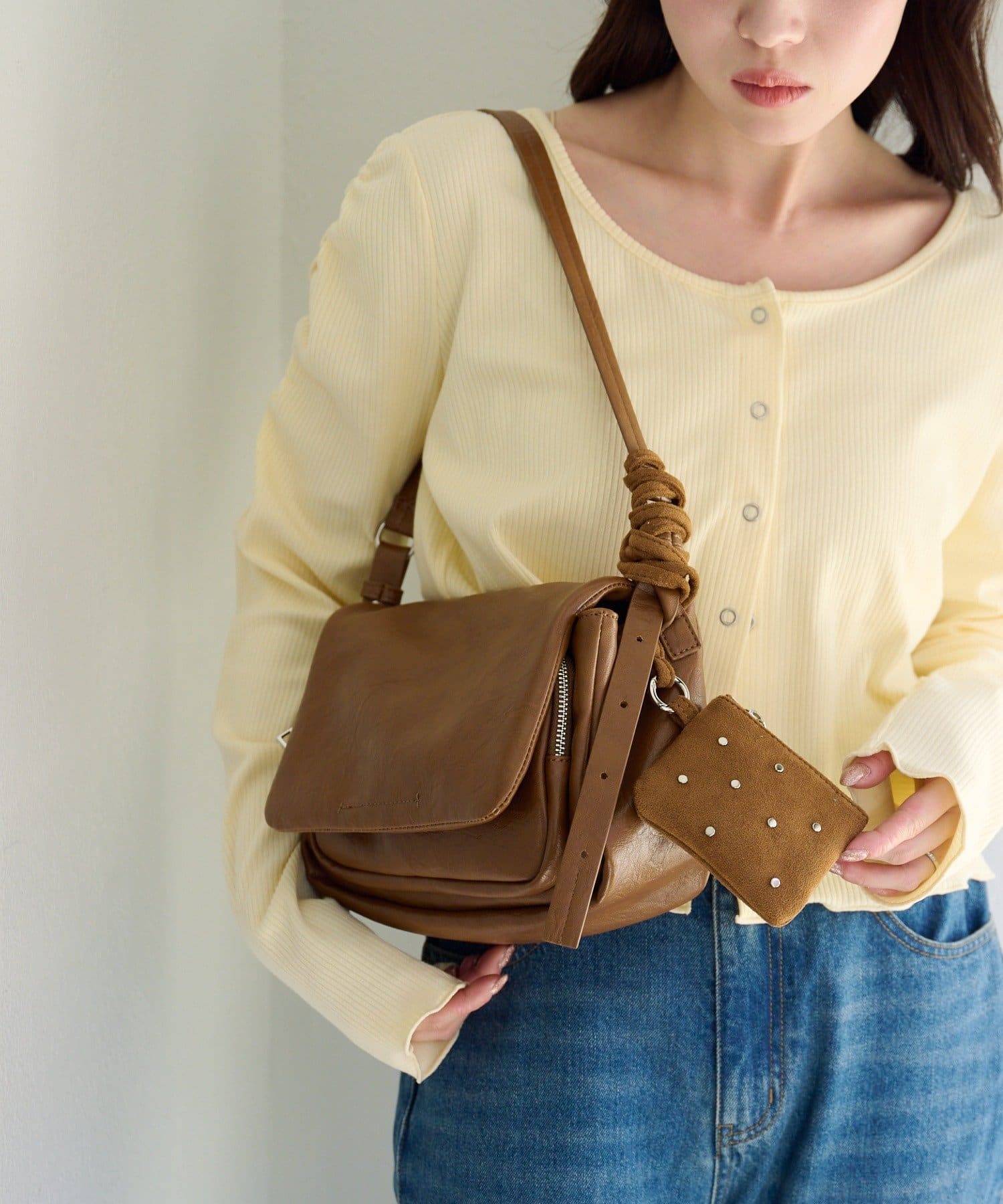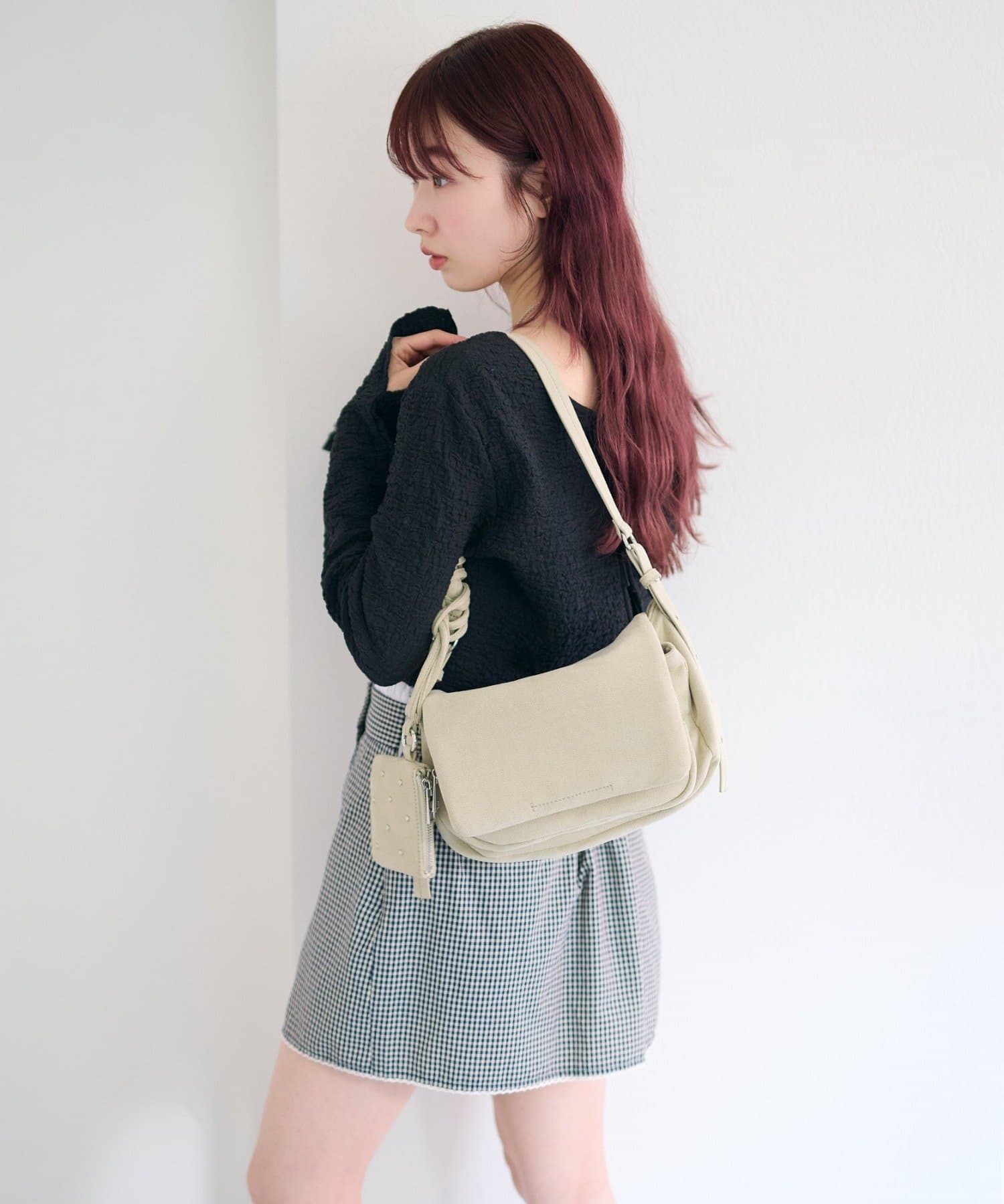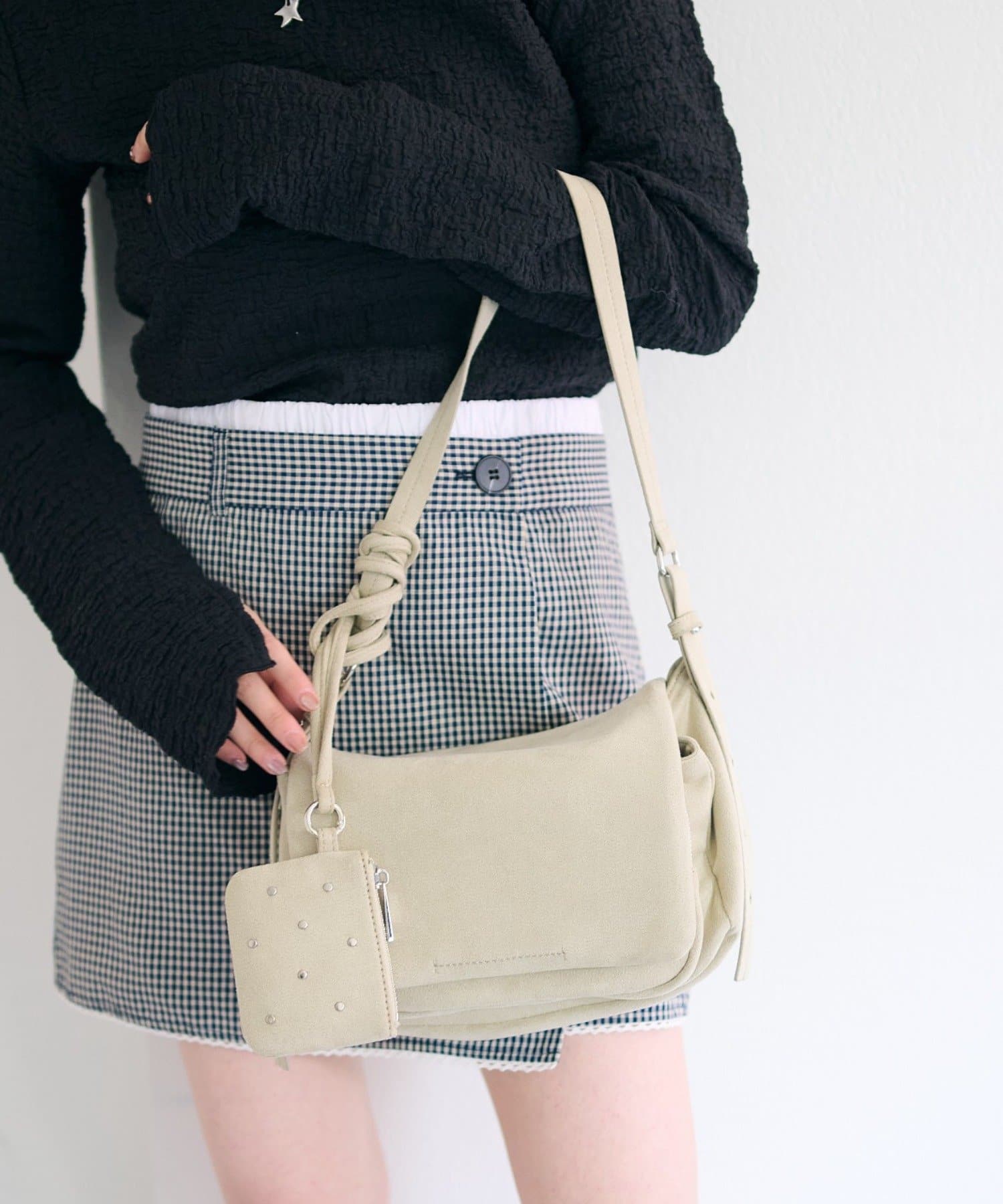 ワンショルダーバッグとスタッズ付きポーチがセットになった、使い方を楽しめるバッグ。