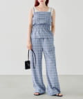 胸元とウエストに施したギャザーデザインがポイントのサロペット。