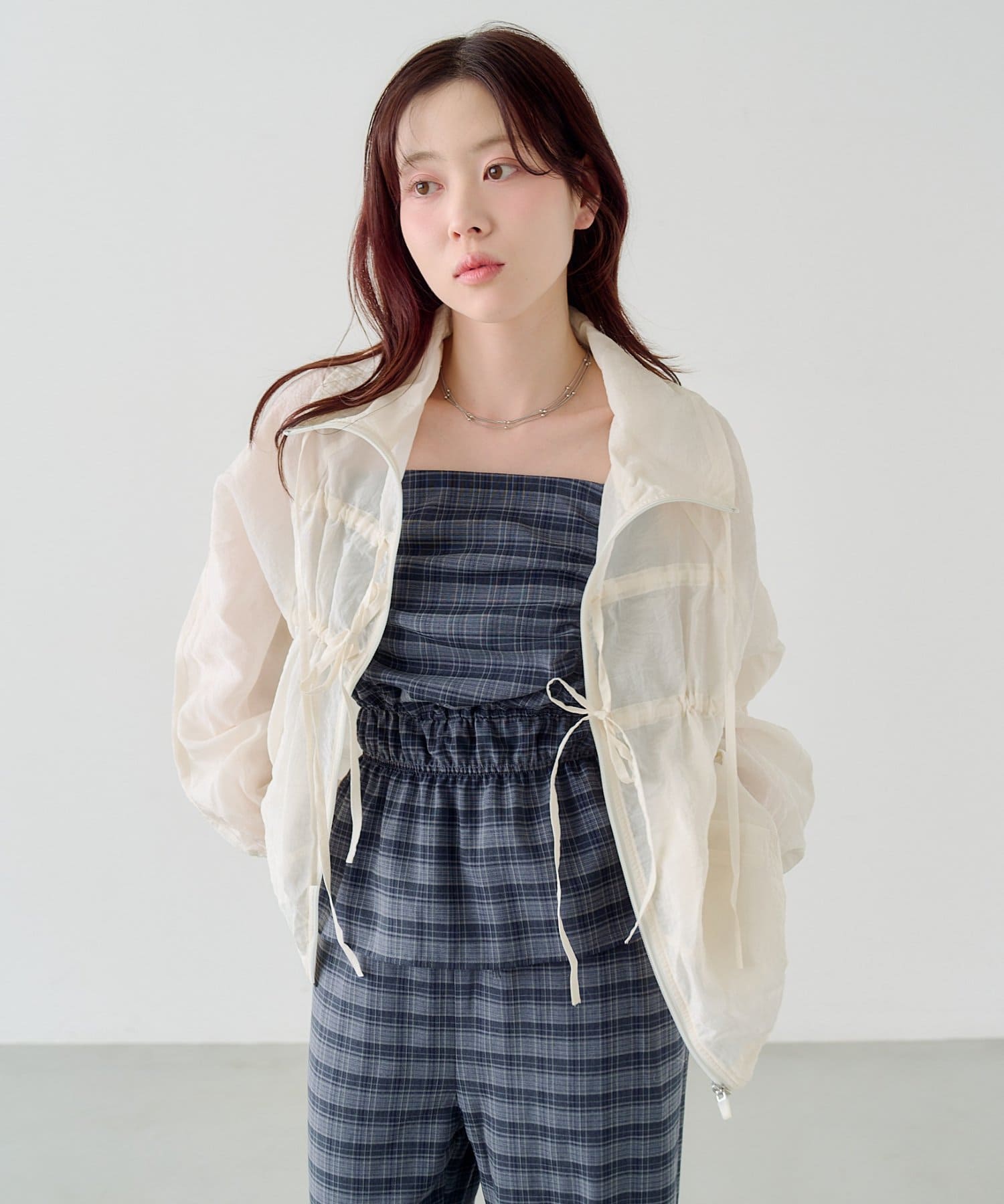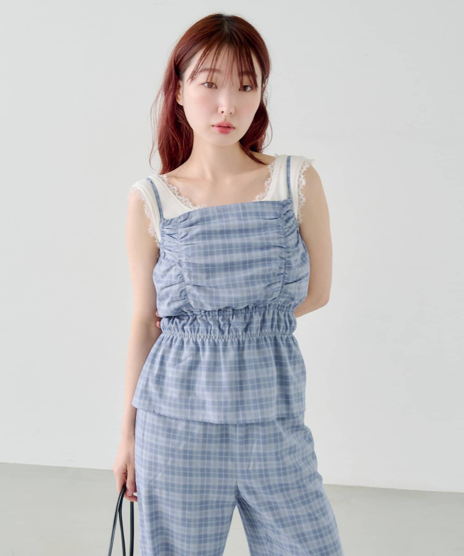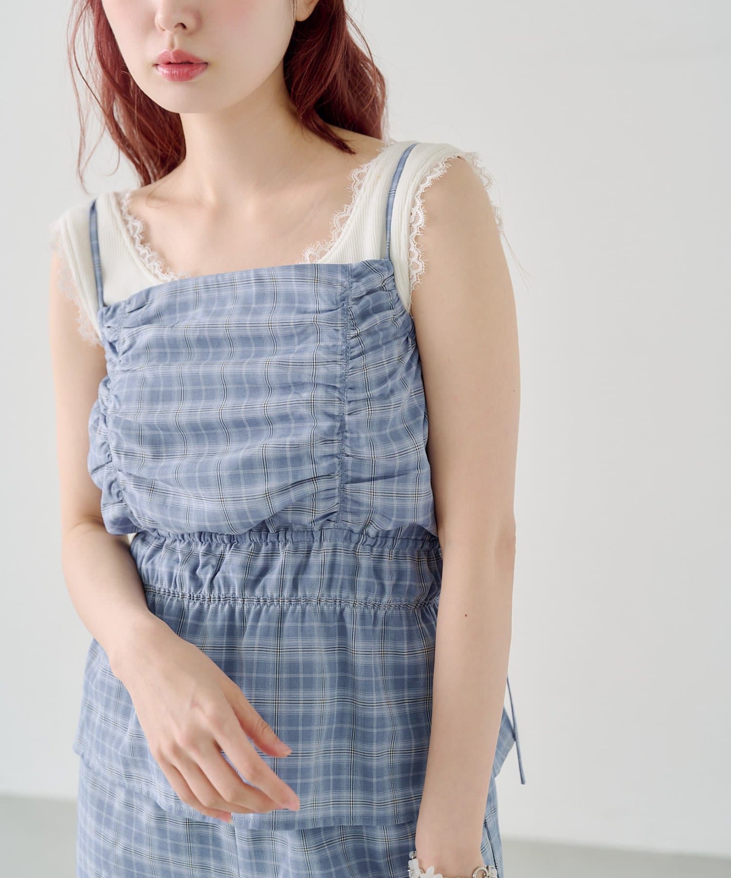 レースタンクやキャミソールを合わせた、女性らしいレイヤードスタイルがおすすめ。