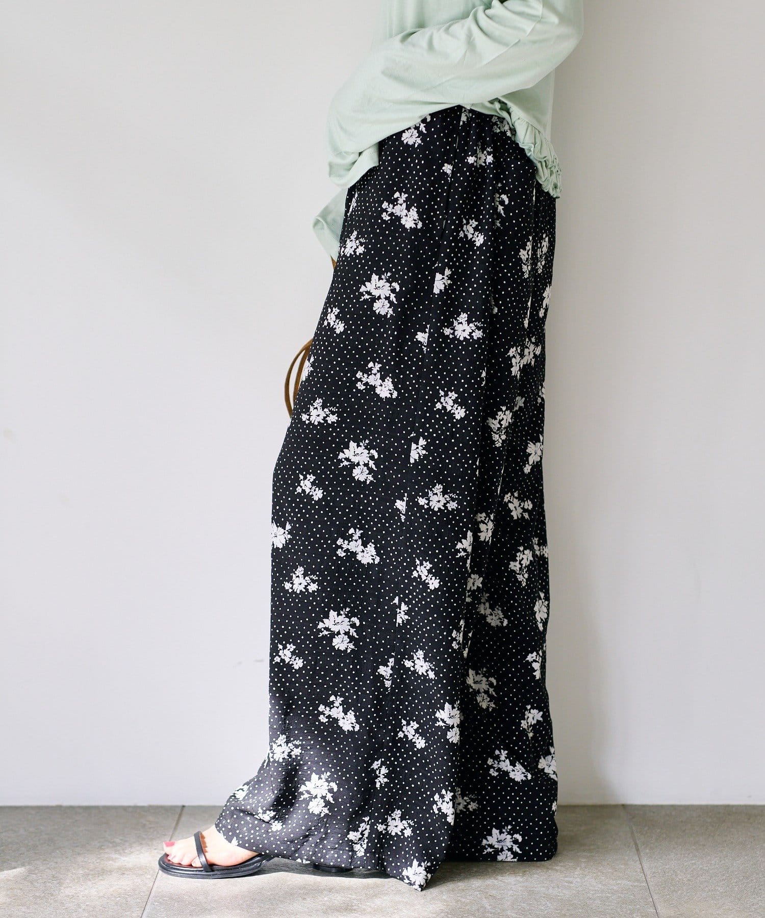 小花柄とドットを組み合わせた、大人フェミニンな総柄パンツ。