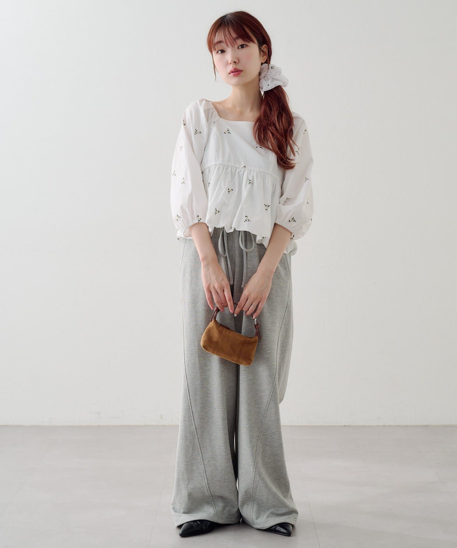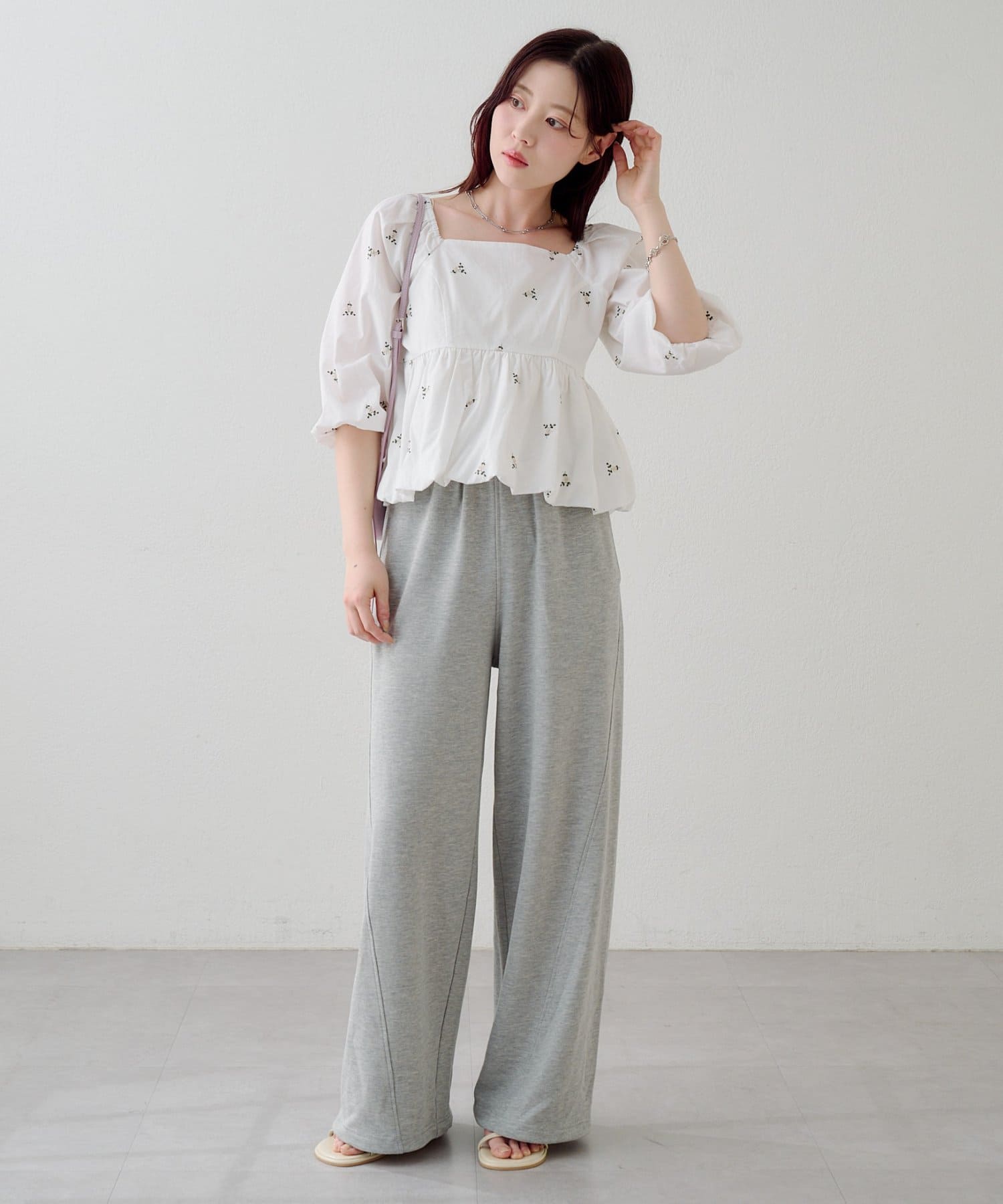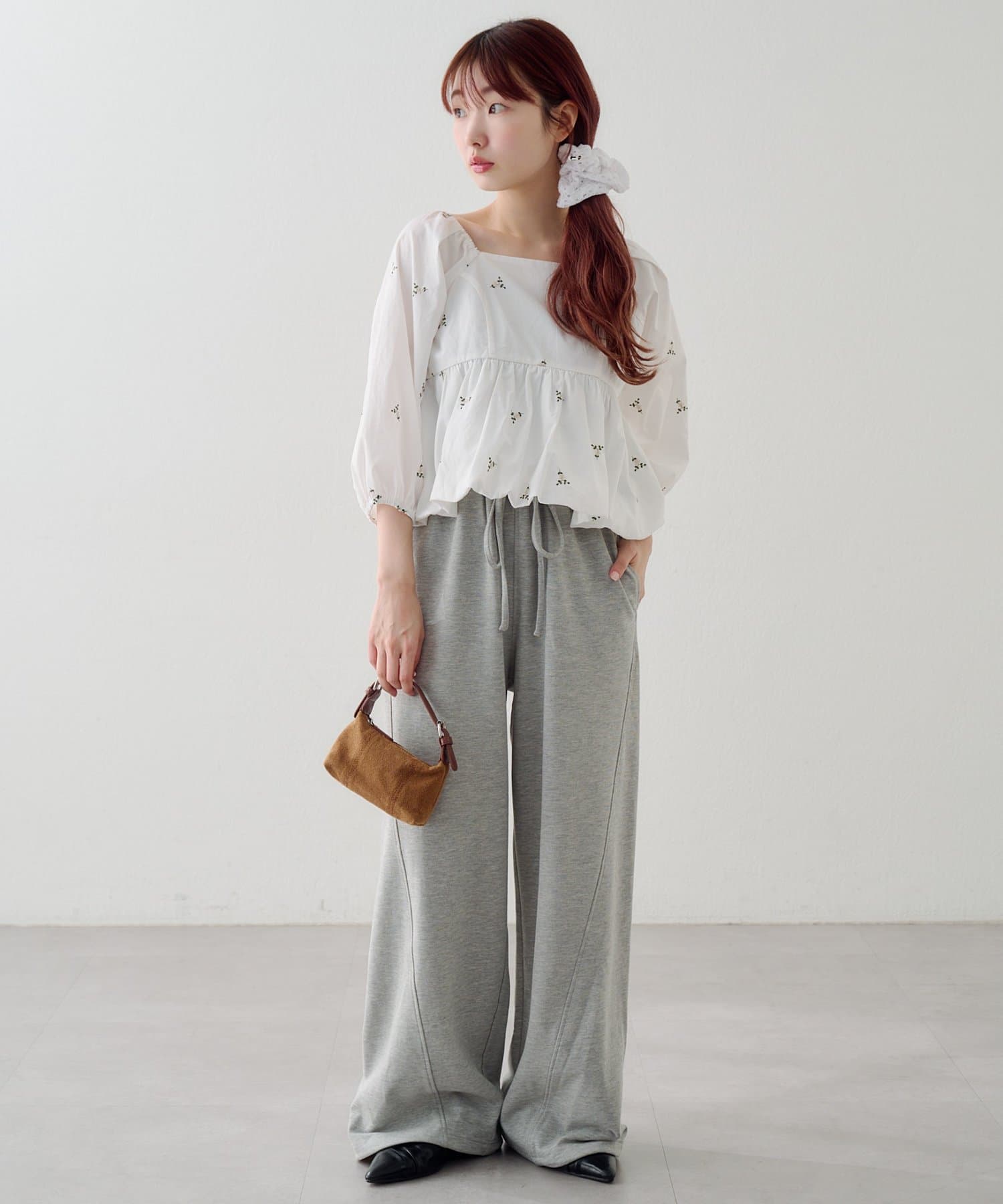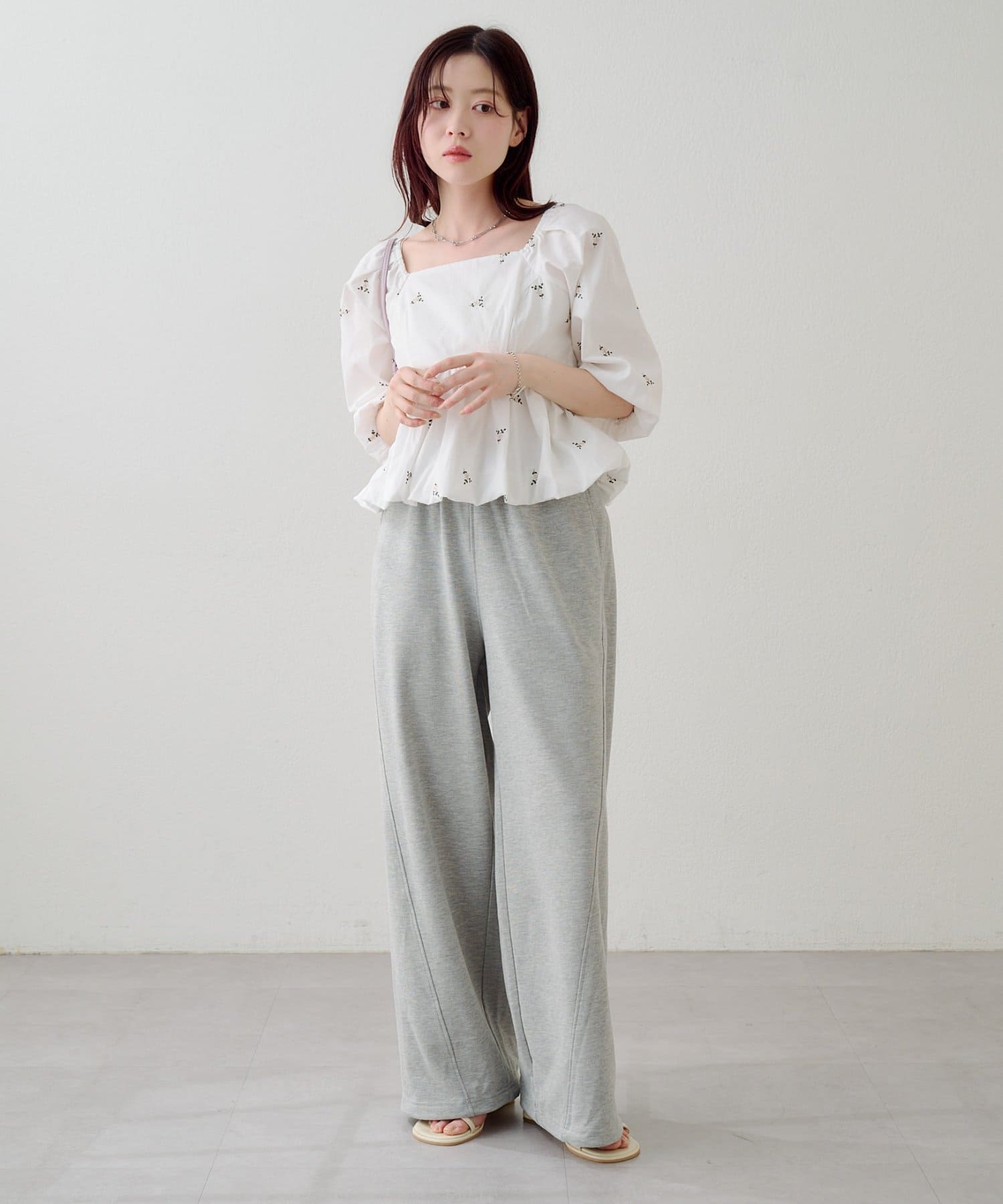 小さなフラワーステッチが散りばめられた、さりげない可愛さがポイントのスウェットパンツ。