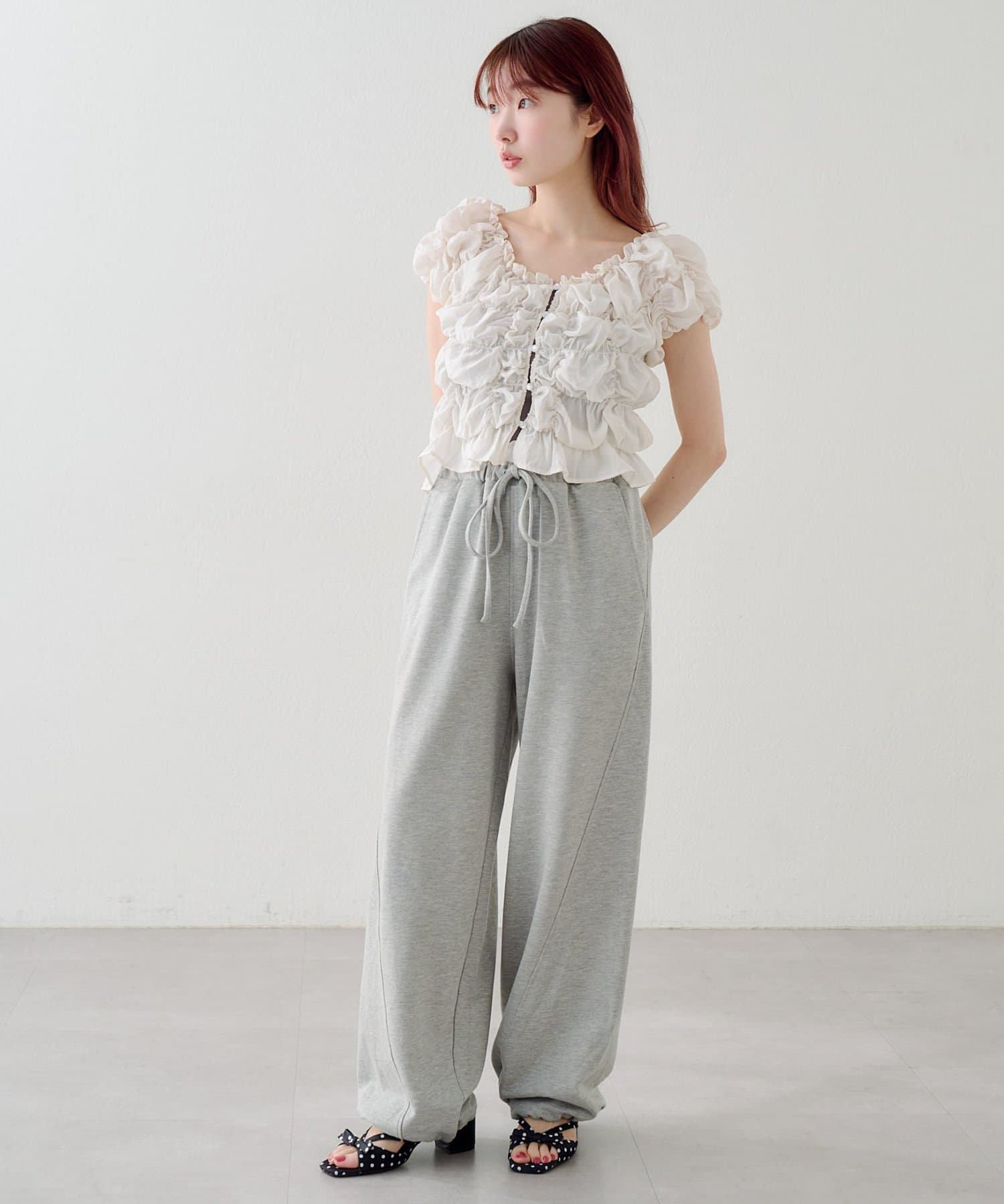 シアートップスやブラウスと合わせると、カジュアルすぎず女性らしいスタイリングに仕上がります。