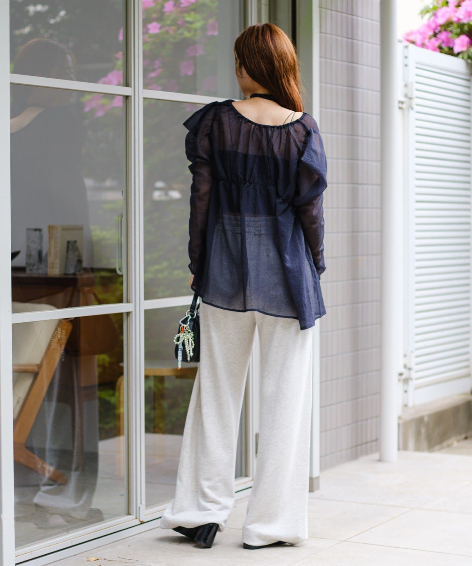 シアー素材で女性らしいブラウスなので、ボトムはデニムやスウェットパンツ合わせでカジュアルダウンしていただけると、今年らしく着ていただけます。