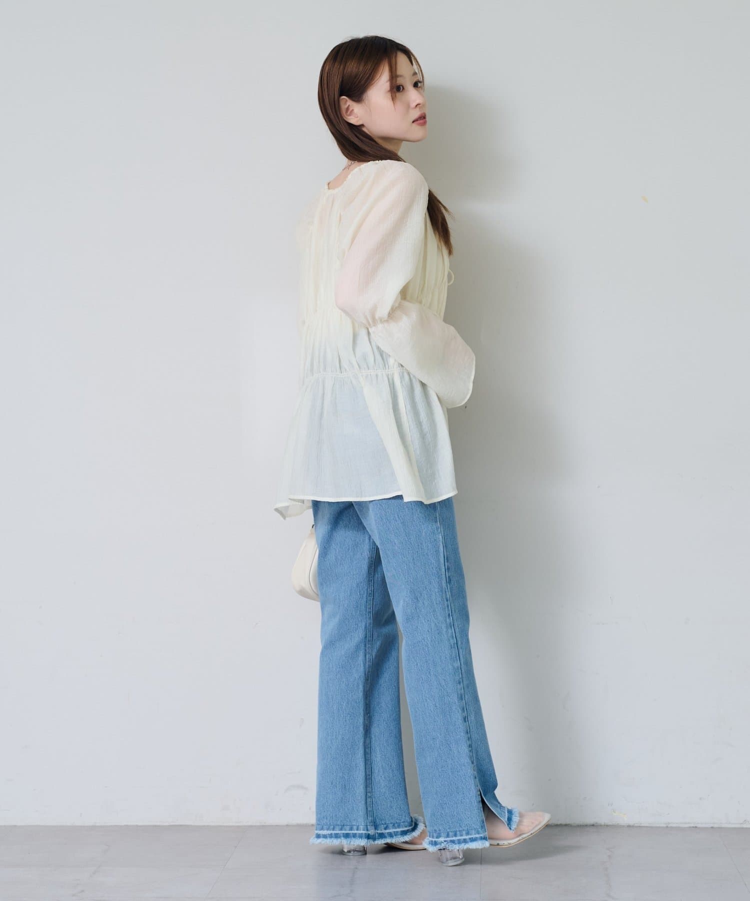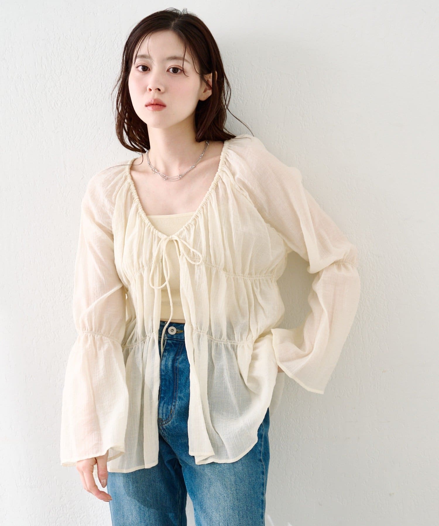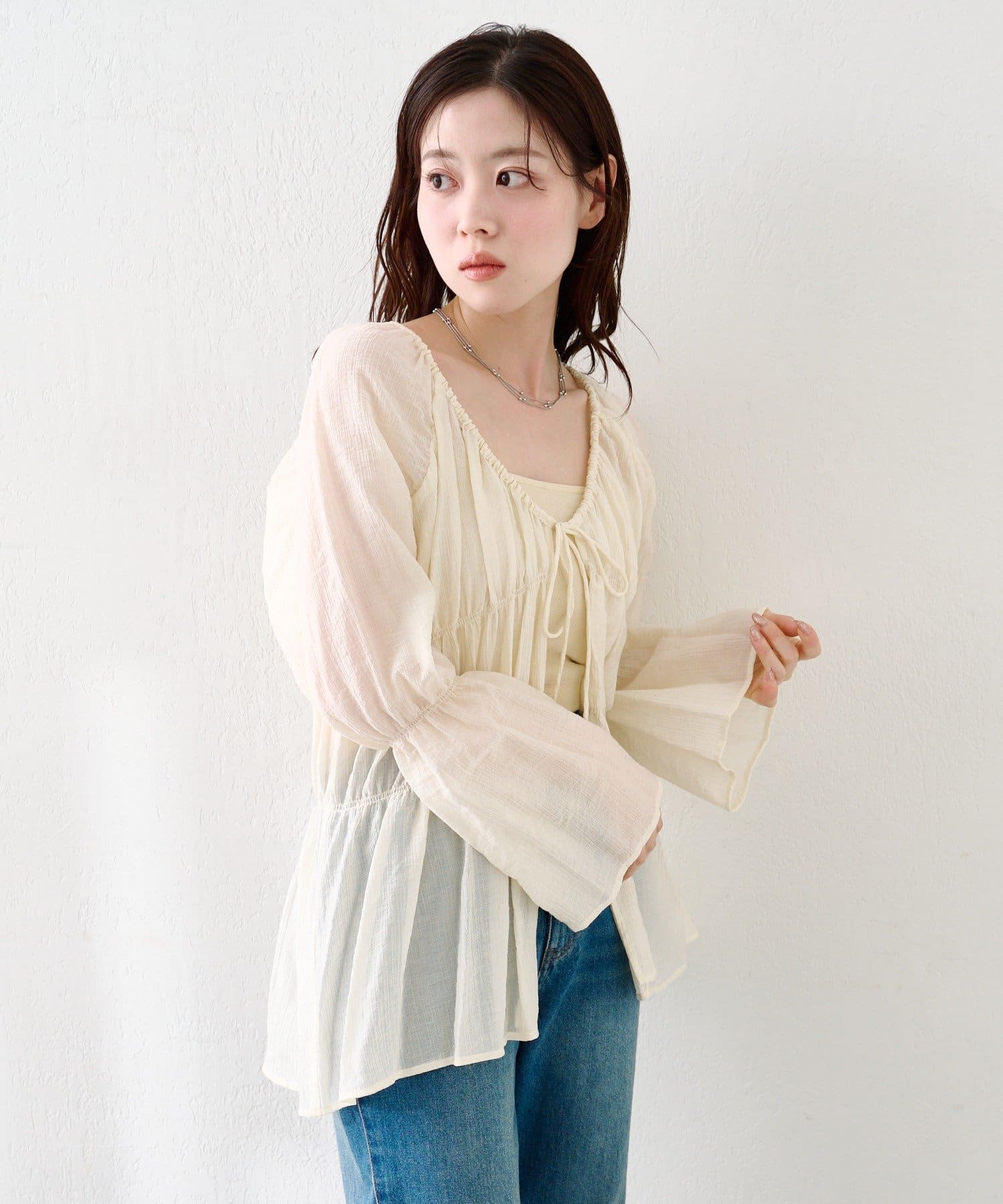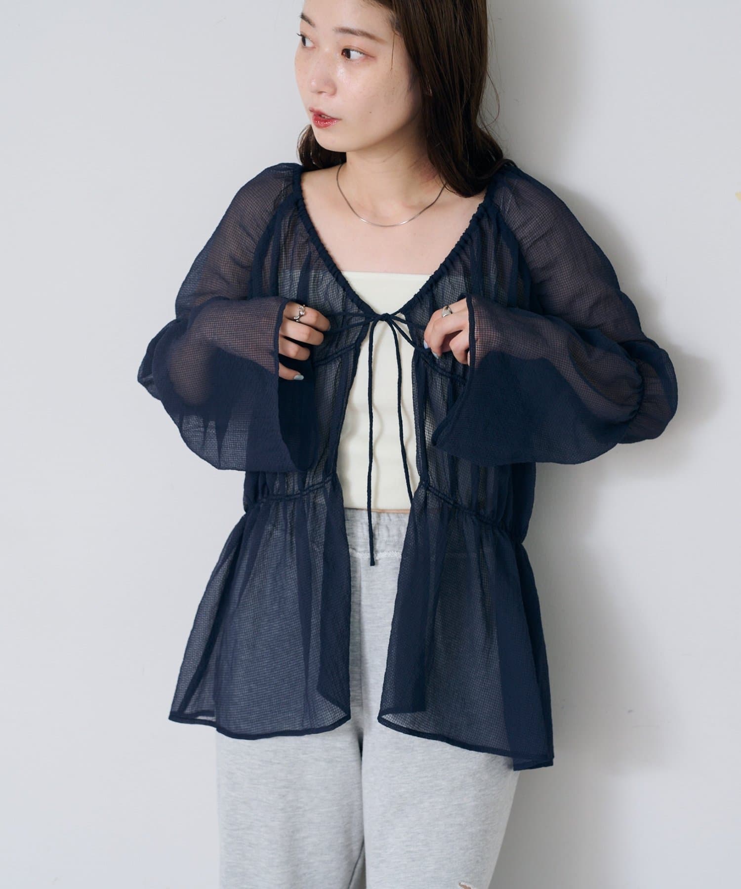 シアーのブラウスは1枚あるとインナーを変えるだけで沢山楽しめるのでいいと思います。アイボリーなので女の子らしく長く楽しめそうです。
