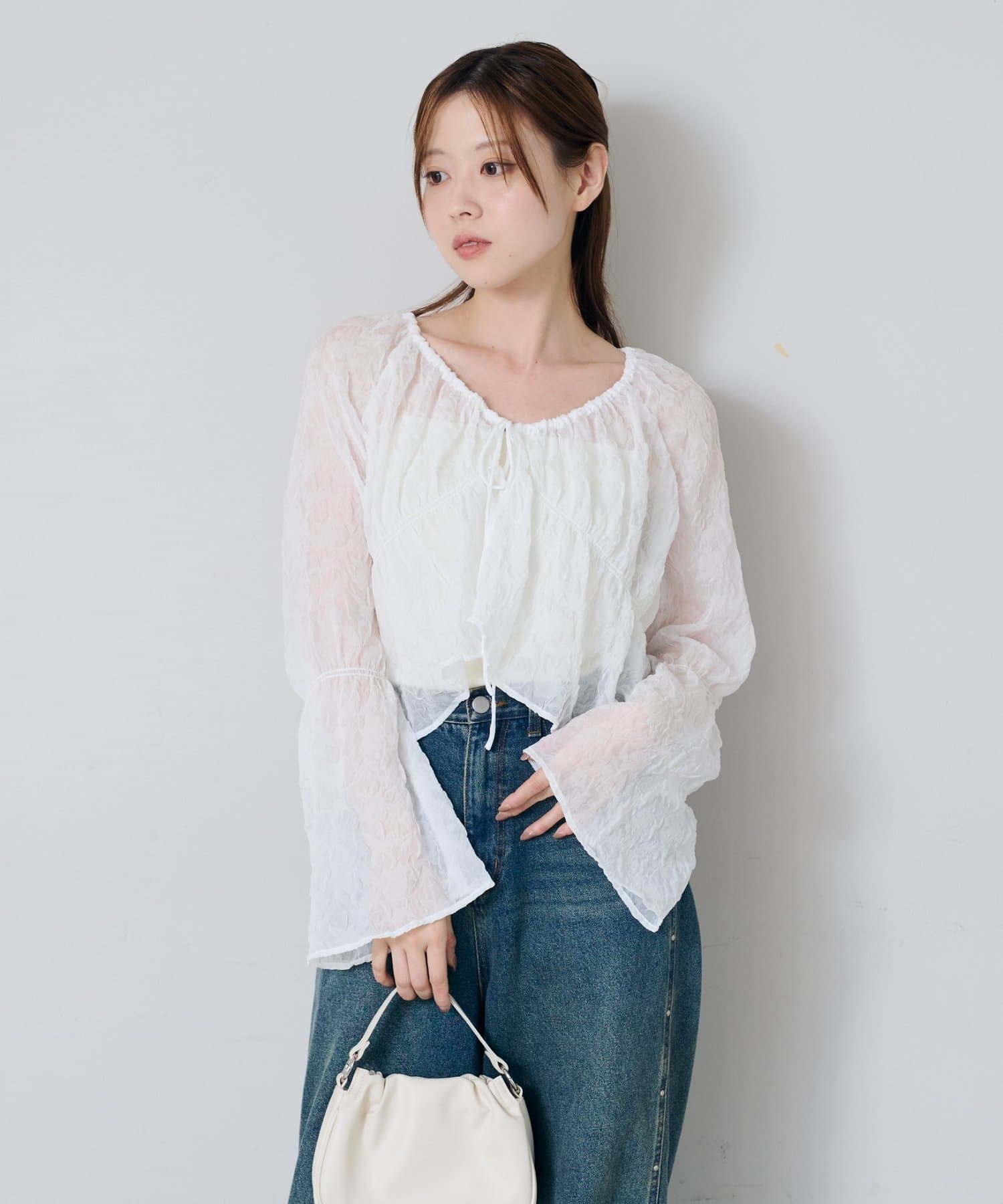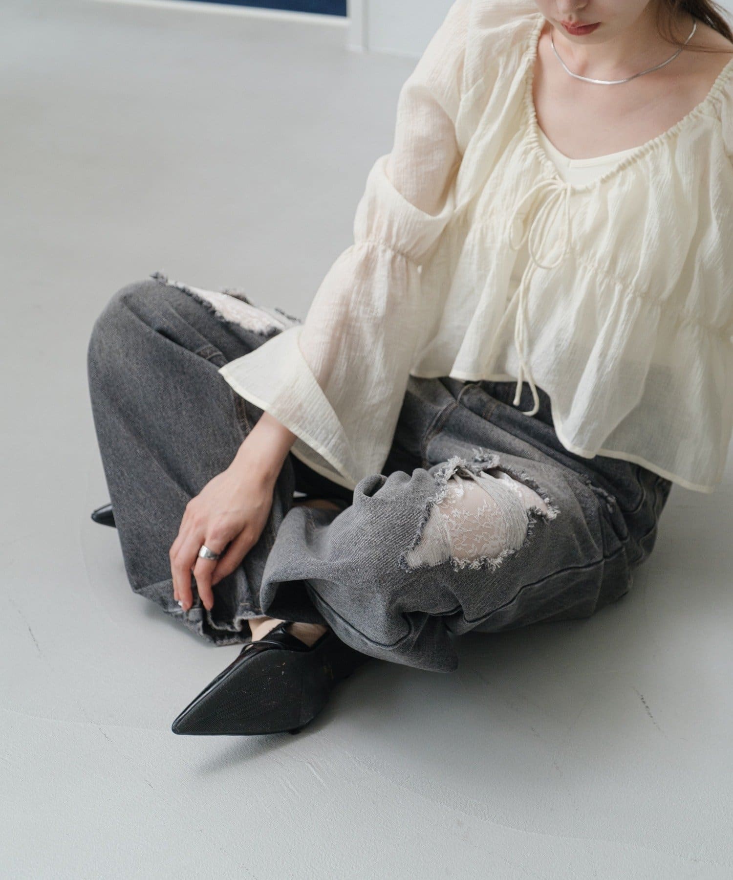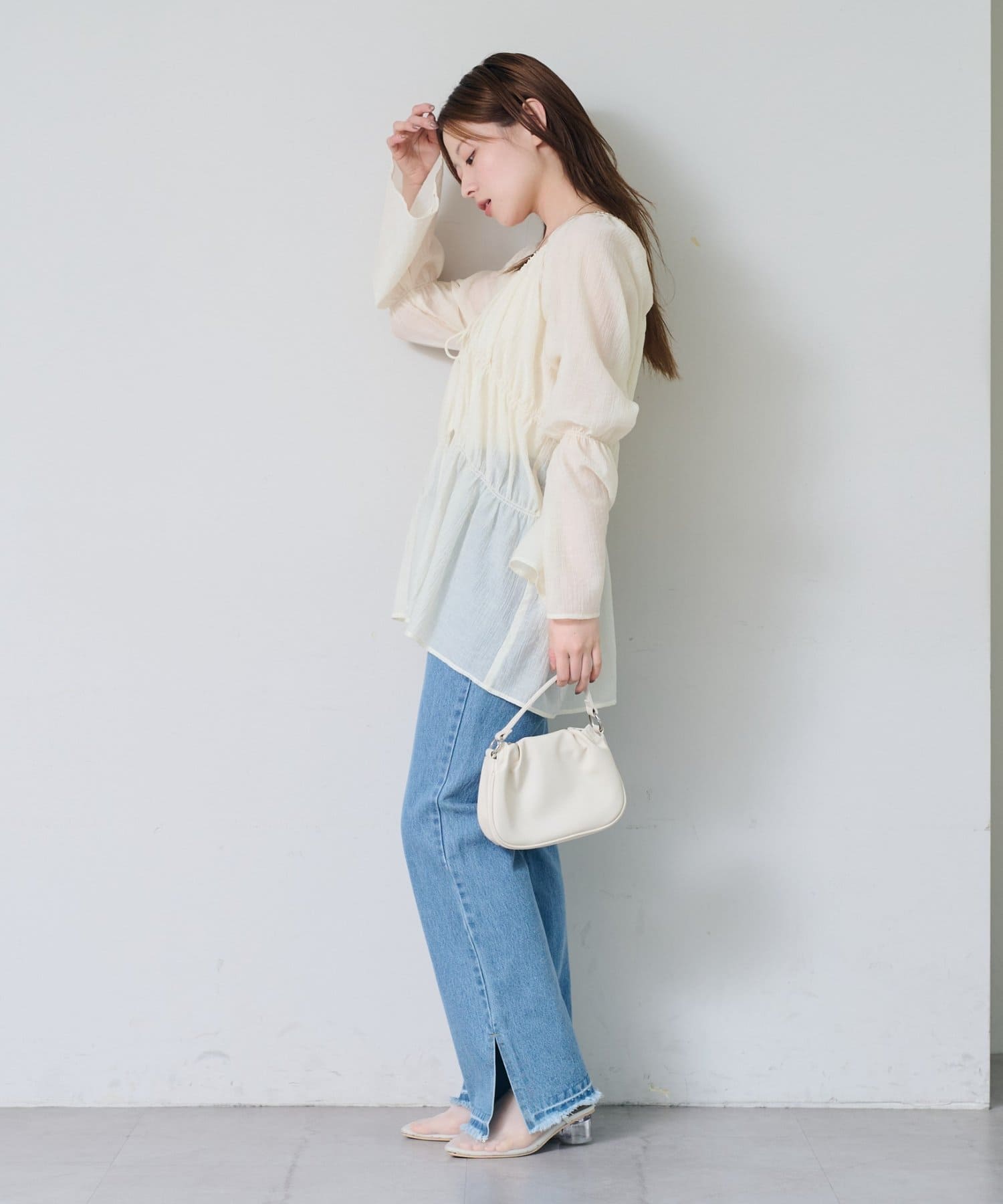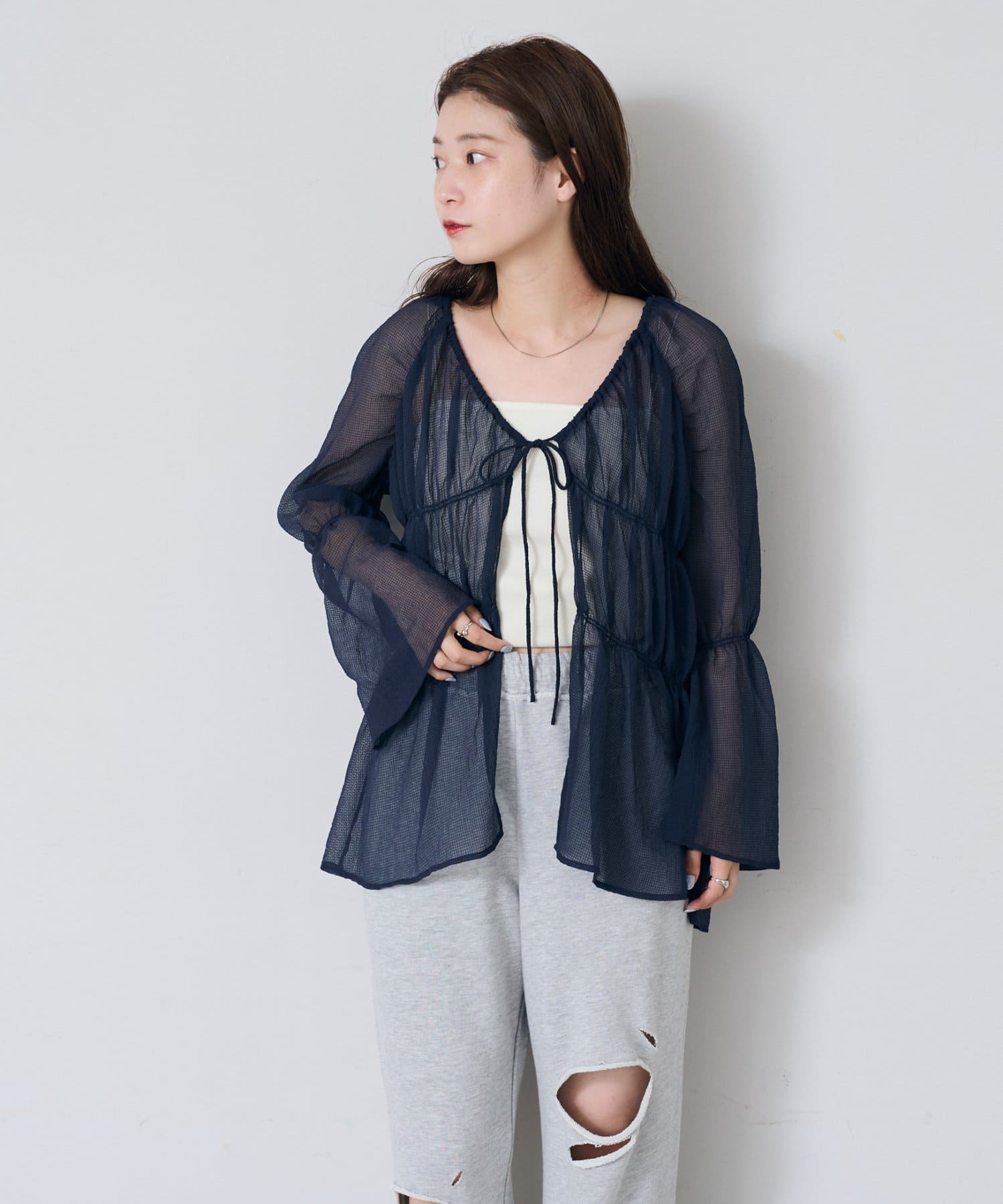 シアーのブラウスは1枚あるとインナーを変えるだけで沢山楽しめるのでいいと思います。アイボリーなので女の子らしく長く楽しめそうです。