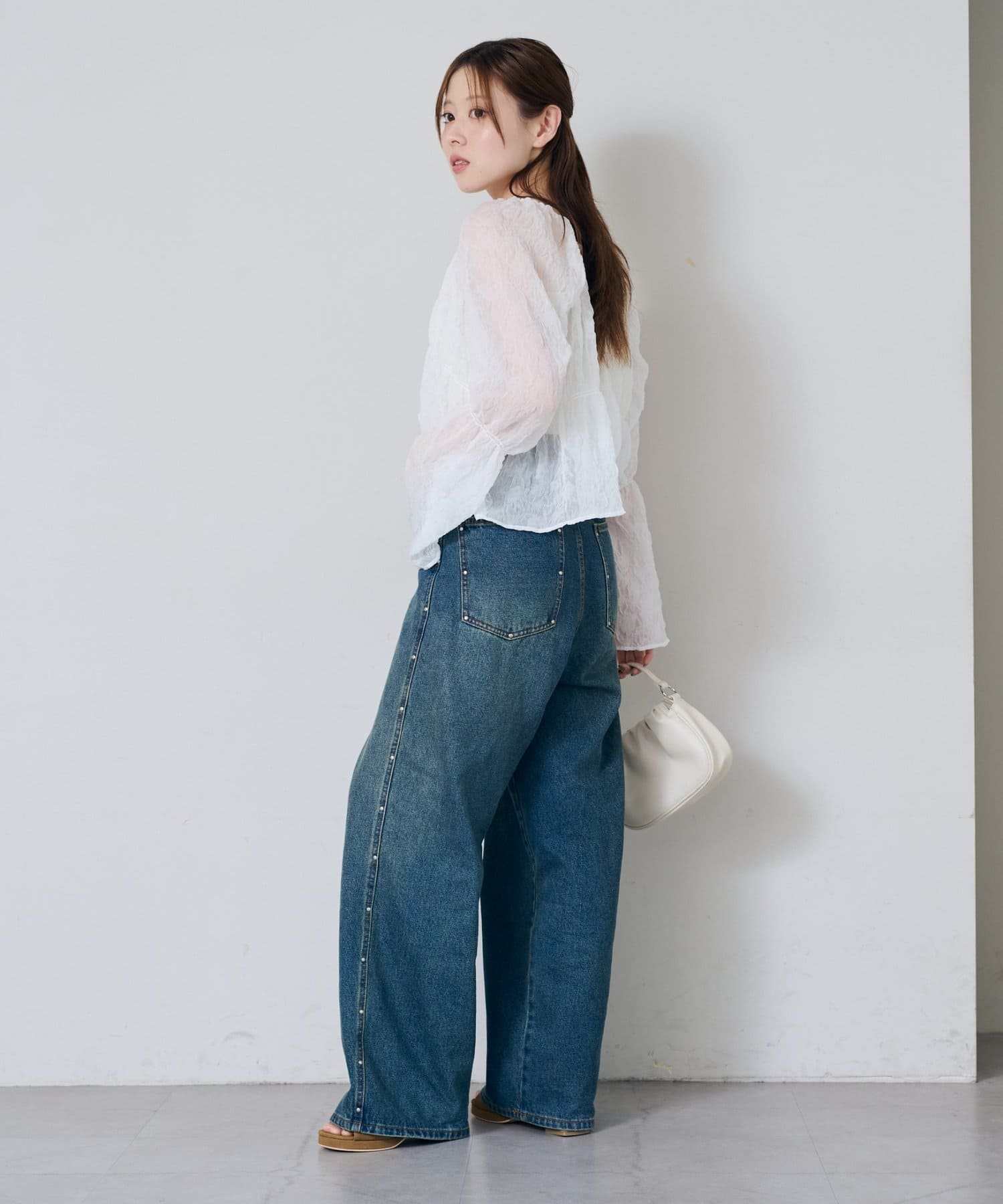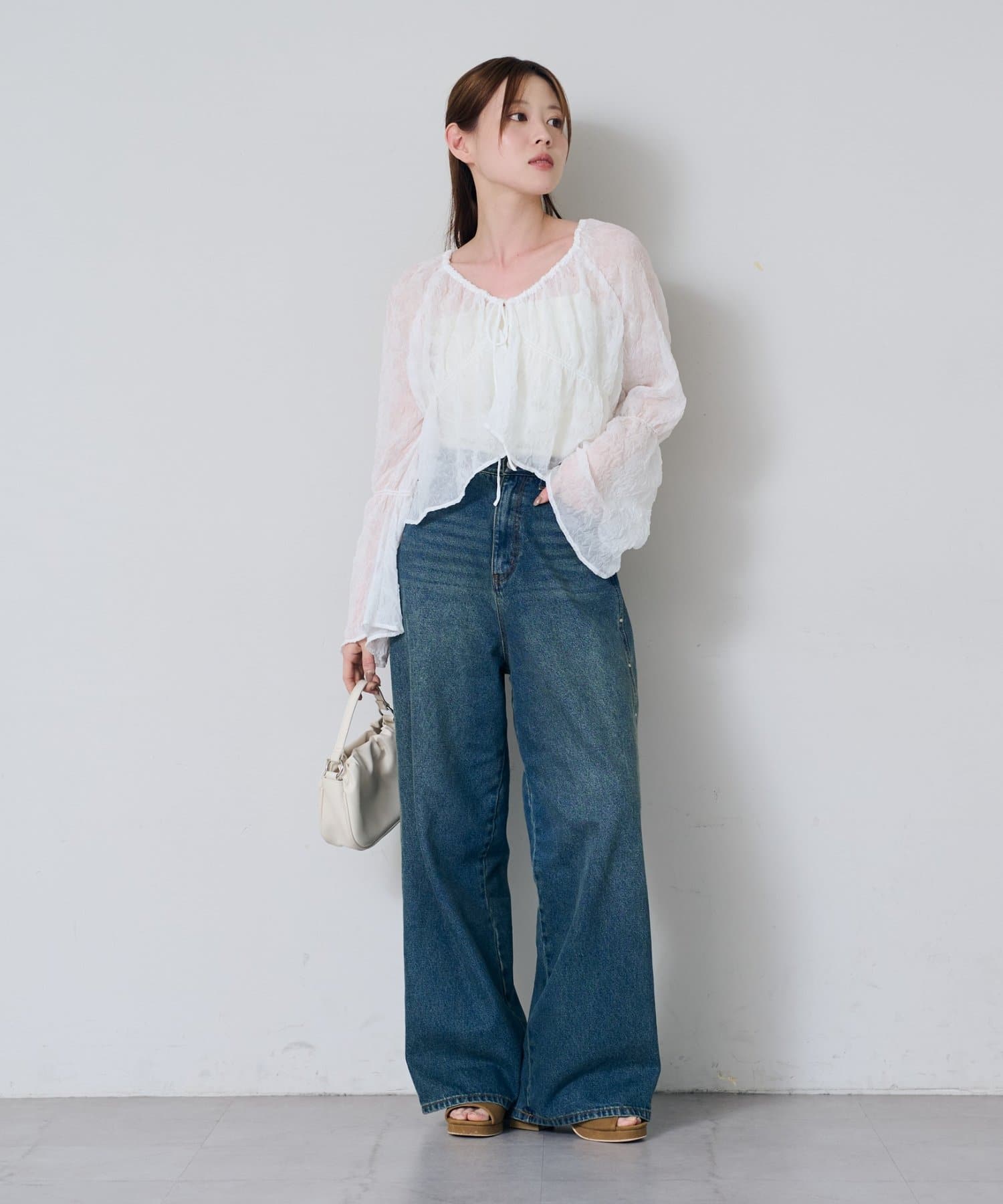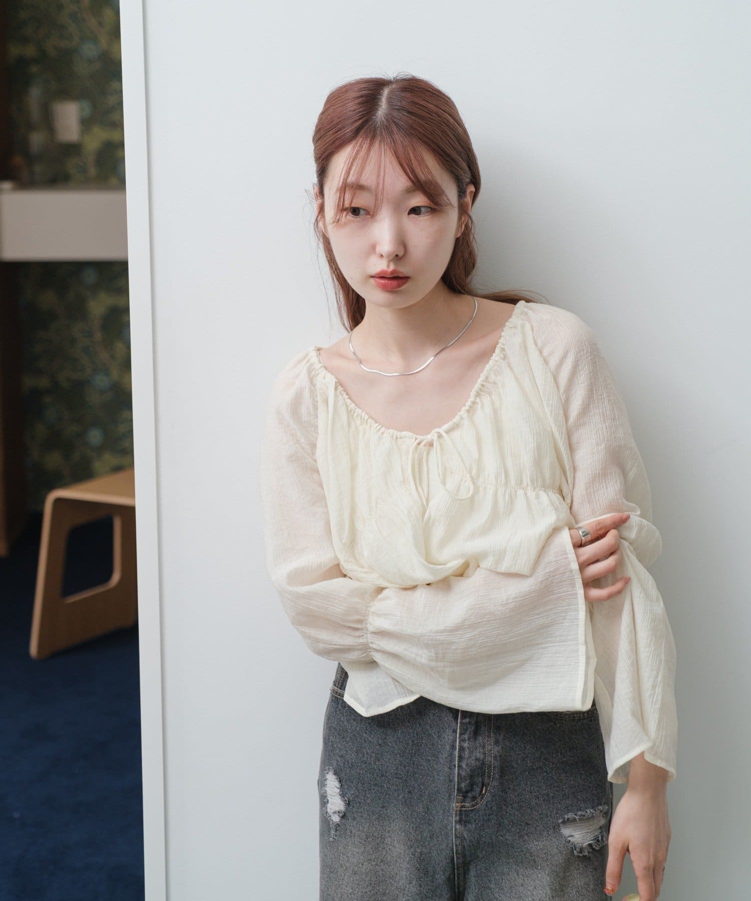 場所によっては冷房が効いて寒いところもあるので、透け感ありながらも腕まくりも出来る長袖ブラウスが活躍しそうです。