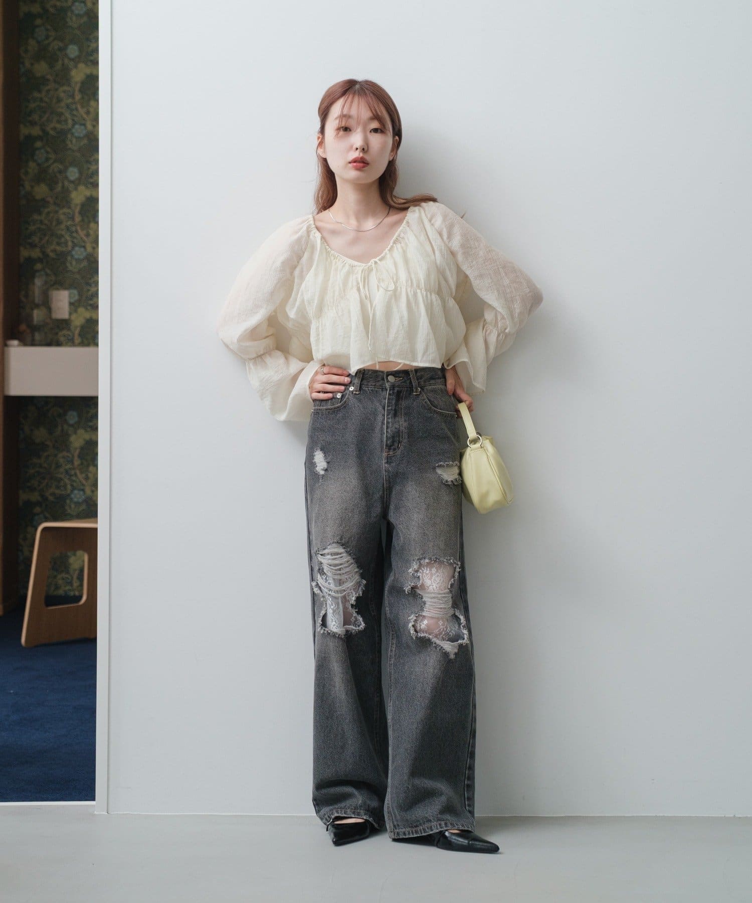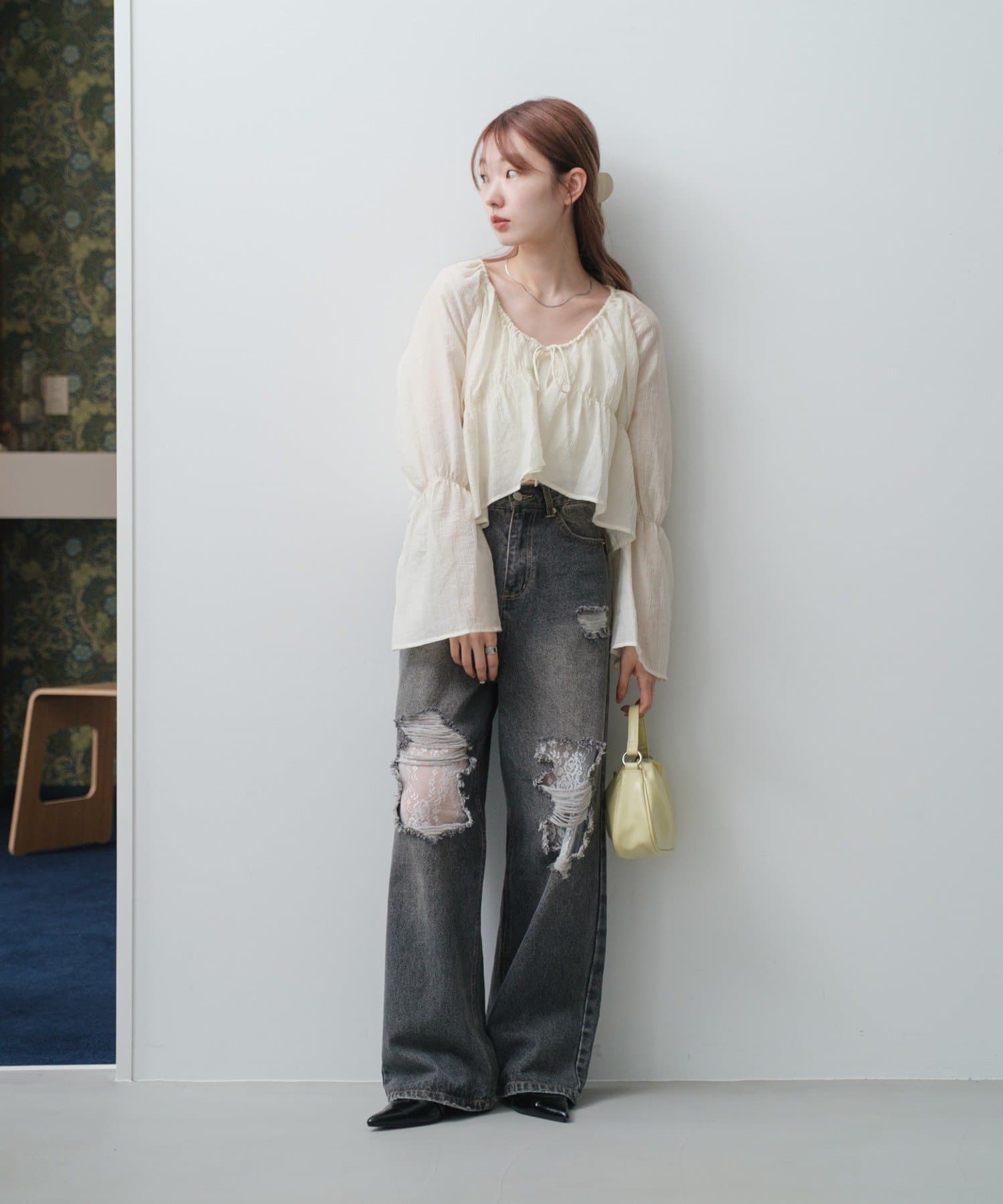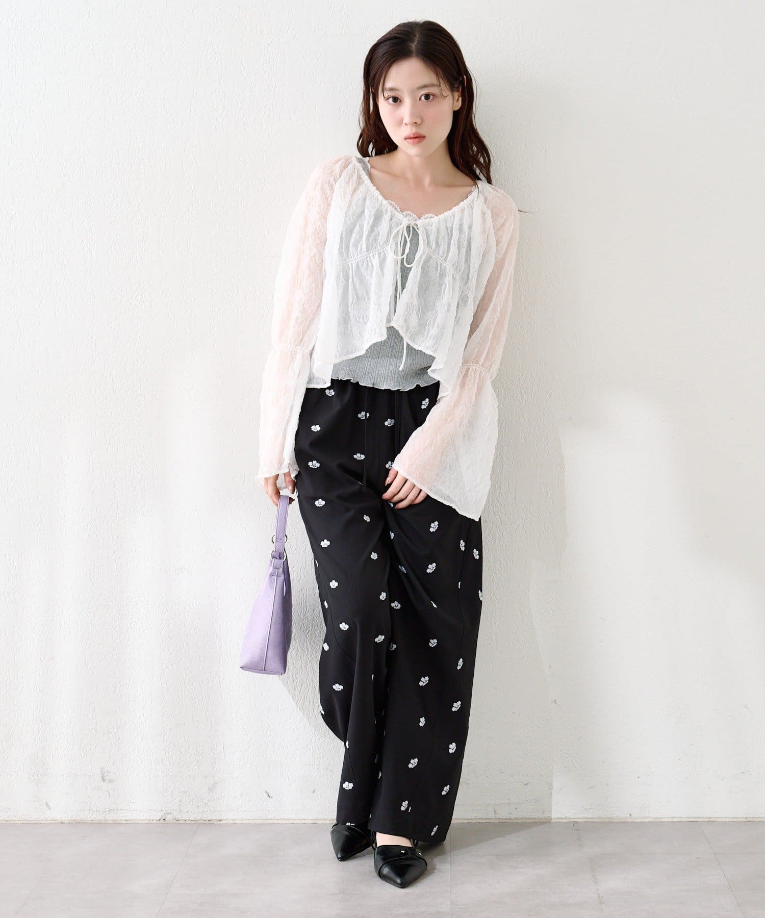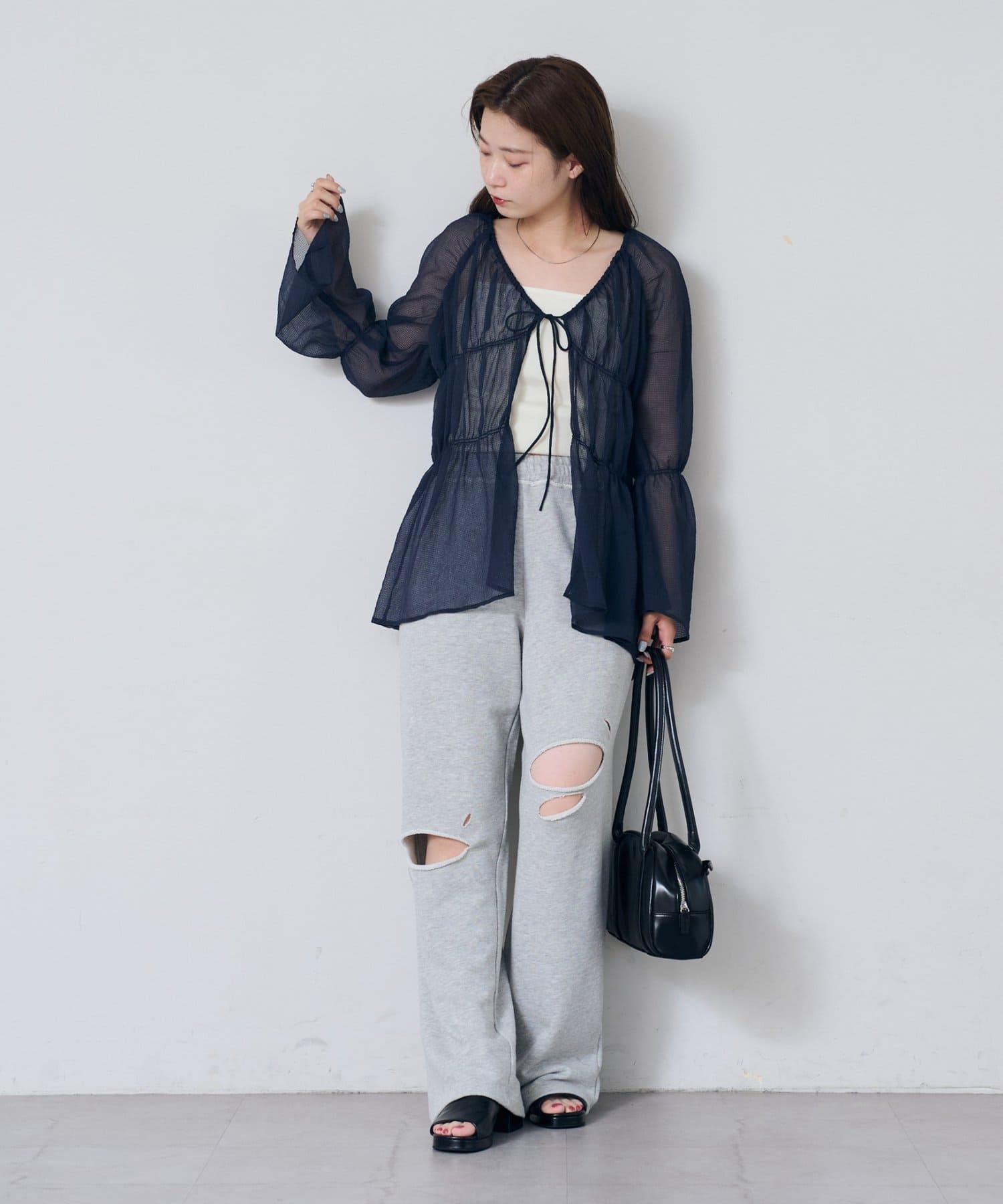 場所によっては冷房が効いて寒いところもあるので、透け感ありながらも腕まくりも出来る長袖ブラウスが活躍しそうです。