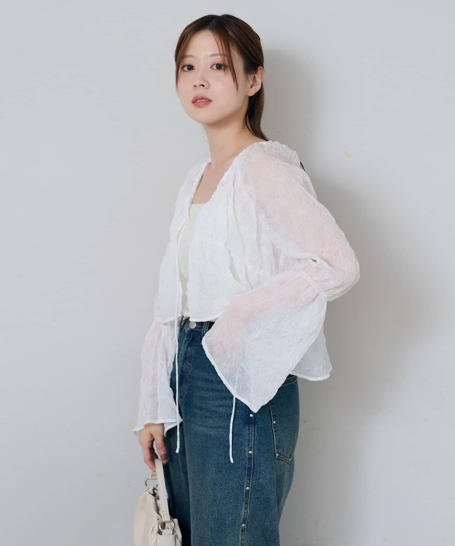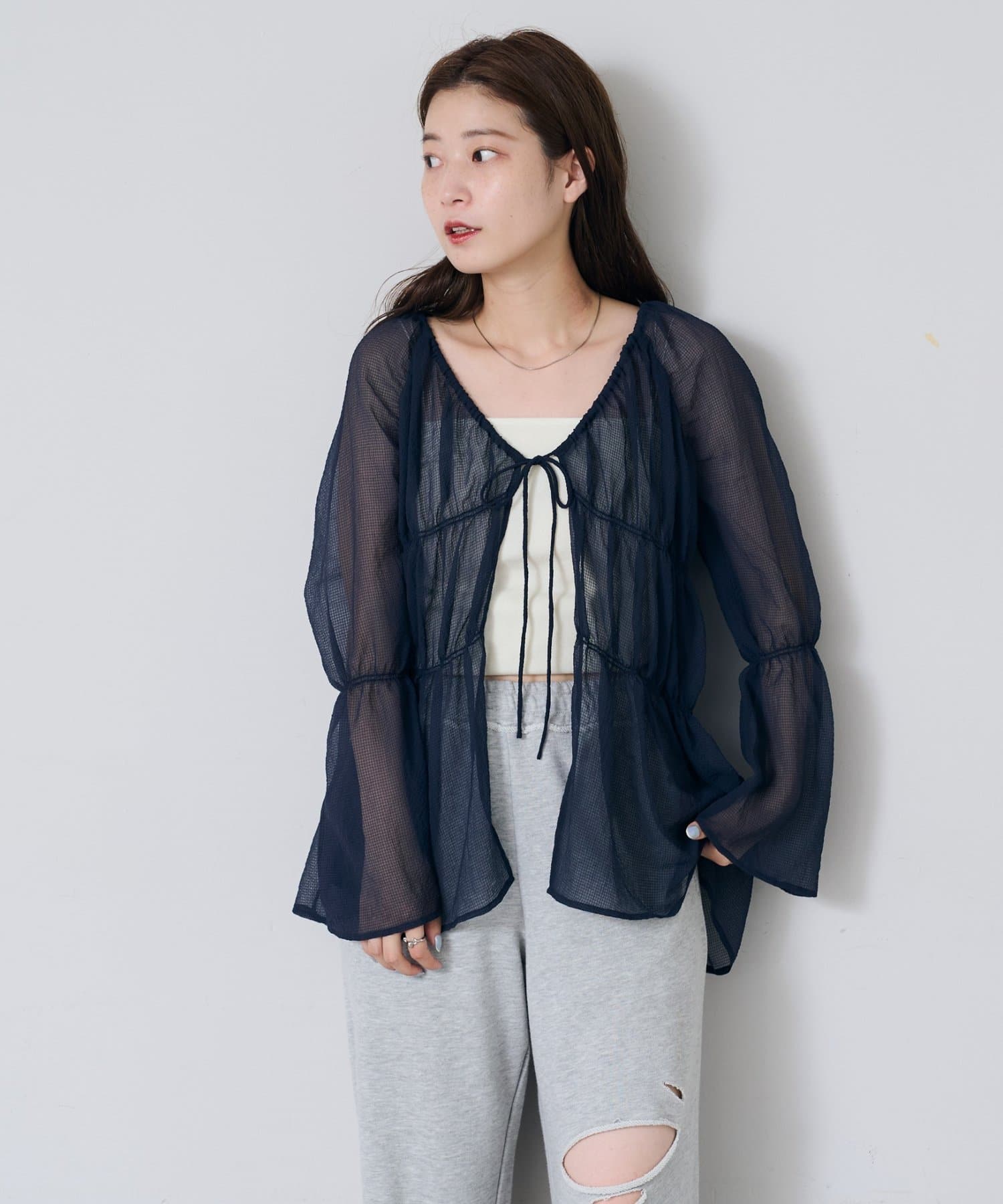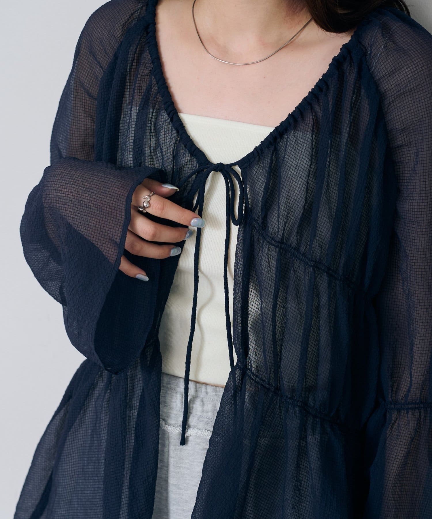 羽織りとしてはもちろん、リボンの結び方でアレンジした着こなしも楽しめます。