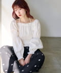 ふんわりとしたボリュームスリーブと、袖口のフリルデザインが柔らかな印象に。