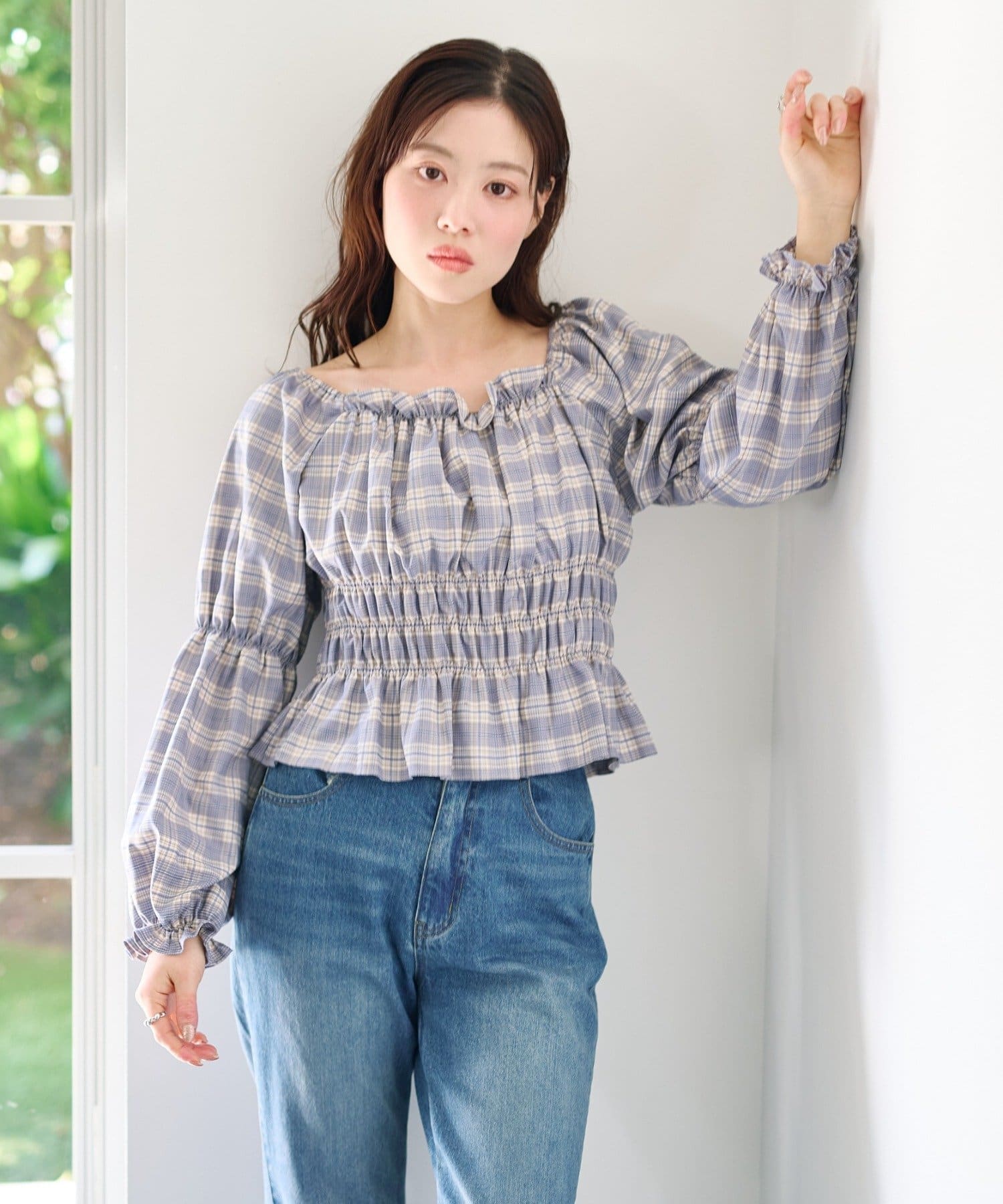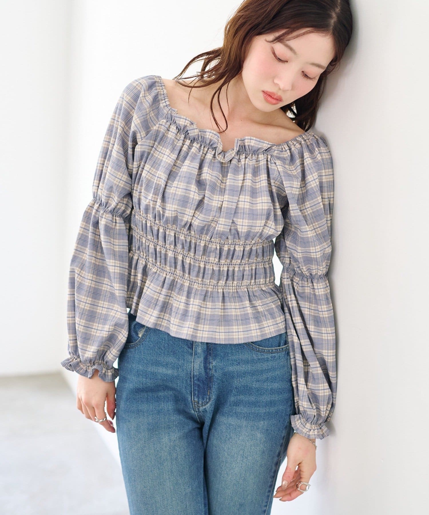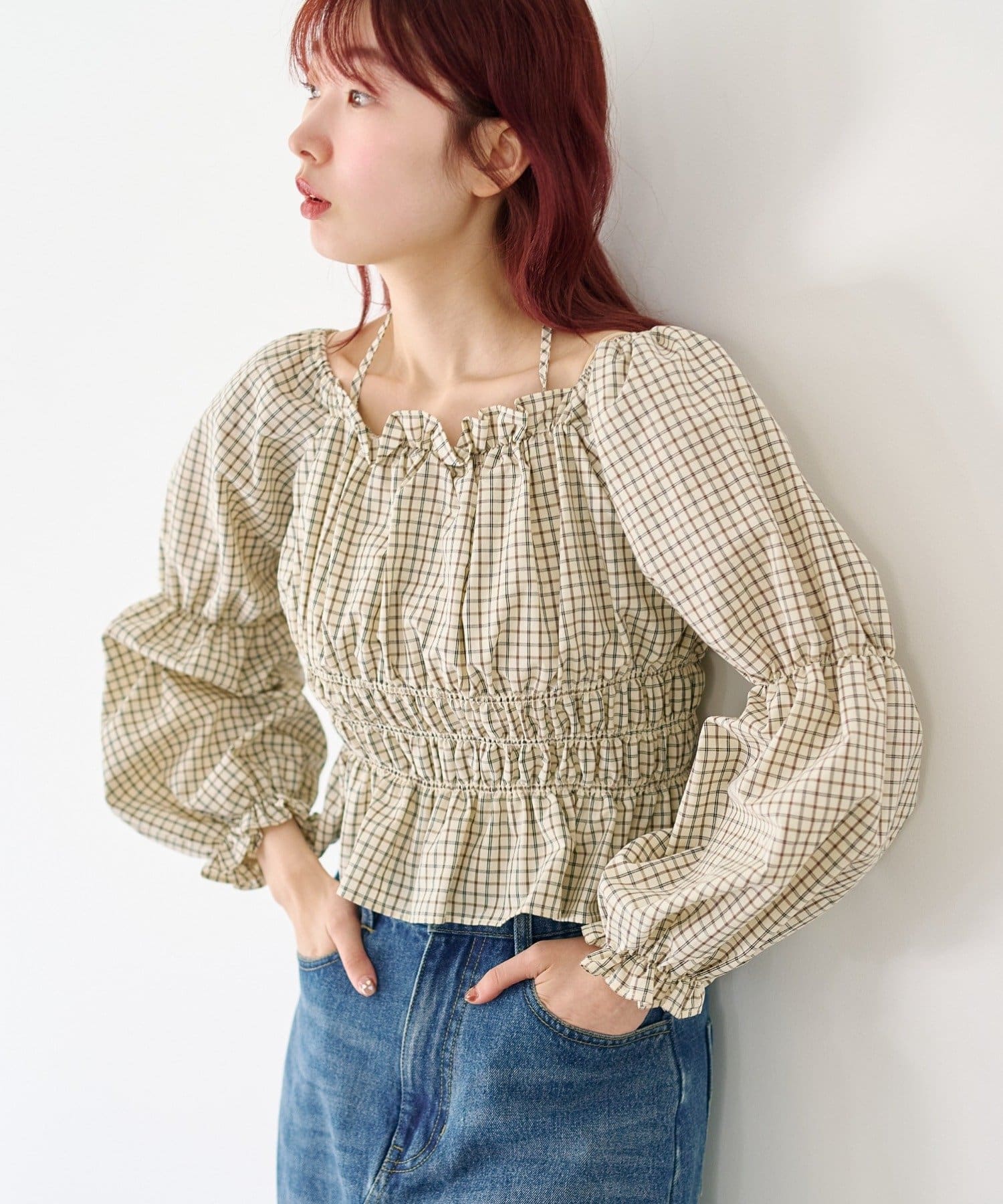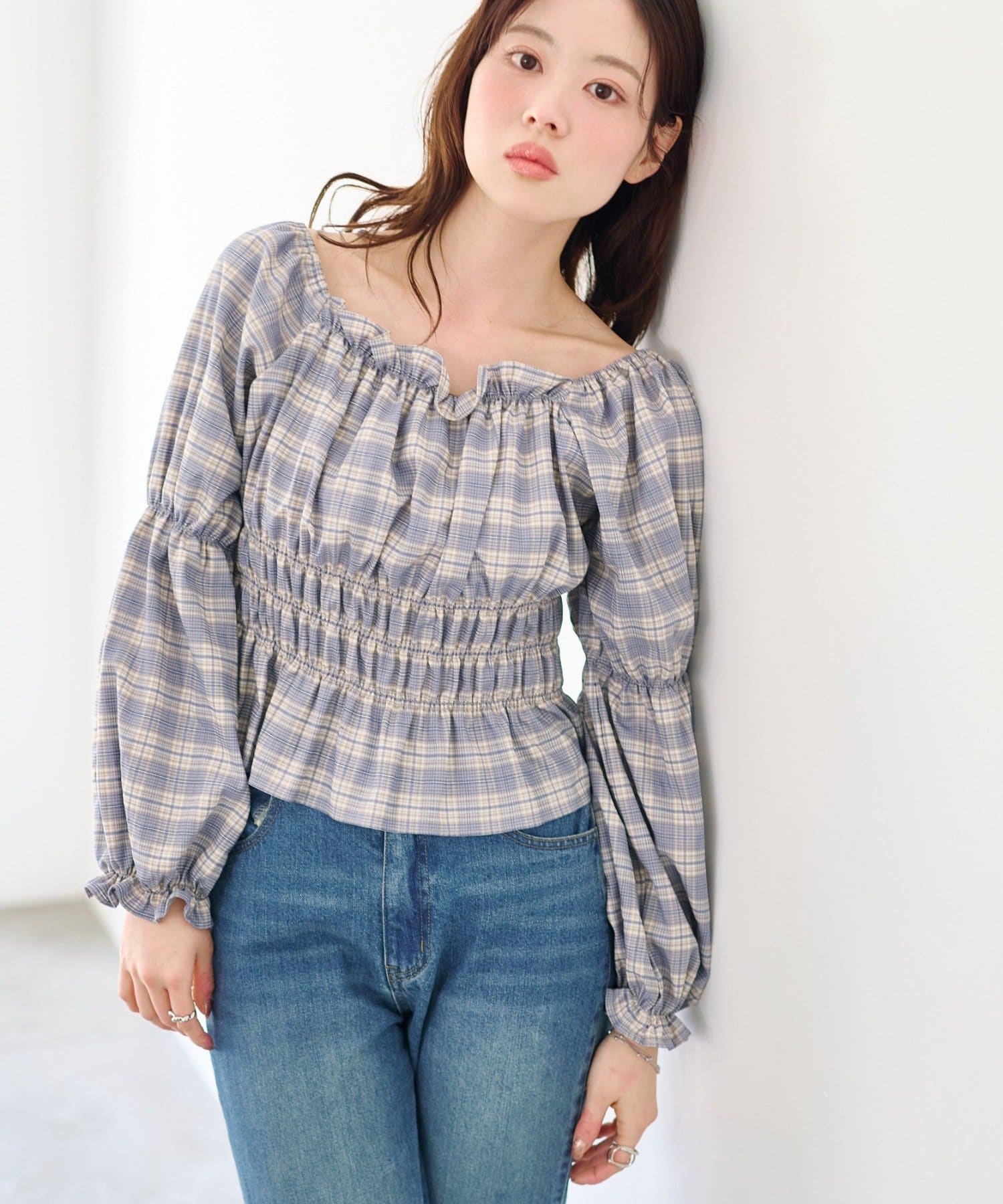 【2.20(金)12:00発売/WEB先行/チェック&無地】シャーリングリボンブラウス